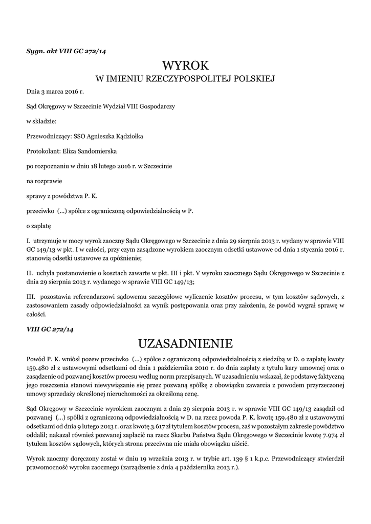 Sygn. akt VIII GC 272/14 WYROK W IMIENIU RZECZYPOSPOLITEJ POLSKIEJ Dnia 3 marca 2016 r. Sąd Okręgowy w Szczecinie Wydział VIII Gospodarczy w składzie: Przewodniczący: SSO Agnieszka Kądziołka Protokolant: Eliza Sandomierska po rozpoznaniu w dniu 18 lutego 2016 r. w Szczecinie na rozprawie sprawy z powództwa P. K. przeciwko (...) spółce z ograniczoną odpowiedzialnością w P. o zapłatę I. utrzymuje w mocy wyrok zaoczny Sądu Okręgowego w Szczecinie z dnia 29 sierpnia 2013 r. wydany w sprawie VIII GC 149/13 w pkt. I w całości, przy czym zasądzone wyrokiem zaocznym odsetki ustawowe od dnia 1 stycznia 2016 r. stanowią odsetki ustawowe za opóźnienie; II. uchyla postanowienie o kosztach zawarte w pkt. III i pkt. V wyroku zaocznego Sądu Okręgowego w Szczecinie z dnia 29 sierpnia 2013 r. wydanego w sprawie VIII GC 149/13; III. pozostawia referendarzowi sądowemu szczegółowe wyliczenie kosztów procesu, w tym kosztów sądowych, z zastosowaniem zasady odpowiedzialności za wynik postępowania oraz przy założeniu, że powód wygrał sprawę w całości. VIII GC 272/14 UZASADNIENIE Powód P. K. wniósł pozew przeciwko (...) spółce z ograniczoną odpowiedzialnością z siedzibą w D. o zapłatę kwoty 159.480 zł z ustawowymi odsetkami od dnia 1 października 2010 r. do dnia zapłaty z tytułu kary umownej oraz o zasądzenie od pozwanej kosztów procesu według norm przepisanych. W uzasadnieniu wskazał, że podstawę faktyczną jego roszczenia stanowi niewywiązanie się przez pozwaną spółkę z obowiązku zawarcia z powodem przyrzeczonej umowy sprzedaży określonej nieruchomości za określoną cenę. Sąd Okręgowy w Szczecinie wyrokiem zaocznym z dnia 29 sierpnia 2013 r. w sprawie VIII GC 149/13 zasądził od pozwanej (...) spółki z ograniczoną odpowiedzialnością w D. na rzecz powoda P. K. kwotę 159.480 zł z ustawowymi odsetkami od dnia 9 lutego 2013 r. oraz kwotę 3.617 zł tytułem kosztów procesu, zaś w pozostałym zakresie powództwo oddalił; nakazał również pozwanej zapłacić na rzecz Skarbu Państwa Sądu Okręgowego w Szczecinie kwotę 7.974 zł tytułem kosztów sądowych, których strona przeciwna nie miała obowiązku uiścić. Wyrok zaoczny doręczony został w dniu 19 września 2013 r. w trybie art. 139 § 1 k.p.c. Przewodniczący stwierdził prawomocność wyroku zaocznego (zarządzenie z dnia 4 października 2013 r.). W piśmie procesowym z dnia 9 grudnia 2013 r. pozwana spółka wniosła o przywrócenie terminu do wniesienia sprzeciwu od wyroku zaocznego. W piśmie wskazała, że przeniosła siedzibę z D. do P., zmiana siedziby wpisana została do KRS w dniu 28 sierpnia 2013 r. Jednocześnie pozwana złożyła sprzeciw od wyroku zaocznego, w którym zaprzeczyła temu, że nie wywiązała się w terminie z obowiązku zawarcia umowy przyrzeczonej ze swojej winy, wskazała natomiast, że nastąpiło to z winy powoda, a dokładniej z tej przyczyny, że powód nie dysponował środkami pozwalającymi na zapłatę ceny, ponadto wcześniej nie potwierdzał proponowanych terminów zawarcia umowy przyrzeczonej. Podniosła również, iż powód ostatecznie zakupił nieruchomość, która miała być przedmiotem umowy przyrzeczonej, przy czym nastąpiło to w lutym 2011 r. od (...) spółka z ograniczoną odpowiedzialnością spółki komandytowej, do której nieruchomość ta została przez pozwaną wniesiona aportem. Zarządzeniem z dnia 10 kwietnia 2014 r. przewodniczący uchylił zarządzenie z dnia 4 października 2013 r. w przedmiocie stwierdzenia prawomocności wyroku zaocznego z uwagi na to, że wyrok został w dniu 29 sierpnia 2013 r. wysłany na adres pozwanej spółki w D., w dniu 4 września 2013 r. doręczyciel podjął próbę doręczenia (awizo), podczas gdy w dniu 28 sierpnia 2013 r. do KRS wpisano nową siedzibę pozwanej w P.. W konsekwencji wobec nieprawidłowości doręczenia wyroku zaocznego dokonanego przesyłką wysłaną w dniu 29 sierpnia 2013 r. zarządzono ponowne doręczenie wyroku zaocznego. W dniu 17 kwietnia 2014 r. dokonano prawidłowego doręczenia pozwanej odpisu wyroku zaocznego, od tej daty rozpoczął bieg termin do złożenia sprzeciwu. Pismem z dnia 24 kwietnia 2014 r. pozwana podtrzymała sprzeciw od wyroku zaocznego złożony w piśmie procesowym z dnia 9 grudnia 2013 r. (a więc przed rozpoczęciem biegu terminu do jego wniesienia). W piśmie przygotowawczym wniesionym dnia 9 sierpnia 2014 r. odnosząc się do treści sprzeciwu od wyroku zaocznego powód zaprzeczył, jakoby z jego winy nie doszło do zawarcia umowy przyrzeczonej. Powołał się na fakt, że w korespondencji z pozwaną oświadczał, iż pasuje mu każdy zaproponowany termin, lecz to pozwana odsuwała termin zawarcia umowy wskazując, że nie zdąży zakończyć spraw związanych z założeniem nowej spółki komandytowej. Powód zaprzeczył wskazywanym przez pozwaną faktom - jakoby nie posiadał wymaganej kwoty na zapłatę ceny. Powoływał się na fakt, że ostatecznie do zawarcia umowy sprzedaży doszło, jednakże z innym podmiotem – spółką komandytową założoną przez pozwaną. Pozwana w piśmie procesowym z dnia 26 sierpnia 2014 r. odniosła się do twierdzeń powoda podniesionych w piśmie z dnia 9 sierpnia 2014 r. zaprzeczając jego twierdzeniom oraz podnosząc, że z przedstawionej korespondencji mailowej wynika, iż to z winy powoda nie zawarto w terminie umowy przyrzeczonej, jak również podnosząc, że w czasie negocjacji poprzedzających zawarcie umowy sprzedaży ze spółką komandytową przyjęła w imieniu pozwanej ustne oświadczenie powoda o zrzeczeniu się roszczeń z tytułu kary umownej. Sąd ustalił następujący stan faktyczny: P. K. prowadzi działalność gospodarczą pod nazwą (...) w D.. Od 2009 r. P. K. negocjował z I. D. i M. D. (1), którzy reprezentowali (...) spółkę z ograniczoną odpowiedzialnością z siedzibą w D., warunki zawarcia umowy, w ramach której zamierzał nabyć od spółki praw