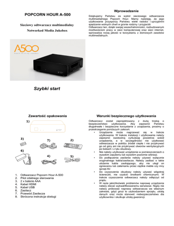 POPCORN HOUR A-500 Sieciowy odtwarzacz multimedialny Networked Media Jukebox Wprowadzenie Dziękujemy Państwu za wybór sieciowego odtwarzacza multimedialnego Popcorn Hour. Mamy nadzieję, że jego użytkowanie przysporzy Państwu wiele radości i uprzyjemni spędzanie wolnych chwil w gronie rodziny i przyjaciół. Odtwarzacz ten, dzięki swojej wszechstronności, rozbudowanym możliwościom pracy w sieci komputerowej oraz sieci internet, wprowadza nową jakość w korzystaniu z domowych zasobów multimedialnych. Szybki start Zawartość opakowania 1. 2. 3. 4. 5. 6. 7. 8. Odtwarzacz Popcorn Hour A-500 Pilot zdalnego sterowania 2 x baterie AAA Kabel HDMI Kabel USB Zasilacz Przewód Zasilacza Skrócona instrukcja obsługi Warunki bezpiecznego użytkowania Odtwarzacz został zaprojektowany z dużą troską o bezpieczeństwo użytkowania. Aby zapewnić Państwu długotrwałe i bezpieczne korzystanie z urządzenia, prosimy o przestrzeganie poniższych zaleceń. • Urządzenie może nagrzewać się w trakcie użytkowania. W trakcie instalacji i użytkowania należy zapewnić swobodną cyrkulację powietrza wokół urządzenia, a w szczególności nie użytkować odtwarzacza w pobliżu źródeł ciepła i nie przykrywać go od góry ani nie przykrywać otworów wentylacyjnych po bokach i z tyłu obudowy. • Nie należy użytkować urządzenia w pomieszczeniach o wysokim zapyleniu lub wysokim poziomie wibracji. • Do podłączenia zasilania należy używać wyłącznie oryginalnego kabla/zasilacza. Należy zadbać o takie ułożenie kabla zasilającego, aby nie uległ on zgnieceniu lub załamaniu przez ciężkie meble czy inny sprzęt AV. • Do czyszczenia obudowy należy używać wilgotnej ściereczki, nie czyścić środkami chemicznymi. W trakcie czyszczenia odtwarzacz należy odłączyć od prądu. • W razie jakichkolwiek problemów naprawę urządzenia należy zlecać wykwalifikowanemu serwisowi. Nigdy nie należy próbować naprawy odtwarzacza we własnym zakresie, gdyż grozi to uszkodzeniem sprzętu, utratą danych oraz może stanowić niebezpieczeństwo dla użytkownika i skutkuje utratą gwarancji. Podłączenie do telewizora kablem HDMI Pilot zdalnego sterowania Podłącz kabel HDMI do odtwarzacza, a następnie podłącz drugi koniec kabla HDMI do gniazda w TV. Pilot do poprawnej pracy wymaga prawidłowo zainstalowanych 2 baterii formatu AAA. Poniżej opis najważniejszych przycisków, NMJ Navigator Aplikacja NMJ Navigator dostępna jest na tablety z systemem Android w wersji 3.2 lub nowszym, oraz na urządzeniaiPad®. NMJ Navigator jest dodatkowym ekranem do twojego odtwarzacza Popcorn Hour A400, który pozwala na łatwe przeglądanie filmów i kolekcji muzyki. Wystarczy uruchomić aplikację, a następnie przeglądać i odtwarzać swoje ulubione media na A400 za pomocą tabletu. Dzięki aplikacji NMJ Navigator możesz słuchać muzyki na swoim systemie audio bez włączania telewizora. Program pozwoli Ci na dostęp do zasobów odtwarzacza lub dysków sieciowych skatalogowanych za pomocą interfejsu Networked Media Jukebox. UWAGA! Tablet musi znajdować się w tej samej sieci lokalnej co odtwarzacz. NMJ Navigator dostępny jest w Google Play, oraz AppStore. Pilot zdalnego sterowania cd. ETURN – pozwala wrócić do poprzedniego ekranu/menu. Nie jest aktywny podczas odtwarzania. SOURCE – powrót do głównego menu odtwarzacza. Przy pracy w rozdzielczościach SD przełącza cyklicznie źródła danych: serwisy sieciowe i internetowe - zasoby i dyski lokalne. Kursor góra/dół – pozwala na zmianę podświetlania opcji menu, plików w katalogach itd. Podczas przeglądania zdjęć przesuwa zdjęcie w górę/dół. Kursor lewo/prawo – pozwala na zmianę menu opcji, przejście z opcji dostępnych po prawej stronie ekranu na lewo i odwrotnie. Podczas odtwarzania materiału wideo włącza opcję częściowego przewijania materiału wg czasu. W rogu ekranu pokazuje się bieżący czas odtwarzania, korzystając z przycisków kursora prawo/lewo można przeskakiwać o wielokrotność 30 sekund w przód lub w tył. Podczas oglądania zdjęć kursor pozwala na przesuwanie zdjęcia w lewo/prawo ENTER – zatwierdzanie/wybór opcji – w zależności od kontekstu. Rozpoczęcie odtwarzania wskazanego, pojedynczego pliku (po zakończeniu następny plik nie zostanie odtworzony jak po użyciu przycisku PLAY). Podłączenie do zasilania Połącz zasilacz z kablem zasilającym, następnie podłącz wtyczkę zasilacza do odtwarzacza, a wtyczkę kabla zasilającego do prądu. Wciśnięcie dowolnego klawisza powoduje uruchomienie białego podświetlenia, które wyłącza się automatycznie po upływie kilku sekund. POWER - czerwony przycisk na szczycie pilota służy do usypiania, wyłączania i włączania odtwarzacza. Krótkie naciśniecie przy włączonym odtwarzaczu przestawia go w tryb stand-by, w którym złącza audio/wideo zostają wyłączone, natomiast praca aplikacji NMT (aktywność sieciowa) pozostaje nieprzerwana. Naciśnięcie przycisku włącznika na 4-5 sekund powoduje całkowite wyłączenie urządzenia (alternatywnie POWER+DELETE). TV MODE – pozwala na szybką zmianę parametrów wyjścia wideo; opis opcji znajduje się w rozdziale Szybkie ustawianie trybów wideo na str.2. SETUP – otwiera menu Ustawień odtwarzacza. Podczas odtwarzania plików wideo pozwala na ustawienie jasności, kontrastu itd. Jeśli menu ustawień zostanie zablokowane odblokowanie możliwe jest poprzez wciśnięcie kombinacji klawiszy SETUP-PLAY. 1 2 3… Przyciski numeryczne, podczas przeglądania listy plików i folderów pozwalają na szybki dostęp do pliku przez podanie numeru. W polach edycyjnych przyciski pozwalają na wprowadzanie znaków alfanumerycznych, w analogiczny sposób jak w telefonach komórkowych. Przycisk DELETE kasuje ostatnio wprowadzony znak, przycisk CAPS/NUM pozwala na przełączanie dużych/małych liter i liter/cyfr. Użycie przycisku Enter na polach edycyjnych otwiera okno