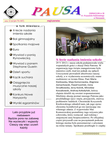 GIMNAZJUM nr 36 im. Krzysztofa Kieślowskiego w Warszawie cena: (w tym 7% VAT) maj/czerwiec w tym miesiącu... X-lecie nadania imienia szkole Bal gimnazjalny Spotkania majowe Euro Wywiad z panią Rynowiecką Wywiad z panem Stephane Guerin Dzień sportu Kącik suchara Osiągnięcia muzyczne naszej szkoły Konkurs Nowe Horyzonty Wyniki egzaminów Lato przyjdzie już niebawem Będzie pora na zabawę Na wycieczki i wyjazdy Cieszy się więc uczeń każdy X-lecie nadania imienia szkole 29 V 2012 r. nasza szkoła podejmowała wielu wspaniałych gości z okazji Dnia Patrona. W organizację tego święta zaangażowane było mnóstwo osób, trud ten jednak się opłacił. Uroczystość prowadzili absolwenci naszej szkoły, a w wydarzeniu uczestniczyły znane osobistości ze świata filmu: Pani Maria Kieślowska, Maja Komorowska, Zbigniew Zamachowski, Paweł Łoziński, Irena Strzałkowska, Jerzy Kośnik, Mirosław Kossakowski, Andrzej Kołodyński, którzy chętnie dzielili się swoimi wspomnieniami. Mieliśmy okazję poznać naszego Patrona jako przykładnego ojca i męża, przyjaciela, znawcę problemów ludzkich. Chrześniak Krzysztofa Kieślowskiego zdradził nam, jak jego ojciec chrzestny kształtował go nie narzucając mu własnego zdania. Z wypowiedzi Mai Komorowskiej poznaliśmy tego reżysera jako człowieka, który roztaczał nad rodziną i znajomymi aurę bezpieczeństwa. Po oficjalnej części przyszedł czas na poczęstunek podczas którego można było porozmawiać z artystami na różne tematy. Spotkanie przebiegło w ciepłej atmosferze, nie zabrakło łez wzruszenia i gromkiego śmiechu. JESTEŚMY DUMNI, ŻE MAMY TAKIEGO PATRONA Weronika Martyniuk 3c Bal gimnazjalny Panie i Panowie, poloneza czas zacząć! Dnia 1 czerwca o godzinie 17:00 wszyscy zebrani w Sali konferencyjnej mogli podziwiać naszych 3-cioklasistów i ich interpretację poloneza. Stroje były piękne, muzyka również, a panowała atmosfera ogólnej zabawy i zadowolenia. Gdy tylko muzyka ucichła , pani Dyrektor wygłosiła krótką mowę i zaczął się bal. Wspaniałe dekoracje dopełnione tanecznymi kawałkami idealnie uchwyciły tegoroczny temat „Miasto nocą” i nastroiły całe towarzystwo do zabawy. A gdy tylko się zmęczyliśmy , mogliśmy odpocząć i coś przegryźć w stołówce, dzięki pysznemu cateringowi. Wszystko razem wzięte sprawiło, że bawiliśmy się do samego końca imprezy, za co serdecznie dziękujemy. Patrycja Smolińska 3c wzruszającą historię i odpowiedziała na wszystkie nasze pytania odnośnie tamtych czasów. Pan Górecki wzbudził wielkie zainteresowanie naszych uczniów opowiadając nam o swojej pracy jako korespondent z miejsc trudnych. Mówił on o sytuacjach , gdy musiał radzić sobie z m.in. konfliktami międzynarodowymi, a nawet w czasie zagrożenia życia. Pan Morozowski zdradzał nam tajniki pracy dziennikarza zajmującego się polityką, jednocześnie wspominając swoją drogę dziennikarską. Porównywał również pracę w redakcji telewizyjnej i radiowej. Patrycja Smolińska Euro Polsko wpadnij w piłkoszał ! Codziennie idąc do szkoły widzimy reklamy propagujące Euro. Niestety dla nas ,Polaków, Euro się kończy na fazie grupowej , lecz to nie oznacza ,że nie powinniśmy dopingować innych i czuć atmosferę mistrzostw . Największymi pretendentami do zdobycia pucharu są Niemcy oraz Hiszpania . Więc dopingujmy nasze ulubione drużyny a jako Polacy pokażmy się jako dobrzy gospodarze !!! Albert Ciółkowski 3c Spotkania Majowe W dniach 24 i 28 maja mieliśmy przyjemność gościć w naszej szkole trzy wyjątkowe osoby: panią Batszewę Dagan, pana Piotra Góreckiego oraz pana Andrzeja Morozowskiego. Pani Batszewa jest poetką,byłą więźniarką Auschwitz, poruszającą temat okupacji niemieckiej, którą sama przeżyła. Podczas ponad dwugodzinnego spotkania opowiedziała nam swoją niezwykle Wywiad z panią Anną Rynowiecką Wywiad z panem Stephane Guerin Czy lubi pani swoją pracę? Bardzo lubię swoją pracę. Nauczanie daje mi dużą satysfakcję, szczególnie gdy są efekty w postaci dobrych ocen moich uczniów. Czy podoba się pani nasza szkoła? Gimnazjum nr 36 jest szkołą, w której panuje przyjazna atmosfera, chętnie przychodzi się do pracy. Czy lubi pan swoją pracę? Oczywiście. Bardzo lubię pracować z młodzieżą, przekazywać im swoją wiedzę, a przy tym mówić w swoim języku ojczystym. Jakie są wady i zalety bycia nauczycielem? Pracując w szkole posiadam kontakt z młodym pokoleniem. Nauczam, ale również ja uczę się od uczniów radości, spontaniczności, wiary w człowieka. Wadą pracy w szkole jest nadmiar decybeli na przerwach. Ulubione zajęcie, hobby? Moim ulubionym zajęciem jest czytanie książek, szczególnie biografii. Gdy tylko mam czas, nadrabiam zaległości w lekturze. Co chciałaby pani przekazać naszym uczniom? Wszystkim uczniom chciałabym przekazać, by w życiu kierowali się wartościami dobra, szacunku dla drugiego człowieka, a przede wszystkim próbować nie mieć, lecz być. Wywiad z Panią Rynowiecką i Stefano przeprowadziła Dominika Budkus 3c Czy podoba się panu nasza szkoła? Nie jest to pierwsza szkoła, w której uczę. Każda z nich ma swoje wady i zalety. Plusem w tej szkole jest fakt, że grono pedagogiczne jest sympatyczne. To ważne pracować z ludźmi, których się ceni i lubi. Jakie są wady i zalety bycia nauczycielem? Zdarza się, że czasem uczniowie nie doceniają mojego wysiłku. Często się krytykuje pracę nauczyciela. Z drugiej strony jest wielka satysfakcja, kiedy moi uczniowie odnoszą sukcesy po egzaminach czy olimpiadach językowych. Ulubione zajęcia, hobby? Podróżowanie, sport (piłka nożna, tenis) Co chciałby pan przekazać naszym uczniom? Chciałbym im przekazać swoją pasję językową oraz zainteresować ich Francją i jej kulturą. Dzień sportu W czwartek 21 czerwca w naszej szkole odbył się dzień sportu. Podczas, którego klasy zmierzyły się w zawod