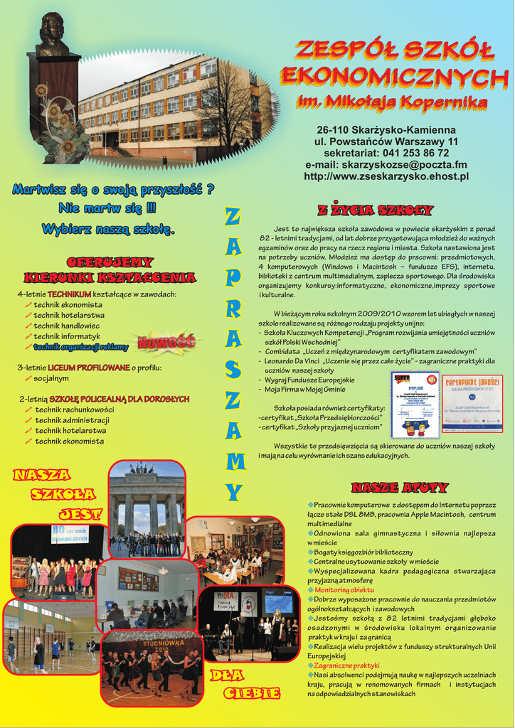 26-110 Skar¿ysko-Kamienna ul. Powstañców Warszawy 11 sekretariat: 041 253 86 72 e-mail: [email protected] http://www.zseskarzysko.ehost.pl Martwisz siê o swoj¹ przysz³oœæ ? Nie martw siê !!! Wybierz nasz¹ szko³ê. OFERUJEMY KIERUNKI KSZTA£CENIA 4-letnie TECHNIKUM kszta³c¹ce w zawodach: $ technik ekonomista $ technik hotelarstwa $ technik handlowiec $ technik informatyk technik organizacji reklamy $ 3-letnie LICEUM PROFILOWANE o profilu: $ socjalnym 2-letni¹ SZKO£Ê POLICEALN¥ DLA DOROS£YCH $ technik rachunkowoœci $ technik administracji $ technik hotelarstwa $ technik ekonomista NASZA SZKOLA Z A P R A S Z A M Y Z ZYCIA SZKO£Y Jest to najwiêksza szko³a zawodowa w powiecie skar¿yskim z ponad 82 - letnimi tradycjami, od lat dobrze przygotowuj¹ca m³odzie¿ do wa¿nych egzaminów oraz do pracy na rzecz regionu i miasta. Szko³a nastawiona jest na potrzeby uczniów. M³odzie¿ ma dostêp do pracowni: przedmiotowych, 4 komputerowych (Windows i Macintosh – fundusze EFS), internetu, biblioteki z centrum multimedialnym, zaplecza sportowego. Dla œrodowiska organizujemy konkursy:informatyczne, ekonomiczne,imprezy sportowe i kulturalne. W bie¿¹cym roku szkolnym 2009/2010 wzorem lat ubieg³ych w naszej szkole realizowane s¹ ró¿nego rodzaju projekty unijne: - Szko³a Kluczowych Kompetencji „Program rozwijania umiejêtnoœci uczniów szkó³ Polski Wschodniej” - Combidata „Uczeñ z miêdzynarodowym certyfikatem zawodowym” - Leonardo Da Vinci „Uczenie siê przez ca³e ¿ycie” - zagraniczne praktyki dla uczniów naszej szko³y - Wygraj Fundusze Europejskie - Moja Firma w Mojej Gminie Szko³a posiada równie¿ certyfikaty: -certyfikat „Szko³a Przedsiêbiorczoœci” - certyfikat „Szko³y przyjaznej uczniom” Wszystkie te przedsiêwziêcia s¹ skierowane do uczniów naszej szko³y i maj¹ na celu wyrównanie ich szans edukacyjnych. JEST DLA CIEBIE NASZE ATUTY Pracownie komputerowe z dostêpem do Internetu poprzez ³ ³¹cze sta³e DSL 8MB, pracownia Apple Macintosh, centrum multimedialne Odnowiona sala gimnastyczna i si³ownia najlepsza ³ w mieœcie Bogaty ksiêgozbiór biblioteczny ³ Centralne usytuowanie szko³y w mieœcie ³ Wyspecjalizowana kadra pedagogiczna stwarzaj¹ca ³ przyjazn¹ atmosferê Monitoring obiektu ³ Dobrze wyposa¿one pracownie do nauczania przedmiotów ³ ogólnokszta³c¹cych i zawodowych Jesteœmy szko³¹ z 82 letnimi tradycjami g³êboko ³ osadzonymi w œrodowisku lokalnym organizowanie praktyk w kraju i za granic¹ Realizacja wielu projektów z funduszy strukturalnych Unii ³ Europejskiej Zagraniczne praktyki ³ Nasi absolwenci podejmuj¹ naukê w najlepszych uczelniach ³ kraju, pracuj¹ w renomowanych firmach i instytucjach na odpowiedzialnych stanowiskach