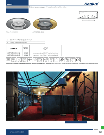 AKRA CT Sufitowa oprawa ozdobna / Decorative ceiling lighting fitting 4,5 min 100 Ø65÷75 Ø82 AKRA CT-DS14PS/N AKRA CT-DS14SN/G obudowa: odlew stopu aluminium casing: aluminum alloy cast AKRA CT-DS14PS/N 04785 perłowo srebrny/nikiel / pearl silver/nickel AKRA CT-DS14SN/G 04786 satynowy nikiel/złoty / satin nickel/gold 2 x 0,75mm2 max 50 12 cm 0,5 20 1/-/50 54 składa się z korpusu i wkładki dekoracyjnej, zastępującej tradycyjną sprężynę / it is composed of a body and a decorative insert which replaces a traditional spring www.kanlux.com 165