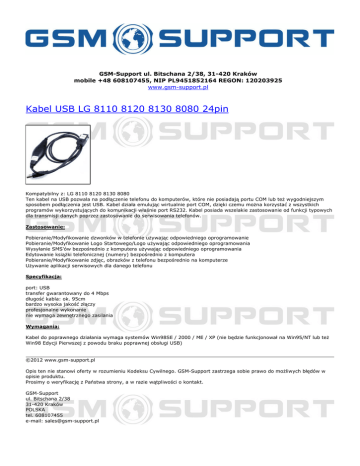 GSM-Support ul. Bitschana 2/38, 31-420 Kraków mobile +48 608107455, NIP PL9451852164 REGON: 120203925 www.gsm-support.pl Kabel USB LG 8110 8120 8130 8080 24pin Kompatybilny z: LG 8110 8120 8130 8080 Ten kabel na USB pozwala na podłączenie telefonu do komputerów, które nie posiadają portu COM lub też wygodniejszym sposobem podłączenia jest USB. Kabel działa emulując wirtualnie port COM, dzięki czemu można korzystać z wszystkich programów wykorzystujących do komunikacji właśnie port RS232. Kabel posiada wszelakie zastosowanie od funkcji typowych dla transmisji danych poprzez zastosowanie do serwisowania telefonów. Zastosowanie: Pobieranie/Modyfikowanie dzwonków w telefonie używając odpowiedniego oprogramowanie Pobieranie/Modyfikowanie Logo Startowego/Logo używając odpowiedniego oprogramowania Wysyłanie SMS'ów bezpośrednio z komputera używając odpowiedniego oprogramowania Edytowanie książki telefonicznej (numery) bezpośrednio z komputera Pobieranie/Modyfikowanie zdjęc, obrazków z telefonu bezpośrednio na komputerze Używanie aplikacji serwisowych dla danego telefonu Specyfikacja: port: USB transfer gwarantowany do 4 Mbps długość kabla: ok. 95cm bardzo wysoka jakość złączy profesjonalne wykonanie nie wymaga zewnętrznego zasilania Wymagania: Kabel do poprawnego działania wymaga systemów Win98SE / 2000 / ME / XP (nie będzie funkcjonował na Win95/NT lub też Win98 Edycji Pierwszej z powodu braku poprawnej obsługi USB) ©2012 www.gsm-support.pl Opis ten nie stanowi oferty w rozumieniu Kodeksu Cywilnego. GSM-Support zastrzega sobie prawo do możliwych błędów w opisie produktu. Prosimy o weryfikację z Państwa strony, a w razie wątpliwości o kontakt. GSM-Support ul. Bitschana 2/38 31-420 Kraków POLSKA tel. 608107455 e-mail: [email protected] Powered by TCPDF (www.tcpdf.org)