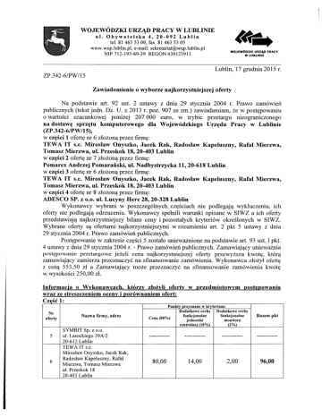 WOJEWÓDZKI URZĄD PRACY W LUBLINIE ul. O b y w a t e l s k a 4, 20-092 L u b l i n tel. 81 463 53 00, fax 81 463 53 05 www.wup.lublin.pl, e-mail: [email protected] NIP 712-193-69-39 REGON 430123913 WOJEWÓDZKI URZĄD PRACY W LUBLINIE Lublin, 17 grudnia 2015 r. ZP.342-6/PW/15 Zawiadomienie o wyborze najkorzystniejszej oferty Na podstawie art. 92 ust. 2 ustawy z dnia 29 stycznia 2004 r. Prawo zamówień publicznych (tekst jedn. Dz. U. z 2013 r. póz. 907 ze zm.) zawiadamiam, że w postępowaniu o wartości szacunkowej poniżej 207 000 euro, w trybie przetargu nieograniczonego na dostawę sprzętu komputerowego dla Wojewódzkiego Urzędu Pracy w Lublinie (ZP.342-6/PW/15), w części l ofertę nr 6 złożoną przez firmę: TEWA IT s.c. Mirosław Onyszko, Jacek Rak, Radosław Kapeluszny, Rafał Mierzwa, Tomasz Mierzwa, ul. Przeskok 18,20-403 Lublin w części 2 ofertę nr 7 złożoną przez firmę: Pomarex Andrzej Pomarański, ul. Nadbystrzycka 11,20-618 Lublin w części 3 ofertę nr 6 złożoną przez firmę: TEWA IT s.c. Mirosław Onyszko, Jacek Rak, Radosław Kapeluszny, Rafał Mierzwa, Tomasz Mierzwa, ul. Przeskok 18,20-403 Lublin w części 4 ofertę nr 8 złożoną przez firmę: ADESCO SP. z o.o. ul. Lucyny Herc 28, 20-328 Lublin Wykonawcy wybrani w poszczególnych częściach nie podlegają wykluczeniu, ich oferty nie podlegają odrzuceniu. Wykonawcy spełnili warunki opisane w SIWZ a ich oferty przedstawiają najkorzystniejszy bilans ceny i pozostałych kryteriów określonych w SIWZ. Wybrane oferty są ofertami najkorzystniejszymi w rozumieniu art. 2 pkt 5 ustawy z dnia 29 stycznia 2004 r. Prawo zamówień publicznych. Postępowanie w zakresie części 5 zostało unieważnione na podstawie art. 93 ust. l pkt. 4 ustawy z dnia 29 stycznia 2004 r. - Prawo zamówień publicznych. Zamawiający unieważnia postępowanie przetargowe jeżeli cena najkorzystniejszej oferty przewyższa kwotę, którą zamawiający zamierza przeznaczyć na sfinansowanie zamówienia. Wykonawca złożył ofertę z ceną 553,50 zł a Zamawiający może przeznaczyć na sfinansowanie zamówienia kwotę w wysokości 250,00 zł. Informacja o Wykonawcach, którzy złożyli oferty w przedmiotowym postępowaniu wraz ze streszczeniem oceny i porównaniem ofert: Część 1; Nr oferty 5 6 Nazwa firmy, adres SYMBIT Sp. z o.o. ul. Lasockiego 3 9 A/2 20-6 12 Lublin TEWA IT s.c. Mirosław Onyszko, Jacek Rak, Radosław Kapeluszny, Rafał Mierzwa, Tomasz Mierzwa ul. Przeskok 18 20-403 Lublin Punkty przyznane w kryterium: Dodatkowe cechy Dodatkowe cechy funkcjonalne funkcjonalne Cena (80%) jednostki monitora centralnej (18%) (2%) 80,00 14,00 2,00 Razem pkt 96,00 7 8 Pomarex Andrzej Pomarański ul. Nadbystrzycka 1 1 20-6 18 Lublin ADESCO SP. z o.o. ul. Lucyny Herc 28 20-328 Lublin 74,48 Część 2 Nr oferty 1 6 7 8 Nazwa firmy, adres „Syriana" Joanna Fischer ul. Kazimierza Porębskiego 28/17 80-180 Gdańsk TEWA IT s.c. Mirosław Onyszko, Jacek Rak, Radosław Kapeluszny, Rafał Mierzwa, Tomasz Mierzwa ul. Przeskok 18 20-403 Lublin Pomarex Andrzej Pomarański ul. Nadbystrzycka 1 1 20-618 Lublin ADESCO SP. z o.o. ul. Lucyny Herc 28 20-328 Lublin Część 3: Nr oferty 3 4 6 8 Nazwa firmy, adres Fast Group Sp. z o.o. Al. 3 Maja 12 00-391 Warszawa AG IT PROJECT S.C. Osowna 23 21-345 Borki TEWA IT s.c. Mirosław Onyszko, Jacek Rak, Radosław Kapeluszny, Rafał Mierzwa, Tomasz Mierzwa ul. Przeskok 18 20-403 Lublin ADESCO SP. z o.o. ul. Lucyny Herc 28 20-328 Lublin Część 4: Nr oferty 2 8 Nazwa firmy, adres „RESTOR" - P. Anton, A.Czapski, T.Rostropowicz Spółka Jawna ul. Dworkowa 2/1 07a 00-784 Warszawa ADESCO SP. z o.o. ul. Lucyny Herc 28 20-328 Lublin Część 5: Nr oferty 8 16,00 2,00 Punkty przyznane w kryterium: Termin wykonania Cena (94%) zamówienia (6%) 6,00 84,09 94,00 6,00 100,00 93,39 6,00 99,39 Punkty przyznane w kryterium: Termin wykonania Cena (94%) zamówienia (6%) 0,00 84,44 94,00 6,00 100,00 89,24 6,00 95,24 Punkty przyznane w kryterium: Termin wykonania Cena (94%) zamówienia (6%) Razem pkt 85,32 6,00 91,32 94,00 6,00 100,00 94,00 ZP.342-6/PW/15 Razem pkt 84,44 Cena (94%) ADESCO SP. z o.o. ul. Lucyny Herc 28 20-328 Lublin Razem pkt 78,09 Punkty przyznane w kryterium: Termin wykonania zamówienia (6%) Nazwa firmy, adres 90,48 6,00 Razem pkt 100,00 Strona 2 z 2