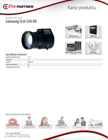 Obiektywy do kamer Samsung SLA-550 DA INSTALACJA KAMER PRZEMYSŁOWYCH KONTROLA DOSTĘPU I CZASU PRACY Specyfikacja techniczna Ogniskowa obiektywu [mm] 5 - 50 Apertura [F] 1,4 Przysłona AutoIris DC Mocowanie obiektywu CS Kompatybilne przetworniki 1/3" MONTAŻ SYSTEMÓW ALARMOWYCH MONTAŻ SYSTEMÓW P.POŻAROWYCH Naszym klientom oferujemy: GWARANCJA SATYSFAKCJI PROGRAM PARTNERSKI POMOC TECHNICZNA SERWIS CCTV SZKOLENIA GENERATOR OFERT