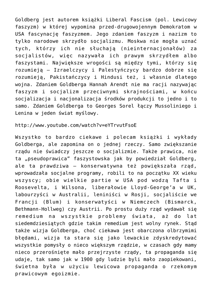 Goldberg jest autorem książki Liberal Fascism (pol. Lewicowy faszyzm) w której wypomina przed-drugowojennym Demokratom w USA fascynację faszyzmem. Jego zdaniem faszyzm i nazizm to tylko narodowe skrzydło socjalizmu. Moskwa nie mogła uznać tych, którzy ich nie słuchają (nieinternacjonałów) za socjalistów, więc nazywała ich prawym skrzydłem albo faszystami. Największe wrogości są między tymi, którzy się rozumieją – Izraelczycy i Palestyńczycy bardzo dobrze się rozumieją, Pakistańczycy i Hindusi też, i własnie dlatego wojna. Zdaniem Goldberga Hannah Arendt nie ma racji nazywając faszyzm i socjalizm przeciwnymi skrajnościami, w końcu socjalizacja i nacjonalizacja środków produkcji to jedno i to samo. Zdaniem Goldberga to Georges Sorel łączy Mussoliniego i Lenina w jeden świat myślowy. http://www.youtube.com/watch?v=eYTrvutFsoE Wszystko to bardzo ciekawe i polecam książki i wykłady Goldberga, ale zapomina on o jednej rzeczy. Samo zwiększanie rządu nie świadczy jeszcze o socjalizmie. Także prawica, nie ta „pseudoprawica” faszystowska jak by powiedział Goldberg, ale ta prawdziwa – konserwatywna też powiększała rząd, wprowadzała socjalne programy, robili to na początku XX wieku wszyscy; obie wielkie partie w USA pod wodzą Tafta i Roosevelta, i Wilsona, liberałowie Lloyd-George’a w UK, labourzyści w Australii, leniniści w Rosji, socjaliście we Francji (Blum) i konserwatyści w Niemczech (Bismarck, Bethmann-Hollweg) czy Austrii. Po prostu duży rząd wydawał się remedium na wszystkie problemy świata, aż do lat siedemdziesiątych gdzie takim remedium jest wolny rynek. Stąd także wizja Goldberga, choć ciekawa jest obarczona olbrzymimi błędami, wizja ta stara się jako lewackie zdyskredytować wszystkie pomysły o nieco większym rządzie, w czasach gdy mamy nieco przerośnięte mało przejrzyste rządy, ta propaganda się udaje, tak samo jak w 1900 gdy ludzie byli mało zaopiekowani, świetna była w użyciu lewicowa propaganda o rzekomym prawicowym egoizmie.