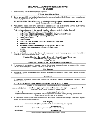 DEKLARACJA WŁAŚCIWOŚCI UŻYTKOWYCH Nr 2A/2013 1. Niepowtarzalny kod identyfikacyjny typu wyrobu: EPS 038 DACH/PODŁOGA 2. Numer typu, partii lub serii lub jakikolwiek inny element umożliwiający identyfikację wyrobu budowlanego, wymagany zgodnie z art. 11 ust. 4: EPS 038 DACH/PODŁOGA - data produkcji umieszczona na etykiecie lub na wyrobie identyfikuje partię produkcyjną 3. Przewidziane przez producenta zamierzone zastosowanie lub zastosowania wyrobu budowlanego zgodnie z mającą zastosowanie zharmonizowaną specyfikacją techniczną: Płyty mają zastosowanie do izolacji cieplnej w budownictwie między innymi: podłogi w systemie ogrzewania podłogowego, podłogi na wszelkiego rodzaju stropach o sztywnej konstrukcji podłogi budynków użyteczności publicznej stropy zewnętrzne stropy pełne stropodachy o wiotkiej konstrukcji (blacha trapezowa), podłogi na gruncie w budownictwie mieszkalnym, użyteczności publicznej i przemysłowym przy normalnych obciążeniach tarasy balkony 4. Nazwa, zastrzeżona nazwa handlowa lub zastrzeżony znak towarowy oraz adres kontaktowy producenta, wymagany zgodnie z art. 11 ust. 5: Przedsiębiorstwo Surowców Skalnych „Bazalt-Gracze” Sp. z o.o. Zakład Produkcji Styropianu GRA-STYR 49-156 Gracze Telefon: +48 77 460 90 38 E-mail: [email protected] 5. W stosownych przypadkach nazwa i adres kontaktowy upoważnionego przedstawiciela, którego pełnomocnictwo obejmuje zadania określone w art. 12 ust. 2: Nie dotyczy 6. System lub systemy oceny i weryfikacji stałości właściwości użytkowych wyrobu budowlanego określone w załączniku V: System 3 7. W przypadku deklaracji właściwości użytkowych dotyczącej wyrobu budowlanego objętego normą zharmonizowaną: Instytutu Techniki Budowlanej (jednostka notyfikowana nr 1488) (nazwa i numer identyfikacyjny jednostki notyfikowanej, jeśli dotyczy) przeprowadził(-a/-o) ustalenie typu wyrobu na podstawie badań typu w systemie 3 (opis zadań strony trzeciej, określonych w załączniku V) i wydał(-a/-o) sprawozdanie z badań (certyfikat stałości właściwości użytkowych, certyfikat zgodności zakładowej kontroli produkcji, sprawozdania z badań/obliczeń - w zależności od przypadku) 8. W przypadku deklaracji właściwości użytkowych dotyczącej wyrobu budowlanego, dla którego wydana została europejska ocena techniczna: Nie dotyczy (nazwa i numer identyfikacyjny jednostki ds. oceny technicznej, jeśli dotyczy) i wydał(-a/-o) Nie dotyczy (numer referencyjny europejskiej oceny technicznej) na podstawie Nie dotyczy (numer referencyjny europejskiego dokumentu oceny) przeprowadził(-a/-o) Nie dotyczy w systemie Nie dotyczy (opis zadań strony trzeciej, określonych w załączniku V) i wydał(-a/-o) Nie dotyczy (certyfikat stałości właściwości użytkowych, certyfikat zgodności zakładowej kontroli produkcji, sprawozdania z badań/obliczeń - w zależności od przypadku) 9. Deklarowane właściwości użytkowe Uwagi do tabeli: 1. Kolumna 1 zawiera wykaz zasadniczych charakterystyk określonych w zharmonizowanych specyfikacjach technicznych dla zamierzonego zastosowania lub zamierzonych zastosowań wskazanych w pkt 3 powyżej. 2. Dla każdej zasadniczej charakterystyki wymienionej w kolumnie 1 i zgodnie z wymaganiami art. 6 kolumna 2 zawiera deklarowane właściwości użytkowe wyrażone jako poziom lub klasa, lub w sposób opisowy, powiązane z odpowiednimi zasadniczymi charakterystykami. Zawiera litery „NPD” (właściwości użytkowe nieustalone; ang. No Performance Determined), o ile właściwości użytkowe nie zostały zadeklarowane. 3. Dla każdej zasadniczej charakterystyki wymienionej w kolumnie 1 kolumna 3 zawiera: a) datowane odniesienie do odpowiedniej normy zharmonizowanej oraz w stosownych wypadkach numer referencyjny zastosowanej specjalnej lub odpowiedniej dokumentacji technicznej; lub b) datowane odniesienie do odpowiedniego europejskiego dokumentu oceny, w przypadku gdy jest on dostępny, oraz numer referencyjny zastosowanej europejskiej oceny technicznej. Zasadnicze charakterystyki (zob. uwaga 1) Reakcja na ogień Właściwości użytkowe (zob. uwaga 2) E Przepuszczalność wody NPD Ciągłe spalanie w postaci żarzenia NPD Długotrwała nasiąkliwość wodą NPD Absorpcja wody przy długotrwałej dyfuzji NPD Uwalnianie się substancji niebezpiecznych do środowiska wewnętrznego NPD Wskaźnik izolacyjności od dźwięków powietrznych przenoszonych drogą bezpośrednią NPD Wskaźnik pochłaniania dźwięku NPD Wskaźnik izolacyjności od dźwięków uderzeniowych (dla podłóg) NPD Opór cieplny Współczynnik przewodzenia ciepła Grubość Przepuszczalność pary wodnej Naprężenie ściskające przy 10% odkształceniu Wytrzymałość na zginanie Wytrzymałość na rozciąganie prostopadłe od powierzchni czołowych RD – tabela niżej Nie więcej niż 0,038 W/m•K T2 NPD CS(10)80 BS125 NPD Trwałość reakcji na ogień w funkcji ciepła, warunków atmosferycznych, starzenie/degradacji Brak zmian Trwałość oporu cieplnego w funkcji ciepła, warunków atmosferycznych, starzenia/degradacji Brak zmian Trwałość właściwości Brak zmian Odkształcenie w określonych warunkach obciążenia ściskającego i temperatury Zharmonizowana specyfikacja techniczna (zob. uwaga 3) DLT(1)5 EN 13163:2012 Właściwości użytkowe (zob. uwaga 2) Zasadnicze charakterystyki (zob. uwaga 1) Trwałość wytrzymałości na ściskanie w funkcji starzenia i degradacji NPD Odporność na zamrażanie-odmrażanie NPD Długotrwała redukcja grubości NPD Zharmonizowana specyfikacja techniczna (zob. uwaga 3) Deklarowany opór cieplny RD [m K/W]: 2 PŁYTY GŁADKIE Grubość [mm] 2 Wartość [m K/W] 10 20 30 40 50 60 70 80 100 120 140 150 160 180 200 0,263 0,526 0,789 1,053 1,316 1,579 1,842 2,105 2,632 3,158 3,684 3,947 4,211 4,737 5,263 50 60 70 80 100 120 140 150 1,316 1,579 1,842 2,105 2,632 3,158 3,684 3,947 PŁYTY FREZOWANE Grubość [mm] 2 Wartość [m K/W] W przypadku gdy na pods