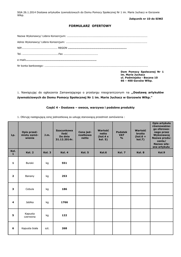 SGA 26.1.2014 Dostawa artykułów żywnościowych do Domu Pomocy Społecznej Nr 1 im. Marie Juchacz w Gorzowie Wlkp. Załącznik nr 1D do SIWZ FORMULARZ OFERTOWY Nazwa Wykonawcy/ Lidera Konsorcjum: ........................................................................................... Adres Wykonawcy/ Lidera Konsorcjum: ............................................................................................ NIP......................................... REGON …………………………………………………………… Tel. .........................................Fax ....................................... e-mail:……………………………………………………………………….. Nr konta bankowego: …................................................................................................................... Dom Pomocy Społecznej Nr 1 im. Marie Juchacz ul. Podmiejska - Boczna 10 66 – 400 Gorzów Wlkp. 1. Nawiązując do ogłoszenia Zamawiającego o przetargu nieograniczonym na ,,Dostawę artykułów żywnościowych do Domu Pomocy Społecznej Nr 1 im. Marie Juchacz w Gorzowie Wlkp.” Część 4 - Dostawa – owoce, warzywa i podobne produkty 1. Oferuję następującą cenę jednostkową za usługę stanowiącą przedmiot zamówienia : J.m. Szacunkowa ilość Do dnia 31.12.2014r. Cena jednostkowa netto Wartość netto (kol.4 x kol. 5) Podatek VAT % Wartość brutto (kol.6 + kol.7) Opis artykułu równoważnego oferowanego przez Wykonawcę Nazwa producenta/ Nazwa własna artykułu Kol. 2 Kol. 3 Kol. 4 Kol. 5 Kol.6 Kol. 7 Kol. 8 Kol.9 1 Buraki kg 551 2 Banany kg 253 3 Cebula kg 186 4 Jabłka kg 1766 5 Kapusta czerwona kg 122 6 Kapusta biała szt. 268 Lp. Opis przedmiotu zamówienia Kol. 1 SGA 26.1.2014 Dostawa artykułów żywnościowych do Domu Pomocy Społecznej Nr 1 im. Marie Juchacz w Gorzowie Wlkp. 7 Kapusta biała kg 413 8 Kapusta włoska kg 305 9 Kapusta pekińska kg 209,5 10 Kapusta pekińska szt. 40 11 Marchew kg 434 12 Ogórek małosolny Kg 27 14 Ogórek kiszony kg 162 15 Pieczarki Kg 167 16 Pomidor kg 499 14 Por szt. 76 15 Pietruszka kg 94 16 Szczypior pęczki 350 17 Seler kg 100 18 Śliwki kg 44 19 Sałata lodowa szt. 160 20 Sałata masłowa szt. 476 21 Ziemniaki kg 7216 SGA 26.1.2014 Dostawa artykułów żywnościowych do Domu Pomocy Społecznej Nr 1 im. Marie Juchacz w Gorzowie Wlkp. 22 Kapusta kiszona kg 406 23 Czosnek szt. 71 26 Papryka czerwona kg 259 WARTOŚĆ OFERTY BRUTTO 27 ________ 2. Gwarantuję świadczenie przedmiotowych dostaw przez czas określony w SIWZ 3. Oświadczam, że spełniam warunki udziału w postępowaniu określone w SIWZ i jej załącznikach. 4. Oświadczam, że akceptuję wymagania określone w SIWZ i jej załącznikach i nie wnoszę do nich uwag. 5. Oświadczam że oferuję przedmiot zamówienia zgodnie z wymaganiami określonymi w SIWZ i jej załącznikach. 6. Oświadczam, że uważam się za związanego niniejszą ofertą na czas wskazany w SIWZ. 7. Oświadczam, że zapoznałem się z załączonymi do SIWZ warunkami umowy i zobowiązuję się w przypadku wyboru mojej oferty, do zawarcia umowy na ustalonych tam warunkach, w miejscu i terminie wyznaczonym przez Zamawiającego. 8. Oświadczam, że złożona oferta uwzględnia wszystkie informacje, które Zamawiający zamieścił na swojej stronie www od dnia ogłoszenia postępowania do dnia otwarcia ofert. 9. Oświadczam, że zobowiązuje się do realizacji przedmiotowych dostaw będących przedmiotem zamówienia w terminie określonym w SIWZ. Miejscowość:....................................., dnia ........................... ........................................... .............................. pieczęć i podpis osoby uprawnionej/upoważnionej do reprezentowania Wykonawcy UWAGA: 1. Wszystkie pola puste i wykropkowane muszą być wypełnione przez Wykonawcę. 2. Oferta oraz wszystkie dokumenty i oświadczenia do niej załączone, muszą być podpisane przez osobę lub w przypadku Wykonawców występujących wspólnie – przez osoby upoważnione do składania woli w imieniu Wykonawcy – zgodnie z formą reprezentacji określoną we właściwym rejestrze lub wpisie do ewidencji działalności gospodarczej. W przypadku podpisania oferty oraz wszystkich dokumentów i oświadczeń do niej załączonych przez osoby upełnomocnione – musi zostać załączone pisemne upoważnienie lub pełnomocnictwo (w formie oryginału lub kserokopii poświadczonej za zgodność z oryginałem przez notariusza – wyrok SO w Warszawie – SYGN.AKT V CA 85/07), określające zakres czynności, do których jest umocowany;. 3. Wszystkie miejsca, w których Wykonawca naniósł zmiany muszą być parafowane przez osobę podpisującą ofertę. 4. Przy obliczaniu cen należy stosować (zasady zaokrąglenia liczb zgodnie z Polską normą PN-70/N-02120 zaokrąglenia liczb do dwóch miejsc po przecinku na każdym etapie przeliczania. Jeżeli cena jest wynikiem dokonanych wyliczeń to powinna być zaokrąglona do dwóch miejsc po przecinku zgodnie z zasadą: jeżeli trzecia cyfra po przecinku jest równa 5 lub więcej to zaokrąglenie „w górę”, jeżeli trzecia cyfra po przecinku jest mniejsza niż 5 to cena będzie zaokrąglona „w dół”.