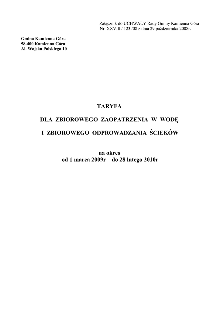 Załącznik do UCHWAŁY Rady Gminy Kamienna Góra Nr XXVIII / 123 /08 z dnia 29 października 2008r. Gmina Kamienna Góra 58-400 Kamienna Góra Al. Wojska Polskiego 10 TARYFA DLA ZBIOROWEGO ZAOPATRZENIA W WODĘ I ZBIOROWEGO ODPROWADZANIA ŚCIEKÓW na okres od 1 marca 2009r do 28 lutego 2010r 1. Informacje ogólne. Niniejsza taryfa stanowi zestawienie cen i stawek opłat za zbiorowe zaopatrzenie w wodę i zbiorowe odprowadzenie ścieków, oraz określa warunki ich stosowania obowiązujące na terenie Gminy Wiejskiej Kamienna Góra dla odbiorców usług przyłączonych do sieci wodociągowych i sieci kanalizacyjnych stanowiących własność Gminy Wiejskiej Kamienna Góra. Taryfa obowiązuje przez 12 miesięcy : od dnia 1 marca 2009 roku do dnia 28 lutego 2010 roku. II.Rodzaj prowadzonej działalności. Gmina Wiejska Kamienna Góra prowadzi zadania zbiorowego zaopatrzenia w wodę i zbiorowego odbioru ścieków: – w zakresie zbiorowego zaopatrzenia w wodę - wydobywanie, uzdatnienie i dostarczanie wody usługobiorcom, za pomocą urządzeń wodociągowych, – w zakresie zbiorowego odprowadzania ścieków – odprowadzanie i oczyszczanie ścieków bytowych zrzucanych przez usługobiorców, za pomocą urządzeń kanalizacyjnych. III.Taryfowe grupy odbiorców. Taryfowa grupa odbiorców usług obejmuje odbiorców wyodrębnionych na podstawie charakterystyki i warunków zbiorowego zaopatrzenia w wodę i zbiorowego odprowadzania ścieków. Dokonano podziału odbiorców usług na następujące taryfowe grupy odbiorców usług: Taryfowa grupa odbiorców Charakterystyka taryfowej grupy odbiorców I grupa taryfowa - - Odbiorcy wody dla gospodarstw Odbiorcy wody dla gospodarstw domowych i gospodarstw rolnych, z gminnej sieci domowych i gospodarstw rolnych wodociągowej. Odprowadzający ścieki bytowe z gospodarstw Odprowadzający ścieki z gospodarstw domowych i gospodarstw rolnych do gminnej domowych i gospodarstw rolnych sieci kanalizacyjnej . II grupa taryfowa - Odbiorcy wody dla obiektów nie Odbiorcy wody dla obiektów nie stanowiących stanowiących gospodarstw domowych i gospodarstw domowych i gospodarstw rolnych , z gminnej sieci wodociągowej . gospodarstw rolnych - Odprowadzający ścieki z obiektów nie Odprowadzający ścieki bytowe z obiektów nie gospodarstw domowych i stanowiących gospodarstw domowych i stanowiących gospodarstw rolnych do gminnej sieci gospodarstw rolnych kanalizacyjnej. IV.Rodzaje i wysokości cen i stawek opłat. W rozliczeniach z odbiorcami usług, w zależności od ich zaklasyfikowania do odpowiednich grup taryfowych obowiązują zróżnicowane ceny i stawki opłat oraz zasady ich stosowania. W rozliczeniach za dostarczoną wodę. 1) cena - wyrażona w złotych za 1 m3 dostarczonej wody, 2) opłata abonamentowa - wyrażona w złotych za odbiorcę usług za miesiąc. W rozliczeniach za odebrane ścieki bytowe. 1) cena - wyrażona w złotych za 1 m3 odebranych ścieków, 2) opłata abonamentowa - wyrażona w złotych za odbiorcę usług za miesiąc. Ceny i stawki opłat za dostarczoną wodę lub odebrane ścieki przedstawione są w taryfie jako wartość netto. Do cen i stawek opłat doliczany będzie podatek VAT w wysokości obowiązującej w dniu świadczenia usługi. Wysokości cen i stawek opłat za dostarczoną wodę i odebrane ścieki. Zestawienie grup taryfowych. Taryfa Nr I . Cena i stawki opłat za dostarczoną wodę i odprowadzone ścieki gospodarstwa domowe lub rolne. L.p Rodzaj ceny/opłaty Jednostka Wartość - zł. netto 1 Cena dostarczonej wody 1m 3,03 2 Cena odprowadzonych ścieków 1m 5,60 3 Opłata abonamentowa : Za odbiorcę usług / m-c 5,49 3 3 Taryfa Nr II. Cena i stawki opłat za dostarczoną wodę i odprowadzone ścieki - nie związane z gospodarstwem domowym lub rolnym L.p Rodzaj ceny/opłaty Jednostka Wartość - zł. netto 1 Cena dostarczonej wody 1 m3 3,03 2 Cena odprowadzonych ścieków 1 m3 5,60 3 Opłata abonamentowa : Za odbiorcę usług / m-c 5,49 V. Warunki rozliczeń z uwzględnieniem wyposażenia nieruchomości w przyrządy i urządzenia pomiarowe. – – – – – O ile umowa zawarta z usługobiorcą nie stanowi inaczej opłata za zaopatrzenie w wodę i odbiór ścieków pobierana jest: » co miesiąc – od odbiorców usług korzystających z odbioru ścieków oraz od odbiorców usług korzystających z zaopatrzenia w wodę wraz z odbiorem ścieków, » co dwa miesiące – od odbiorców usług korzystających wyłącznie z zaopatrzenia w wodę. Odbiorca usług dokonuje zapłaty za dostarczoną wodę i odprowadzone ścieki na warunkach i w terminach określonych w umowie. Ilość dostarczanej do nieruchomości wody ustala się na podstawie wskazań wodomierza głównego, a w przypadku jego braku, na podstawie przeciętnych norm zużycia wody. Ilość odprowadzonych ścieków ustala się na podstawie wskazań urządzenia pomiarowego, a w przypadku jego braku, jako równą ilości pobranej wody. W przypadku, gdy odprowadzający ścieki pobiera wodę z wielu punktów poboru wody, a brak jest urządzenia pomiarowego, ilość odprowadzonych ścieków ustala się jako sumę ilości pobranej wody ze wszystkich punktów poboru wody. W przypadku niesprawności wodomierza, ilość pobranej wody ustala się jako średnią zużycia wody z ostatnich 6-ciu miesięcy poprzedzających ujawnienie awarii. VI.Warunki stosowania cen i stawek opłat. Ceny i stawki opłat obowiązują przez 1 rok. VII.Zakres świadczeń usług dla poszczególnych grup taryfowych. Zbiorowe zaopatrzenie w wodę oraz zbiorowe odprowadzanie ścieków prowadzone jest przez Gminę Kamienna Góra dla wszystkich odbiorców usług za pośrednictwem urządzeń wodociągowych i kanalizacyjnych będących w posiadaniu Gminy Kamienna Góra. Gmina Kamienna Góra nie prowadzi usług w zakresie zbiorowego zaopatrzenia w wodę i zbiorowego odbioru ścieków dla nieruchomości, osób bądź podmiotów gospodarczych położonych na terenie Gminy Kamienna Góra ale nie przyłączon