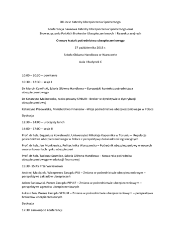 XX-lecie Katedry Ubezpieczenia Społecznego Konferencja naukowa Katedry Ubezpieczenia Społecznego oraz Stowarzyszenia Polskich Brokerów Ubezpieczeniowych i Reasekuracyjnych O nowy kształt pośrednictwa ubezpieczeniowego 27 października 2015 r. Szkoła Główna Handlowa w Warszawie Aula I Budynek C 10:00 – 10:30 – powitanie 10:30 – 12:30 – sesja I Dr Marcin Kawiński, Szkoła Główna Handlowa – Europejski kontekst pośrednictwa ubezpieczeniowego Dr Katarzyna Malinowska, radca prawny SPBUiR– Broker w dyrektywie o dystrybucji ubezpieczeniowej Katarzyna Przewalska, Ministerstwo Finansów –Wizja pośrednictwa ubezpieczeniowego w Polsce Dyskusja 12:30 – 14:00 – uroczysty lunch 14:00 – 17:00 – sesja II Prof. dr hab. Eugeniusz Kowalewski, Uniwersytet Mikołaja Kopernika w Toruniu – Regulacja pośrednictwa ubezpieczeniowego w Polsce z perspektywy doświadczeń legislacyjnych Prof. dr hab. Jan Monkiewicz, Politechnika Warszawska – Pośrednik ubezpieczeniowy w nowych uwarunkowaniach rynku ubezpieczeń Prof. dr hab. Tadeusz Szumlicz, Szkoła Główna Handlowa – Nowa rola pośrednika ubezpieczeniowego w edukacji finansowej 15:30 -15:45 Przerwa kawowa Andrzej Maciążek, Wiceprezes Zarządu PIU – Zmiana w pośrednictwie ubezpieczeniowym – perspektywa zakładów ubezpieczeń Adam Sankowski, Prezes Zarządu PIPUiF – Zmiana w pośrednictwie ubezpieczeniowym – perspektywa agentów ubezpieczeniowych Łukasz Zoń, Prezes Zarządu SPBUiR – Zmiana w pośrednictwie ubezpieczeniowym – perspektywa brokerów ubezpieczeniowych Dyskusja 17:30 zamknięcie konferencji