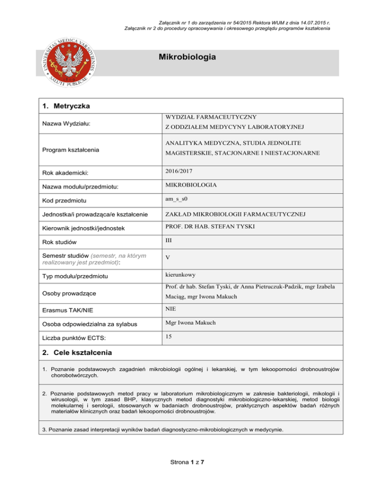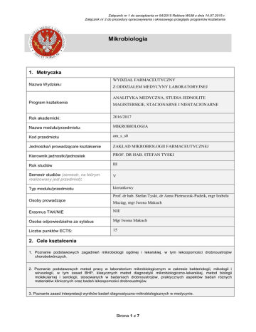 Załącznik nr 1 do zarządzenia nr 54/2015 Rektora WUM z dnia 14.07.2015 r. Załącznik nr 2 do procedury opracowywania i okresowego przeglądu programów kształcenia Mikrobiologia 1. Metryczka WYDZIAŁ FARMACEUTYCZNY Nazwa Wydziału: Z ODDZIAŁEM MEDYCYNY LABORATORYJNEJ ANALITYKA MEDYCZNA, STUDIA JEDNOLITE Program kształcenia MAGISTERSKIE, STACJONARNE I NIESTACJONARNE Rok akademicki: 2016/2017 Nazwa modułu/przedmiotu: MIKROBIOLOGIA Kod przedmiotu am_s_s0 Jednostka/i prowadząca/e kształcenie ZAKŁAD MIKROBIOLOGII FARMACEUTYCZNEJ Kierownik jednostki/jednostek PROF. DR HAB. STEFAN TYSKI Rok studiów III Semestr studiów (semestr, na którym realizowany jest przedmiot): V Typ modułu/przedmiotu kierunkowy Prof. dr hab. Stefan Tyski, dr Anna Pietruczuk-Padzik, mgr Izabela Osoby prowadzące Maciąg, mgr Iwona Makuch Erasmus TAK/NIE NIE Osoba odpowiedzialna za sylabus Mgr Iwona Makuch Liczba punktów ECTS: 15 2. Cele kształcenia 1. Poznanie podstawowych zagadnień mikrobiologii ogólnej i lekarskiej, w tym lekooporności drobnoustrojów chorobotwórczych. 2. Poznanie podstawowych metod pracy w laboratorium mikrobiologicznym w zakresie bakteriologii, mikologii i wirusologii, w tym zasad BHP, klasycznych metod diagnostyki mikrobiologiczno-lekarskiej, metod biologii molekularnej i serologii, stosowanych w badaniach drobnoustrojów, praktycznych aspektów badań różnych materiałów klinicznych oraz badań lekooporności drobnoustrojów. 3. Poznanie zasad interpretacji wyników badań diagnostyczno-mikrobiologicznych w medycynie. Strona 1 z 7 Załącznik nr 1 do zarządzenia nr 54/2015 Rektora WUM z dnia 14.07.2015 r. Załącznik nr 2 do procedury opracowywania i okresowego przeglądu programów kształcenia 2. Wymagania wstępne 1. Student zna podstawy biologii, w tym genetyki, chemii i biochemii z zakresu szkoły średniej oraz I i II roku studiów. 2. Student zna budowę i funkcjonowanie organizmu człowieka, jego narządów i tkanek. 3. Student potrafi posługiwać się podstawowym sprzętem laboratoryjnym oraz mikroskopem. 3. Przedmiotowe efekty kształcenia Lista efektów kształcenia Symbol przedmiotowego efektu kształcenia W1 W2 W3 W4 W5 W6 W7 W8 U1 U2 Treść przedmiotowego efektu kształcenia zna podstawy metodyczne badań analitycznych (w tym: rozdzielczych, fotometrycznych, spektrometrycznych, elektrochemicznych, immunochemicznych, analizy enzymów i substratów, kwasów nukleinowych) i ich zastosowanie w medycynie laboratoryjnej w zakresie badań mikrobiologicznych zna rodzaje i charakterystykę materiału biologicznego, zasady i metodykę pobierania, transportu, przechowywania i przygotowania do analizy (w tym: miejsce i czas pobrania, wpływ czynników interferujących, dobór antykoagulantów, utrwalaczy i podłóż transportowych, temperatury), dotyczące specyfiki materiałów pobieranych do badań mikrobiologicznych Odniesienie do efektu kierunkowego (numer) KW_11 M2_W03 M2_W07 KW_22 M2_W03 M2_W07 zna patogenezę, patomechanizm, epidemiologię, główne objawy kliniczne, metody diagnostyki i zasady leczenia najważniejszych chorób wywołanych przez bakterie, grzyby i wirusy KW_30 M2_W03 zna teoretyczne i praktyczne aspekty diagnostyki mikrobiologicznej oraz jej znaczenie dla rozpoznawania zakażeń, prognozowania przebiegu oraz oceny lekowrażliwości KW_31 M2_W03 zna diagnostykę serologiczną chorób infekcyjnych oraz jej znaczenie dla rozpoznawania, różnicowania, monitorowania przebiegu choroby i oceny efektów leczenia w zakresie badań diagnostycznych drobnoustrojów, które przeprowadzane są w laboratoriach mikrobiologicznych zna podstawowe techniki badawcze cytogenetyki i biologii molekularnej i ich zastosowanie w diagnostyce chorób nie-infekcyjnych i infekcyjnych w zakresie biologii molekularnej zna metody oceny czynności układu immunologicznego we wrodzonych i nabytych zaburzeniach odporności rozumie zasady funkcjonowania aparatury stosowanej w medycynie laboratoryjnej potrafi wyjaśnić pacjentowi lub zleceniodawcy wpływ czynników przedlaboratoryjnych na jakość wyniku (w tym, konieczność powtórzenia badania) w zakresie dotyczącym badań mikrobiologicznych potrafi pobierać materiał do badań, ocenić jego przydatność, przechowywać i przygotowywać do analizy Strona 2 z 7 M2_W07 M2_W07 KW_33 M2_W03 M2_W07 KW_35 M2_W03 M2_W07 KW_36 M2_W03 M2_W07 KW_16 M2_W07 K_U01 M2_U01 M2_U03 M2_U04 M2_U07 K_U05 M2_U01 Załącznik nr 1 do zarządzenia nr 54/2015 Rektora WUM z dnia 14.07.2015 r. Załącznik nr 2 do procedury opracowywania i okresowego przeglądu programów kształcenia w przypadku materiałów do badań mikrobiologicznych, których pobranie może odbywać się w laboratorium mikrobiologicznym 4. 5. M2_U06 U3 umie dobrać optymalne metody analityczne i ocenić wiarygodność wyników tych analiz w przypadku wyników badań mikrobiologicznych K_U06 M2_U05 M2_U06 M2_U07 M2_U08 U4 potrafi uzyskiwać wiarygodne wyniki laboratoryjnych badań mikrobiologicznych w zakresie ogólnym (w tym przygotowywać podłoża mikrobiologiczne wykonywać różne techniki posiewów, zakładać hodowle, oceniać wzrost drobnoustrojów, przygotowywać i oceniać preparaty bakteriologiczne, wykonywać podstawowe próby hodowlane, biochemiczne i serologiczne, oceniać lekowrażliwość) K_U21 M2_U02 M2_U04 M2_U05 M2_U06 M2_U07 M2_U08 U5 potrafi uzyskiwać wiarygodne wyniki laboratoryjnych badań mikrobiologicznych przez zapewnienie odpowiednich warunków pracy (w tym: potrafi kontrolować procesy sterylizacji, czystość mikrobiologiczną środowiska, właściwą dezynfekcję rąk i dobór odpowiednich środków dezynfekcyjnych) U6 potrafi uzyskiwać wiarygodne wyniki laboratoryjnych badań mikrobiologicznych w zakresie badań konkretnych grup drobnoustrojów – bakterii i grzybów (w tym wykonywać próby identyfikacyjne i oznaczenie lekowrażliwości z uwzględnieniem specyfiki grupy) U7 potrafi uzyskiwać wiarygodne wyniki laboratoryjnych badań mikrobiologicznyc