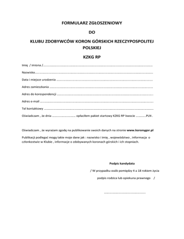 FORMULARZ ZGŁOSZENIOWY DO KLUBU ZDOBYWCÓW KORON GÓRSKICH RZECZYPOSPOLITEJ POLSKIEJ KZKG RP Imię / imiona /……..…………………………………………………………………………………………………………………… Nazwisko……………………………………………………………………………………………………………………………………. Data i miejsce urodzenia …………………………………………………………………………………………………………... Adres zamieszkania ……………………………………………………………………………………….………………………….. Adres do korespondencji …………………………………………………………………………………………………….…….. Adres e-mail ………………………………………………………………………………………………………………………………. Tel kontaktowy ………………………………………………………………………..………………………………………………… Oświadczam , że dnia ………………………… opłaciłem pakiet startowy KZKG RP kwocie ………….PLN . Oświadczam , że wyrażam zgodę na publikowanie swoich danych na stronie www.koronygor.pl Publikacji podlegać mogą takie moje dane jak : nazwisko i imię , województwo , informacja o członkostwie w Klubie , informacje o zdobywanych koronach górskich i ich stopniach. Podpis kandydata / W przypadku osób pomiędzy 4 a 18 rokiem życia podpis rodzica lub opiekuna prawnego / ……………………………………………..