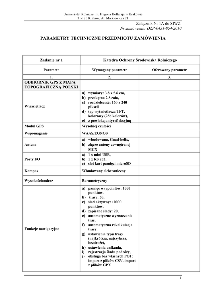 Uniwersytet Rolniczy im. Hugona Kołłątaja w Krakowie 31-120 Kraków, Al. Mickiewicza 21 Załącznik Nr 1A do SIWZ. Nr zamówienia:DZP-0431-854/2010 PARAMETRY TECHNICZNE PRZEDMIOTU ZAMÓWIENIA Zadanie nr 1 Katedra Ochrony Środowiska Rolniczego Parametr Wymagany parametr Oferowany parametr 1. 2. 3. ODBIORNIK GPS Z MAPĄ TOPOGRAFICZNĄ POLSKI a) wymiary: 3.8 x 5.6 cm, b) przekątna 2.8 cala, c) rozdzielczość: 160 x 240 Wyświetlacz Moduł GPS pikseli d) typ wyświetlacza TFT, kolorowy (256 kolorów), e) z powłoką antyrefleksyjną Wysokiej czułości Wspomaganie WAAS/EGNOS Antena Porty I/O a) wbudowana, Guad-helix, b) złącze anteny zewnętrznej MCX a) 1 x mini USB, b) 1 x RS 232, c) slot kart pamięci microSD Kompas Wbudowany elektroniczny Wysokościomierz Barometryczny a) pamięć waypointów: 1000 b) c) d) e) f) Funkcje nawigacyjne g) h) i) j) punktów, trasy: 50, ślad aktywny: 10000 punktów, zapisane ślady: 20, automatyczne wyznaczanie tras, automatyczna rekalkulacja trasy: ustawienia typu trasy (najkrótsza, najszybsza, bezdroŜe), ustawienia unikania, rejestracja śladu podróŜy, obsługa baz własnych POI : import z plików CSV, import z plików GPX 1 Uniwersytet Rolniczy im. Hugona Kołłątaja w Krakowie 31-120 Kraków, Al. Mickiewicza 21 k) alarm punktów niebezpiecznych l) alarmy dźwiękowe, m) kalendarz pór połowów i polowań, n) ekran słońca i księŜyca, o) krzywe pływów, p) funkcja pomiaru pola powierzchni, q) tryb Geocache a) 2 baterie AA, b) czas pracy na baterii do 18 godzin Zasilanie Wodoszczelność IPX7 Temperatura pracy - 20° do 70 °C Inne Topograficzna Polski GP Mapa TOPO w najaktualniejszej wersji na dzień składnia ofert. Wykonawca poda w oferowanych parametrach wersje mapy Polski Wymiary urządzenia 6.1 x 15.5x3.3 cm Waga urządzenia 213 g ( z bateriami) Oferowany producent (firma), kraj produkcji, typ-model Ilość szt. 1. Cena brutto ………………………………………………. (podpis osoby/osób upowaŜnionej/ych do składania oświadczeń woli w imieniu wykonawcy) 2 Uniwersytet Rolniczy im. Hugona Kołłątaja w Krakowie 31-120 Kraków, Al. Mickiewicza 21 Zadanie nr 2 Parametr 1. ODBIORNIK GPS Typ wyświetlacz Katedra Botaniki i Fizjologii Roślin Wymagany parametr 2. Oferowany parametr 3. LCD, 4 poziomy szarości, podświetlany Wymiary wyświetlacza, 2.8 x 5.4 cm (szer x wys) Rozdzielczość wyświetlacza, 160 x 288 px (szer x wys ) Moduł GPS Moduł GPS wysokiej czułości Antena typu patch Porty I/O Mapa bazowa Pamięć wbudowana USB Tak, Atlantic Highway Tak, 24 MB Pamięć waypointów 1000 punktów Trasy Ślad aktywny Ślady zapisane 20 po 250 punktów 10000 punktów 10 Tryb Geocache, Gry terenowe, Kalendarz pór połowów i polowań, Ekran słońca i księŜyca, 2 baterie AA, Czas pracy na baterii: do 14 godzin IPX 7 Cechy funkcjonalne Zasilanie Wodoszczelność Wymiary urządzenia (szer x wys x głęb) Waga urządzenia 5.1 x 11.2 x 3.0 cm 150 g (z bateriami) Oferowany producent (firma), kraj produkcji, typ-model Ilość szt. 1. Cena brutto ………………………………………………. (podpis osoby/osób upowaŜnionej/ych do składania oświadczeń woli w imieniu wykonawcy) 3