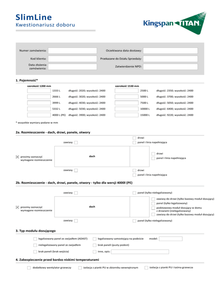 SlimLine Kwestionariusz doboru Numer zamówienia: Oczekiwana data dostawy: Kod klienta: Przekazane do Działu Sprzedaży: Data złożenia zamówienia: Zatwierdzenie NPD: 1. Pojemność* szerokość 1200 mm szerokość 1530 mm 1333 L długość: 2020; wysokość: 2400 2500 L długość: 2350; wysokość: 2400 2666 L długość: 3020; wysokość: 2400 5000 L długość: 3700; wysokość: 2400 3999 L długość: 4030; wysokość: 2400 7500 L długość: 5050; wysokość: 2400 5332 L długość: 5030; wysokość: 2400 10000 L długość: 6400; wysokość: 2400 4000 L (PE) długość: 3900; wysokość: 2400 15000 L długość: 9220; wysokość: 2400 * wszystkie wymiary podane w mm 2a. Rozmieszczenie - dach, drzwi, panele, otwory drzwi panel i linia napełniająca zawiasy drzwi dach prosimy zaznaczyć wymagane rozmieszczenie panel i linia napełniająca zawiasy drzwi panel i linia napełniająca 2b. Rozmieszczenie - dach, drzwi, panele, otwory - tylko dla wersji 4000l (PE) zawiasy panel (tylko nielegalizowany) zawiasy do drzwi (tylko bazowy moduł dozujący) panel (tylko legalizowany) dach prosimy zaznaczyć wymagane rozmieszczenie podstawowy moduł dozujący w domu z drzwiami (nielegalizowany) zawiasy do drzwi (tylko bazowy moduł dozujący) zawiasy panel (tylko nielegalizowany) 3. Typ modułu dozującego legalizowany panel ze zwijadłem (ADAST) legalizowany samostojący na podeście nielegalizowany panel ze zwijadłem brak paneli (pusty podest) brak paneli (brak wejścia) inne, opis: model: 4. Zabezpieczenie przed bardzo niskimi temperaturami dodatkowy wentylator grzewczy izolacja z pianki PU w zbiorniku wewnętrznym izolacja z pianki PU i taśma grzewcza 5. Nalewak & zwijadło standardowa wersja automatyczna (Piusi - standard) pierścień magnetyczny (dla nalewaka Elaflex) standardowa wersja automatyczna (Piusi, z certyfikatem TUV) bez nalewaka standardowa wersja automatyczna z blokadą magnetyczną (Elaflex ZVA) Zwijadło z blokadą (w wersji standard bez blokady) 6. Język - tylko skalibrowane panele Polski Francuski Holenderski Rosyjski Angielski Niemiecki Czeski inne: 7. Pompa - tylko skalibrowane panele głębinowa inne: niegłębinowa pompa Piusi 8. Urządzenie wielodostępowe - tylko nieskalibrowane panele MC BOX inne: Xtrack 9. Telemetria telemetria TMS brak telemetrii inne: telemetria GOK 10. Wymagane certyfikaty DIBT inne: KIWA 11. Wymagania komunikacyjne dla kalibracji panelu (niestandardowe) RS 485 EASY CALL ER3 ISFF LON FTT-10 LOGITRON inne: ISFF TCP/IP podwójny sygnał nie wymagana MC Spal PetroStation CL PV 3500 OPW Europos Stacja Paliw 2000 PSS 5000 DOMS SBEN inny: typ: 12. System kasowy (niestandardowy) 13. Inne wymagania: Pełna nazwa klienta: Podpis Pełnomocnika Sprzedaży Podpis Klienta Data: Data: KINGSPAN ENVIRONMENTAL Sp. z o.o. ul. Topolowa 5 62-090 Rokietnica, Polska Tel.: +48 61 814 44 00 Fax: +48 61 814 54 99 [email protected] www.environmental.kingspan.com Wyślij Drukuj