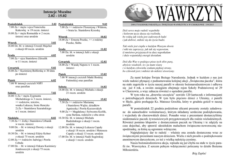 WAWRZYN www.wawrzyniec-chorzow.katowice.opoka.org.pl Intencje Mszalne 2.02 - 15.02 Poniedziałek 2.02 Poniedziałek 9.02 7.00 Za + męża i ojca Franciszka 7.00 Za ++ rodziców Florentynę i Wiktora, Kukowkę w 19 roczn. śmierci + brata ks. Stanisława Krzoskę 18.00 Za + męża Romualda w 2 roczn. śmierci oraz urodzin Wtorek 10.02 18.00 Za + Ernesta Peszke, ++ z rodziny Wtorek 3.02 Peszke, Skiba 18.00 Dz. bł. w intencji Urszuli Majcher z okazji 60 roczn. urodzin Środa 11.02 7.00 Dz. bł. w intencji Julii z okazji Środa 4.02 urodzin 7.00 Za + ojca Stanisława Zdrzalik w 11 roczn. śmierci Czwartek 12.02 18.00 Za + Wandę Napora w 1 roczn. Czwartek 5.02 śmierci 18.00 Za + Kazimierę Bolforską w 30 dniu po śmierci Piątek 13.02 7.00 W intencji czcicieli Matki Boskiej Piątek 6.02 Fatimskiej oraz parafian 7.00 W intencji czcicieli NSPJ oraz parafian Sobota 14.02 18.00 Dz. bł. w intencji Michała z okazji Sobota 7.02 21 roczn. urodzin 18.00 1) Za + męża Zygmunta Michalskiego w 3 roczn. śmierci, Niedziela 15.02 ++ rodziców, teściów, 7.30 Za ++ rodziców Mariannę wnuka Łukasza, brata Henryka i Stanisława Wajler, dziadków 2) Za + Stanisława Szarańskiego Agnieszkę i Pawła Kurzawskich w 1 roczn. śmierci 9.00 Za ++ Magdalenę i Sylwestra Koźlik, syna Stefana, rodziców z obu stron Niedziela 8.02 10.30 Dz. bł. w intencji Michała 7.30 Za ++ Zofię i Stanisława Urbanik Rudzińskiego z okazji 1 roczn. w roczn. śmierci urodzin 9.00 Dz. – bł. w intencji Doroty z okazji 12.00 Dz. bł. w intencji Łukasza Capały urodzin z okazji 18 roczn. urodzin i Mateusza 10.30 Dz. – bł. w intencji Edyty Kelner Capały z okazji 13 roczn. urodzin z okazji 75 roczn. urodzin 17.00 Dz. bł. w intencji Nadii Sogórskiej 12.00 Za ++ rodziców Jadwigę i Pawła z okazji 1 roczn. urodzin Cebula 17.00 Dz. – bł. w intencji Oskara Kazimiery Jendroszczyk z okazji 75 roczn. urodzin DWUTYGODNIK PARAFII p.w. ŚWIĘTEGO WAWRZYŃCA W CHORZOWIE 339/2015 Dziś serce moje radość wypełniła i kolorem tęczy dusza się rozlśniła, bo widzę jak wielu jest cudownych ludzi i jak dobroć, miłość się do życia budzi. Tak wiele jest ciepła w każdym Waszym słowie i nikt nie zaprzeczy, jak tak się wypowiem, iż mnóstwo przyjaznych tu dusz napotkałam i dużo wspaniałej energii dostałam. Dziś dla Was w podzięce pisze tych słów parę, abyście wiedzieli, że i ja mam wiarę i w każdym człowieku szukam pięknej strony, bo człowiek jest z miłości do miłości stworzony. Za nami kolejne Święta Bożego Narodzenia. Jednak w każdym z nas jest wiele radości płynącej z podsumowania kolejnej akcji „Świąteczna paczka”, która na stałe zagościła w życiu naszej parafii w okresie bożonarodzeniowym i odbywa się już 4 rok, a swoim zasięgiem obejmuje rejon Szkoły Podstawowej nr 29 w Chorzowie, a więc zahacza również o sąsiednie parafie. W tym roku na „drzewku szczęścia” zawisło 120 karteczek z informacjami o potrzebujących dzieciach. W tym było pięcioro dzieci z Ukrainy, z parafii w Skole, gdzie posługuje Ks. Mateusz Grochla, który w grudniu gościł w naszej parafii. W poniedziałek 22 grudnia podzielone ulicami prezenty zostały załadowane do samochodów wolontariuszy, którym składamy serdeczne podziękowania, i wyjechały do chorzowskich dzieci. Ponadto wraz z prezentami dostarczyliśmy siedemnaście paczek żywnościowych przygotowanych dla rodzin wielodzietnych. Również pomimo kłopotów z dostarczeniem paczek na Ukrainę i te zdążyły na czas dojechać, aby sprawić ukraińskim maluchom świąteczno-noworoczną niespodziankę, za którą są ogromnie wdzięczne. Najpiękniejszy dar to radość – właśnie ona została dostarczona wraz ze świątecznymi prezentami naszym dzieciom. Wielu z nich prosiło o podziękowanie anonimowym darczyńcom, co też z wielką radością czynimy. Nasza bożonarodzeniowa akcja, wpisała się już chyba na stałe w życie parafii św. Wawrzyńca. Z sercem pełnym wdzięczności polecamy to dzieło Bożemu Miłosierdziu. Bóg Zapłać Papieskie intencje Apostolstwa Modlitwy na miesiąc luty: Intencja ogólna: Aby więźniowie, a szczególnie młodzi, mieli możliwość ułożenia sobie na nowo godnego życia. Intencja misyjna: Aby małżonkowie, którzy pozostają w separacji, znaleźli akceptację i wsparcia we wspólnocie chrześcijańskiej. Statystyka duszpasterska – 2014 r. 1. Chrzest: ogółem – 93 (z przekazu – 69; parafialnych – 24) chłopców – 42 (imiona – 3 Adam, Artur) dziewczynek – 51 (imiona – 5 Julia, 4 Emilia, Zofia, Natalia) 2. Komunie św.: ogółem – 45667 (w kościele – 45436, w domu chorego – 86 + 145 Szafarze) 3. I Komunia św. (II kl. – 58; Wczesna Komunia Św. – 3; Społeczna Szkoła z Batorego – 25) 4. Sakrament chorych ogółem – 73 (13 w domu chorego; 60 rekolekcje wielkopostne) 5. Sakrament małżeństwa: ogółem – 82 (z przekazu – 74; 8 - parafialne) 6. Pogrzeby: ogółem – 33 (16 pogrzebów przekazano do innych parafii); 49 parafian zmarło, w tym 2 chłopców poniżej 10 l. mężczyzn – 12 + 4 (przekaz) = 16 kobiet – 21 + 12 (przekaz) = 33 Plan wydarzeń parafialnych 2015 2 – 13 luty – ferie zimowe, w tygodniu obowiązuje wakacyjny porządek nabożeństw 22 – 25 marzec – rekolekcje wielkopostne 13 – 23 kwiecień – pielgrzymka parafialna do Rzymu, San Giovani Rotondo, Medjugorie 1 maj – odpust w kościele św. Józefa w Górnośląskim Skansenie 10 maj – I Komunia św. lipiec i sierpień – letnie wakacje, obowiązuje wakacyjny porządek nabożeństw 9 sierpień – odpust parafialny 26 wrzesień – dekanalna pielgrzymka do Piekar Śl. 22 październik – adoracja Najświętszego Sakramentu Sakramentalny związek małżeński pragną zawrzeć: Sobek Łukasz par. św. Wawrzyńca w Chorzowie Bożyczko Kamila par. św. Wawrzyńca w Chorzowie OGŁOSZENIA DUSZPASTERSKIE W niedzielę o godz. 10.10 Koronka do Miłosierdzia Bożego prowadzane pr