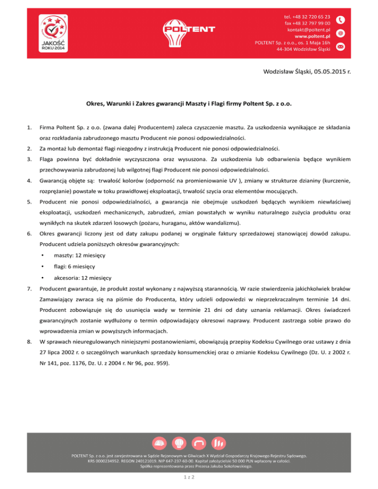 Wodzisław Śląski, 05.05.2015 r. Okres, Warunki i Zakres gwarancji Maszty i Flagi firmy Poltent Sp. z o.o. 1. Firma Poltent Sp. z o.o. (zwana dalej Producentem) zaleca czyszczenie masztu. Za uszkodzenia wynikające ze składania oraz rozkładania zabrudzonego masztu Producent nie ponosi odpowiedzialności. 2. Za montaż lub demontaż flagi niezgodny z instrukcją Producent nie ponosi odpowiedzialności. 3. Flaga powinna być dokładnie wyczyszczona oraz wysuszona. Za uszkodzenia lub odbarwienia będące wynikiem przechowywania zabrudzonej lub wilgotnej flagi Producent nie ponosi odpowiedzialności. 4. Gwarancją objęte są: trwałość kolorów (odporność na promieniowanie UV ), zmiany w strukturze dzianiny (kurczenie, rozprężanie) powstałe w toku prawidłowej eksploatacji, trwałość szycia oraz elementów mocujących. 5. Producent nie ponosi odpowiedzialności, a gwarancja nie obejmuje uszkodzeń będących wynikiem niewłaściwej eksploatacji, uszkodzeń mechanicznych, zabrudzeń, zmian powstałych w wyniku naturalnego zużycia produktu oraz wynikłych na skutek zdarzeń losowych (pożaru, huraganu, aktów wandalizmu). 6. Okres gwarancji liczony jest od daty zakupu podanej w oryginale faktury sprzedażowej stanowiącej dowód zakupu. Producent udziela poniższych okresów gwarancyjnych: 7. • maszty: 12 miesięcy • flagi: 6 miesięcy • akcesoria: 12 miesięcy Producent gwarantuje, że produkt został wykonany z najwyższą starannością. W razie stwierdzenia jakichkolwiek braków Zamawiający zwraca się na piśmie do Producenta, który udzieli odpowiedzi w nieprzekraczalnym terminie 14 dni. Producent zobowiązuje się do usunięcia wady w terminie 21 dni od daty uznania reklamacji. Okres świadczeń gwarancyjnych zostanie wydłużony o termin odpowiadający okresowi naprawy. Producent zastrzega sobie prawo do wprowadzenia zmian w powyższych informacjach. 8. W sprawach nieuregulowanych niniejszymi postanowieniami, obowiązują przepisy Kodeksu Cywilnego oraz ustawy z dnia 27 lipca 2002 r. o szczególnych warunkach sprzedaży konsumenckiej oraz o zmianie Kodeksu Cywilnego (Dz. U. z 2002 r. Nr 141, poz. 1176, Dz. U. z 2004 r. Nr 96, poz. 959). 1z2 Użytkowanie i konserwacja flag Użytkowanie: 1. Producent zaleca, aby flaga powiewała swobodnie. Należy unikać kontaktu flagi ze ścianami budynków, drzewami, słupami oraz liniami wysokiego napięcia. 2. Nie zaleca się użytkowania flagi podczas niekorzystnych warunków pogodowych oraz nasilających się podmuchach wiatru. 3. Zaleca się niezwłoczne wypranie flagi po jej zabrudzeniu. Nie stosowanie się do zaleceń Producenta dotyczących użytkowania flagi może skutkować uszkodzeniem materiału oraz wchłonięciem zabrudzenia w tkaninę. Konserwacja: 1. Dopuszcza się wstępne oczyszczenie mocno zabrudzonej flagi niewielką ilością mydła lub płynu. 2. Flagi nie można trzeć ani skrobać w celu usunięcia zabrudzeń. 3. Flagi nie można czyścić chemicznie lub stosować środków chemicznych na bazie benzyny lub rozpuszczalników. 4. Dopuszcza się pranie flagi w pralce automatycznej w temperaturze do 40° Celsjusza w cyklu dla delikatnych tkanin ze słabym wirowaniem uwzględniając przepisy konserwacji. 5. Do prania nie można używać środków zawierających chlor. 6. Flagi nie można suszyć w suszarce bębnowej. 7. Przy użytkowaniu zewnętrznym lepiej jest rozwiesić mokrą flagę na maszcie. 8. Flagi nie można prasować. 9. Jeżeli koniecznym jest użycie żelazka, zaleca się nastawienie temperatury na tkaniny poliestrowe. Informacje dodatkowe: Jeżeli doszło do uszkodzenia mechanicznego flagi, niekorzystnych warunków pogodowych lub na skutek oddziaływania silnego wiatru, flagę należy odesłać do naprawy producentowi, tak by nie doszło do jej dalszych uszkodzeń. W razie dodatkowych pytań zapraszamy do kontaktu. 2z2