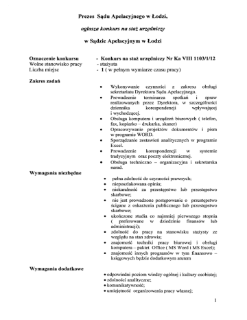 Prezes Sądu Apelacyjnego w Łodzi, ogłasza konkurs na staż urzędniczy w Sądzie Apelacyjnym w Łodzi Oznaczenie konkursu Wolne stanowisko pracy Liczba miejsc Konkurs na staż urzędniczy Nr Ka VIII 1103/1/12 stażysta 1 ( w pełnym wymiarze czasu pracy) Zakres zadań Wykonywanie czynności z zakresu obsługi sekretariatu Dyrektora Sądu Apelacyjnego. Prowadzenie terminarza spotkań i spraw realizowanych przez Dyrektora, w szczególności dziennika korespondencji wpływającej i wychodzącej. Obsługa komputera i urządzeń biurowych ( telefon, fax, kopiarko - drukarka, skaner) Opracowywanie projektów dokumentów i pism w programie WORD. Sporządzanie zestawień analitycznych w programie Excel. Prowadzenie korespondencji w systemie tradycyjnym oraz poczty elektronicznej. Obsługa techniczno - organizacyjna i sekretarska narad. Wymagania niezbędne pełna zdolność do czynności prawnych; nieposzlakowana opinia; niekaralność za przestępstwo lub przestępstwo skarbowe; nie jest prowadzone postępowanie o przestępstwo ścigane z oskarżenia publicznego lub przestępstwo skarbowe; ukończone studia co najmniej pierwszego stopnia ( preferowane w dziedzinie finansów lub administracji); zdolność do pracy na stanowisku stażysty ze względu na stan zdrowia; znajomość techniki pracy biurowej i obsługi komputera - pakiet Office ( MS Word i MS Excel); znajomość innych programów w tym finansowo księgowych będzie dodatkowym atutem Wymagania dodatkowe • odpowiedni poziom wiedzy ogólnej i kultury osobistej; • zdolności analityczne; • komunikatywność; • umiejętność organizowania pracy własnej; umiejętność pracy w zespole. Wymagane dokumenty • podanie (wraz z oznaczeniem konkursu); • życiorys lub CV; • kwestionariusz osobowy ( druk do pobrania na niniejszej stronie lub w Oddziale Kadr Sądu Apelacyjnego w Łodzi, ul. Narutowicza 64, pok.240, II piętro); • kserokopia dyplomu ukończenia studiów ( oryginał dyplomu kandydat okaże w przypadku zakwalifikowania się do trzeciego etapu konkursu rozmowy kwalifikacyjnej); • oświadczenie kandydata, o posiadaniu pełnej zdolności do czynności prawnych, o niekaralności za przestępstwo lub przestępstwo skarbowe, o nie prowadzeniu żadnego postępowania o przestępstwo ścigane z oskarżenia publicznego lub o przestępstwo skarbowe ( druk do pobrania jak wyżej); • oświadczenie kandydata o stanie zdrowia pozwalającym na zatrudnienie (druk do pobrania jak wyżej); • oświadczenie o wyrażeniu przez kandydata zgody na przetwarzanie danych osobowych dla potrzeb rekrutacji, zgodnie z ustawą z dnia 29 sierpnia 1997 r. o ochronie danych osobowych (Dz. U. z 2002 r. Nr 101, poz. 926 z późn. zm.) - druk do pobrania jak wyżej. Osoba zgłaszająca swoją kandydaturę może dodatkowo złożyć kserokopie świadectw pracy oraz innych dokumentów potwierdzających Jej umiejętności i doświadczenia zawodowe. Złożenie dokumentów. Pełną dokumentację zgłoszenia do udziału w konkursie na staż urzędniczy należy składać w zamkniętych kopertach, podpisanych imieniem, nazwiskiem i adresem, z oznaczeniem konkursu w Oddziale Kadr Sądu Apelacyjnego w Łodzi, ul. Narutowicza 64 , pokój 240, II piętro lub przesłać pocztą na adres: Sąd Apelacyjny w Łodzi Oddział Kadr ul. Narutowicza 64 9 0 - 136 Łódź z dopiskiem „ Konkurs na staż urzędniczy" Nr Ka VIII 1103/1/12 - w terminie do dnia 27 listopada 2012 r. W przypadku dokumentów przesłanych pocztą decyduje data stempla pocztowego. Dokumenty złożone po terminie nie będą rozpatrywane. Etapy Konkursu Konkurs obejmuje trzy etapy: 1. etap pierwszy - wstępna selekcja zgłoszeń kandydatów pod kątem spełnienia wymogów formalnych przystąpienia do konkursu; 2. etap drugi - praktyczny sprawdzian umiejętności; 3. etap trzeci - rozmowa kwalifikacyjna. Lista kandydatów zakwalifikowanych do drugiego etapu konkursu zamieszczona zostanie na stronie internetowej Sądu pod adresem www.lodz.sa.gov.pl oraz na tablicy ogłoszeń w siedzibie Sądu Apelacyjnego w Łodzi, ul.Narutowicza 64. Osoba, z którą można kontaktować się w sprawie konkursu na staż urzędniczy: Bronisława Pawłowska - Kierownik Oddziału Kadr Sądu Apelacyjnego w Łodzi teł. 042 - 68-50-634. Łódź, dnia 19 listopada 2012 r. Prezes Sądu Apelacyjnego w Łodzi dr Michał Kłos