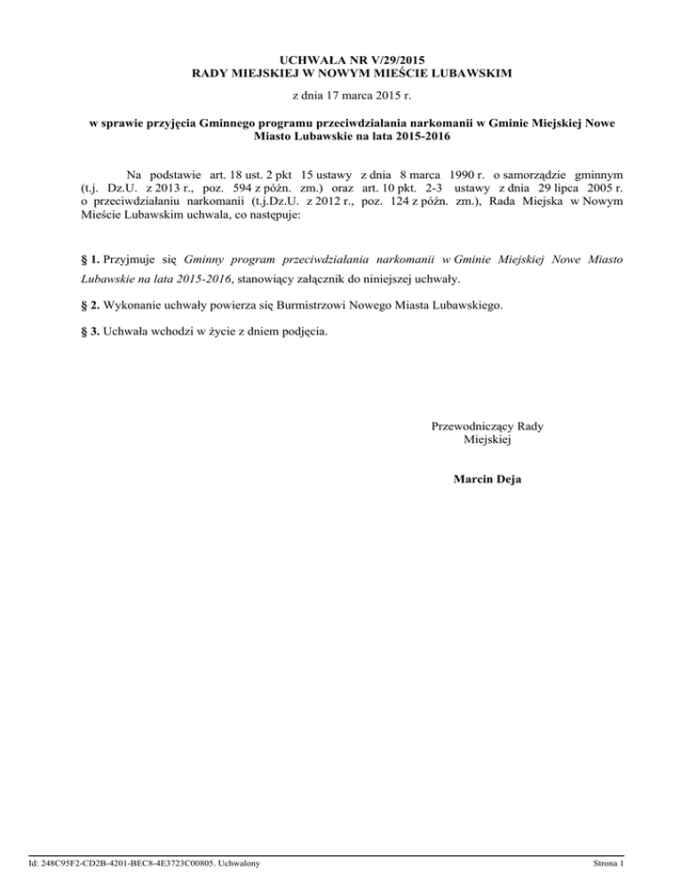 UCHWAŁA NR V/29/2015 RADY MIEJSKIEJ W NOWYM MIEŚCIE LUBAWSKIM z dnia 17 marca 2015 r. w sprawie przyjęcia Gminnego programu przeciwdziałania narkomanii w Gminie Miejskiej Nowe Miasto Lubawskie na lata 2015-2016 Na podstawie art. 18 ust. 2 pkt 15 ustawy z dnia 8 marca 1990 r. o samorządzie gminnym (t.j. Dz.U. z 2013 r., poz. 594 z późn. zm.) oraz art. 10 pkt. 2-3 ustawy z dnia 29 lipca 2005 r. o przeciwdziałaniu narkomanii (t.j.Dz.U. z 2012 r., poz. 124 z późn. zm.), Rada Miejska w Nowym Mieście Lubawskim uchwala, co następuje: § 1. Przyjmuje się Gminny program przeciwdziałania narkomanii w Gminie Miejskiej Nowe Miasto Lubawskie na lata 2015-2016, stanowiący załącznik do niniejszej uchwały. § 2. Wykonanie uchwały powierza się Burmistrzowi Nowego Miasta Lubawskiego. § 3. Uchwała wchodzi w życie z dniem podjęcia. Przewodniczący Rady Miejskiej Marcin Deja Id: 248C95F2-CD2B-4201-BEC8-4E3723C00805. Uchwalony Strona 1 Załącznik do uchwały Nr V/29/2015 Rady Miejskiej w Nowym Mieście Lubawskim z dnia 17 marca 2015 r. GMINNY PROGRAM PRZECIWDZIAŁANIA NARKOMANII W GMINIE MIEJSKIEJ NOWE MIASTO LUBAWSKIE NA LATA 2015-2016 Rozdział 1. Założenia ogólne § 1. 1. Gminny program przeciwdziałania narkomanii w Gminie Miejskiej Nowe Miasto Lubawskie na lata 2015-2016, zwany dalej „Programem” jest podstawowym dokumentem określającym zakres i sposób realizacji działań z zakresu profilaktyki i przeciwdziałania narkomanii na terenie Gminy Miejskiej Nowe Miasto Lubawskie i stanowi kontynuację zadań realizowanych w latach ubiegłych. 2. Realizując zadania określone w Programie należy przestrzegać zasad określonych w przepisach prawa, w tym w szczególności Ustawy o przeciwdziałaniu Narkomanii z dnia 29 lipca 2005r. (Dz. U. 2012, poz. 124). Podstawą prawną działań związanych z profilaktyką narkomanii jest ustawa z dnia 29 lipca 2005 r. o przeciwdziałaniu narkomanii, która zgodnie z art.10 określa obowiązki gminy w szczególności w zakresie: 1) zwiększania dostępności pomocy terapeutycznej i rehabilitacyjnej dla osób uzależnionych i osób zagrożonych uzależnieniem, 2) udzielania rodzinom, w których występują problemy narkomanii, pomocy psychospołecznej i prawnej, 3) prowadzenia profilaktycznej działalności informacyjnej, edukacyjnej oraz szkoleniowej w zakresie rozwiązywania problemów narkomanii, w szczególności dla dzieci i młodzieży, w tym prowadzenie zajęć sportowo-rekreacyjnych dla uczniów, a także działań na rzecz dożywiania dzieci uczestniczących w pozalekcyjnych programach opiekuńczo-wychowawczych i socjoterapeutycznych; 4) wspomagania działań instytucji, organizacji pozarządowych i osób fizycznych, służących rozwiązywaniu problemów narkomanii; 5) pomocy społecznej osobom uzależnionym i rodzinom osób uzależnionych dotkniętym ubóstwem i wykluczeniem społecznym i integrowanie ze środowiskiem lokalnym tych osób z wykorzystaniem pracy socjalnej i kontraktu socjalnego. 3. Gminny Program Przeciwdziałania Narkomanii dla Gminy Miejskiej Nowe Miasto Lubawskie na lata 2015 – 2016, będący częścią Strategii Rozwiązywania Problemów Społecznych w Mieście Nowe Miasto Lubawskie do roku 2015 - przyjętej Uchwałą Nr XXXIV/272/05 Rady Miejskiej w Nowym Mieście Lubawskim dnia 13.06.2005 roku. Id: 248C95F2-CD2B-4201-BEC8-4E3723C00805. Uchwalony Strona 1 4. Gminny Program Przeciwdziałania Narkomanii dla Gminy Miejskiej Nowe Miasto Lubawskie na lata 2015 – 2016, zwany dalej Programem, reguluje prowadzenie działań związanych z profilaktyką i przeciwdziałaniem narkomanii. Podstawą działań przedstawionych w Programie są założenia zawarte w Krajowym Programie Przeciwdziałania Narkomanii na lata 2012 – 2016, Strategii antynarkotykowej UE na lata 2013-2020. oraz w Wojewódzkim Programie Przeciwdziałania Narkomanii w Województwie Warmińsko-Mazurskim na lata 2013-2017. 5. Misja Programu „Inspirujemy, podejmujemy oraz wzmacniamy działania,które pomogą nam skutecznie przeciwdziałać uzależnieniom od narkotyków”. Rozdział 2. Cele Programu § 2. 1. Głównym celem Programu jest przeciwdziałanie powstawaniu uzależnień, szczególnie związanych z narkotykami. Założeniem Programu jest również promocja zdrowego stylu życia i rozbudzenie wśród dzieci i młodzieży zainteresowania różnymi formami aktywności, w tym sportowej i artystycznej, jako alternatywy wobec różnego rodzaju uzależnień, szczególnie sięgania po środki odurzające, narkotyki czy dopalacze, którym bardzo często towarzyszy wzrost agresji, a nawet przemoc w rodzinie oraz inne zjawiska patologiczne. 2. Program jest ukierunkowany na działania o charakterze edukacyjno-korekcyjnym dla osób uzależnionych i terapeutyczno-wspomagające dla osób współuzależnionych od narkotyków czy innych środków psychoaktywnych. § 3. Podstawowe założenie określone w § 2 Programu należy realizować przede wszystkim poprzez: 1) Skoordynowanie działań lokalnych podmiotów działających na rzecz walki z narkomanią. 2) Uwrażliwienie społeczności lokalnej na problem uzależnienia od narkotyków i środków psychoaktywnych. 3) Podnoszenie kwalifikacji i kompetencji kadr w zakresie uzależnień. 4) Prowadzenie badań i monitoringu problemów związanych z narkomanią. Rozdział 3. Realizatorzy Programu § 4. Realizatorami Programu są: 1) Miejski Ośrodek Pomocy Społecznej w Nowym Mieście Lubawskim, 2) Gmina Miejska /Miejska Komisja Rozwiązywania Problemów Alkoholowych w Nowym Mieście Lubawskim, 3) Miejska Biblioteka Publiczna im. M. Bogusławskiej w Nowym Mieście Lubawskim, 4) Miejskie Centrum Kultury w Nowym Mieście Lubawskim 5) Gminne placówki oświatowe oraz Zespół Szkół im. C.K.Norwida w Nowym Mieście Lubawskim i Zespół Szkół Zawodowych w Kurzętniku, Id: 248C95F2-CD2B-4201-BEC8-4E3723C00805. Uchwalony Strona 2 6) Straż Miejska w Nowym Mieście Lubawskim – komórka organizacyjna Urzędu Miejs