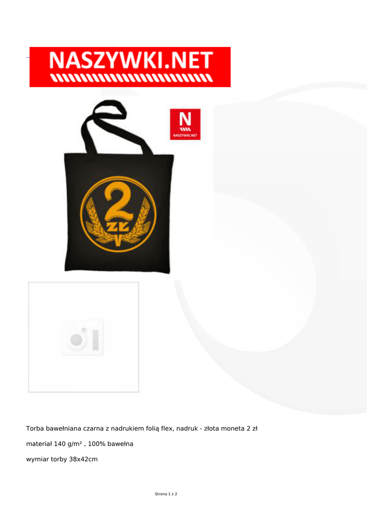 Torba bawełniana czarna z nadrukiem folią flex, nadruk - złota moneta 2 zł materiał 140 g/m² , 100% bawełna wymiar torby 38x42cm Strona 1 z 2 ucho - ok.70cm Strona 2 z 2