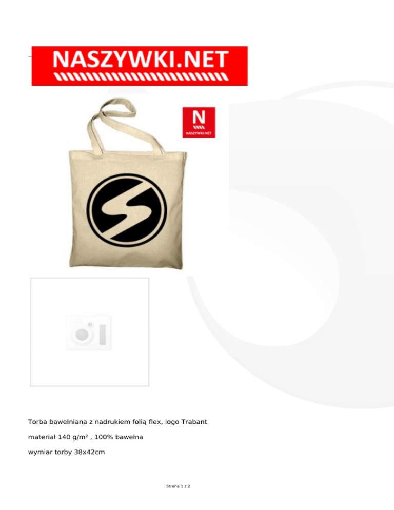 Torba bawełniana z nadrukiem folią flex, logo Trabant materiał 140 g/m² , 100% bawełna wymiar torby 38x42cm Strona 1 z 2 ucho - ok.70cm Strona 2 z 2