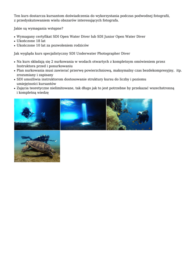 Ten kurs dostarcza kursantom doświadczenia do wykorzystania podczas podwodnej fotografii, z przedyskutowaniem wielu obszarów interesujących fotografa. Jakie są wymagania wstępne? ● ● ● Wymagany certyfikat SDI Open Water Diver lub SDI Junior Open Water Diver Ukończone 18 lat Ukończone 10 lat za pozwoleniem rodziców Jak wygląda kurs specjalistyczny SDI Underwater Photographer Diver ● ● ● ● Na kurs składają się 2 nurkowania w wodach otwartych z kompletnym omówieniem przez Instruktora przed i ponurkowaniu Plan nurkowania musi zawierać przerwę powierzchniową, maksymalny czas bezdekompresyjny, itp. zrozumiany i zapisany SDI umożliwia instruktorom dostosowanie struktury kursu do liczby i poziomu umiejętności kursantów Zajęcia teoretyczne nielimitowane, tak długo jak to jest potrzebne by przekazać wszechstronną i kompletną wiedzę