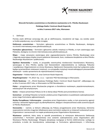 Warunki formalne uczestnictwa w charakterze wystawców w 21. Pikniku Naukowym Polskiego Radia i Centrum Nauki Kopernik, w dniu 3 czerwca 2017 roku, Warszawa 1. Definicje: Poniżej użyte definicje oznaczają tak, jak je zdefiniowano, niezależnie od tego, czy zostały użyte w liczbie pojedynczej, czy w liczbie mnogiej. Deklaracja uczestnictwa – formularz zgłoszenia uczestnictwa w Pikniku Naukowym, dostępny na stronie internetowej www.pikniknaukowy.pl; Formularz zgłoszeniowy – formularz zgłoszenia udziału instytucji w Pikniku, w tym zawierający opis Pokazów, dostępny na stronie internetowej www.pikniknaukowy.pl; Mapa – mapa sytuacyjna zawierająca plan zagospodarowania terenu Pikniku Naukowego wraz z legendą zawierającą między innymi położenie Stanowisk, Scen, rozdawana bezpłatnie w dniu Pikniku Naukowego Wystawcom i publiczności; Opiekun Stanowiska – osoba, w przypadku ewentualnej nieobecności Koordynatora Wystawcy, sprawująca w dniu Pikniku opiekę nad Stanowiskiem odpowiedzialna za realizację Pokazów i współpracę z Organizatorem ze strony Wystawcy; Opiekunem Stanowiska może być wyłącznie osoba będąca pracownikiem etatowym instytucji, a w przypadku instytucji niezatrudniających pracowników etatowych – osoba uprawniona do reprezentowania instytucji; Organizator – Polskie Radio S.A. oraz Centrum Nauki Kopernik; Współorganizator – PL.2012+ Sp. z o.o. – operator PGE Narodowego w Warszawie; Piknik Naukowy – 21. „Piknik Naukowy Polskiego Radia i Centrum Nauki Kopernik”, odbywający się w dniu 3 czerwca 2017 roku, w Warszawie na PGE Narodowym; Pokaz – przygotowany przez Wystawców program o charakterze naukowym, popularnonaukowym, edukacyjnym lub artystycznym; Scena – miejsce prezentacji Pokazu (o ile w danej edycji Pikniku jest przewidziana Scena); Scenariusz – przebieg Pokazów na Scenie ustalony przez Organizatora na podstawie zaakceptowanych przez niego Formularzy zgłoszeniowych; Służby Porządkowe i Informacyjne – powołane przez Organizatora osoby, w tym pracownicy agencji ochrony i stewardzi legitymujące się identyfikatorem, dbające o bezpieczeństwo osób uczestniczących w Pikniku Naukowym; Stanowisko – namiot, w którym odbywają się Pokazy przygotowane przez Wystawcę; elementy wyposażenia namiotu mogą być składowane poza namiotem wyłącznie w miejscach wskazanych przez Organizatora i zaznaczonych na mapie przekazanej przez Organizatora Wystawcom; Wystawca– podmiot, który złoży w sposób przewidziany w niniejszym dokumencie Deklarację uczestnictwa i Formularz zgłoszeniowy oraz zostanie zaakceptowany przez Organizatora jako Wystawca Pikniku Naukowego. Wstępna akceptacja następuje w formie elektronicznej i polega na przesłaniu e-maila do koordynatora, wskazanego w Formularzu zgłoszeniowym, z informacją Strona 1 z 6 o akceptacji udziału Wystawcy; potwierdzenie zakwalifikowania do udziału w Pikniku zostanie przekazane przez Organizatora w formie pisemnej. Koordynator Wystawcy – osoba odpowiedzialna za zorganizowanie Pokazów i współpracę z Organizatorem ze strony Wystawcy; musi to być pracownik etatowy instytucji, a w przypadku instytucji niezatrudniających osób na etacie – osoba uprawniona do reprezentowania instytucji; Zespół Organizacyjny – zespół realizujący działania związane z organizacją Pikniku Naukowego, powołany przez Organizatora; 2. W celu zgłoszenia uczestnictwa w 21. Pikniku Naukowym oraz w celu zaprezentowania Pokazów jako Wystawca, należy: a) wypełnić w sposób czytelny i wyczerpujący „Deklarację uczestnictwa”, dostępną na stronie internetowej www.pikniknaukowy.pl i dostarczyć ją do dnia 16 grudnia 2016 r. (decyduje data stempla pocztowego), do siedziby CNK z podpisem kierownika instytucji albo innej osoby umocowanej do reprezentowania instytucji wraz z dokumentem z którego to wynika, na adres: PIKNIK NAUKOWY Centrum Nauki Kopernik ul. Wybrzeże Kościuszkowskie 20 00-390 Warszawa POLSKA UWAGA – niedostarczenie deklaracji w formie papierowej skutkuje odrzuceniem zgłoszenia ze względów formalnych b) wypełnić w sposób wyczerpujący „Formularz zgłoszeniowy” dostępny na stronie internetowej www.pikniknaukowy.pl i przesłać bezpośrednio ze strony internetowej www.pikniknaukowy.pl do dnia 16 grudnia 2016 roku do godz. 12.00. 3. Udział w celu zaprezentowania Pokazów na Pikniku Naukowym jest bezpłatny dla podmiotów, które zaproponują interesujące pokazy naukowe, popularnonaukowe, edukacyjne, artystyczne związane z tematyką Pikniku Naukowego po ich zaakceptowaniu i włączeniu do programu przez Organizatora. 4. Organizator przewiduje możliwość dofinansowania udziału w Pikniku. Szczegółowe zasady dofinansowania określają „Zasady dofinansowania przez Centrum Nauki Kopernik uczestnictwa w Pikniku Naukowym Polskiego Radia i Centrum Nauki Kopernik” dostępne na stronie internetowej www.pikniknaukowy.pl nie później niż od kwietnia 2017 r. 5. Organizator zastrzega sobie prawo odmówienia zgłaszającemu uczestnictwa w Pikniku Naukowym w celu prezentowania Pokazów, w szczególności, gdy Organizator uzna, iż: a) Pokazy nie będą miały charakteru naukowego, popularnonaukowego, edukacyjnego lub artystycznego; b) Pokazy stanowią zagrożenie bezpieczeństwa lub Organizatora/Współorganizatora; dla publiczności, Wystawcy c) Pokazy promują produkty lub rozwiązania konkretnego podmiotu. 6. Zgłaszający ma prawo do rezygnacji z uczestnictwa w Pikniku do 3 kwietnia 2017 r. . W przypadku zgłoszenia rezygnacji po tym terminie, a także w przypadku nieobecności podczas Pikniku, zostanie obciążony kwotą 1 000 zł netto tytułem części kosztów organizacji stanowiska na Pikniku. 7. Na Pikniku Naukowym obowiązuje zakaz reklamy podmiotów komercyjnych innych niż Sponsorzy/Patroni Pikniku Naukowego. Strona 2 z 6 8. W ramach organizacji Pikniku Naukowego Organizator i Współorganizator zapewnia: a) promocję i reklamę