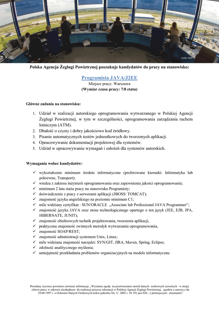 źródło: PAŻP Polska Agencja Żeglugi Powietrznej poszukuje kandydatów do pracy na stanowisko: Programista JAVA/J2EE Miejsce pracy: Warszawa (Wymiar czasu pracy: 7/8 etatu) Główne zadania na stanowisku: 1. Udział w realizacji autorskiego oprogramowania wytwarzanego w Polskiej Agencji 2. 3. 4. 5. Żeglugi Powietrznej, w tym w szczególności, oprogramowania zarządzania ruchem lotniczym (ATM). Dbałość o czysty i dobry jakościowo kod źródłowy. Pisanie automatycznych testów jednostkowych do tworzonych aplikacji. Opracowywanie dokumentacji projektowej dla systemów. Udział w opracowywaniu wymagań i założeń dla systemów autorskich. Wymagania wobec kandydatów: wykształcenie minimum średnie informatyczne (preferowane kierunki: Informatyka lub pokrewne, Transport); wiedza z zakresu inżynierii oprogramowania oraz zapewnienia jakości oprogramowania; minimum 2 lata stażu pracy na stanowisku Programisty; doświadczenie z pracy z serwerami aplikacji (JBOSS/ TOMCAT); znajomość języka angielskiego na poziomie minimum C1; mile widziany certyfikat : SUN/ORACLE „Associate lub Professional JAVA Programmer”; znajomość języka JAVA oraz stosu technologicznego opartego o ten język (JEE, EJB, JPA, HIBERNATE, JUNIT); znajomość obiektowych technik projektowania, tworzenia aplikacji, praktyczna znajomość zwinnych metodyk wytwarzania oprogramowania, znajomość SOAP/REST; znajomość administracji systemem Unix, Linux; mile widziana znajomość narzędzi: SVN/GIT, JIRA, Maven, Spring, Eclipse; zdolność analitycznego myślenia; umiejętność przekładania problemów organizacyjnych na modele informatyczne. Przesłany życiorys powinien zawierać informację: „Wyrażam zgodę na przetwarzanie moich danych osobowych zawartych w mojej ofercie pracy w zakresie niezbędnym do realizacji procesu rekrutacji w Polskiej Agencji Żeglugi Powietrznej, zgodnie z ustawą z dn. 29.08.1997 r. o Ochronie Danych Osobowych (tekst jednolity Dz. U. 2002 r. Nr 101 poz.926 , z późniejszymi zmianami)”. Oferujemy: zatrudnienie w oparciu o umowę o pracę na zastępstwo; przewidywany czas zastępstwa: do 31.12.2017 roku; równoważny system czasu pracy; bogaty pakiet benefitów; interesująca i rozwojowa domena; zatrudnienie w stabilnej firmie o wieloletniej tradycji. Zainteresowane osoby prosimy o przesłanie do dnia 28.02.2016r. życiorysu w języku polskim na adres: [email protected] z dopiskiem w tytule: APAD. Za wszystkie aplikacje dziękujemy. Informujemy, iż skontaktujemy się jedynie z wybranymi kandydatami. Przesłany życiorys powinien zawierać informację: „Wyrażam zgodę na przetwarzanie moich danych osobowych zawartych w mojej ofercie pracy w zakresie niezbędnym do realizacji procesu rekrutacji w Polskiej Agencji Żeglugi Powietrznej, zgodnie z ustawą z dn. 29.08.1997 r. o Ochronie Danych Osobowych (tekst jednolity Dz. U. 2002 r. Nr 101 poz.926 , z późniejszymi zmianami)”.