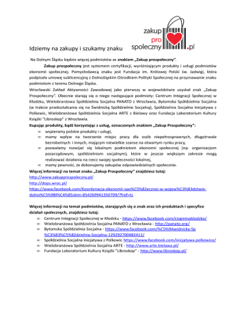 Idziemy na zakupy i szukamy znaku Na Dolnym Śląsku będzie więcej podmiotów ze znakiem „Zakup prospołeczny”. Zakup prospołeczny jest systemem certyfikacji, wyróżniającym produkty i usługi podmiotów ekonomii społecznej. Pomysłodawcą znaku jest Fundacja im. Królowej Polski św. Jadwigi, która podpisała umowę sublicencyjną z Dolnośląskim Ośrodkiem Polityki Społecznej na przyznawanie znaku podmiotom z terenu Dolnego Śląska. Wrocławski Zakład Aktywności Zawodowej jako pierwszy w województwie uzyskał znak „Zakup Prospołeczny”. Obecnie starają się o niego następujące podmioty: Centrum Integracji Społecznej w Kłodzku, Wielobranżowa Spółdzielnia Socjalna PANATO z Wrocławia, Bytomska Spółdzielnia Socjalna (w trakcie przekształcania się na Świdnicką Spółdzielnie Socjalną), Spółdzielnia Socjalna Inicjatywa z Polkowic, Wielobranżowa Spółdzielnia Socjalna ARTE z Bielawy oraz Fundacja Laboratorium Kultury Książki "Libroskop" z Wrocławia. Kupując produkty, bądź korzystając z usług, oznaczonych znakiem „Zakup Prospołeczny”: • wspieramy polskie produkty i usługi, • mamy wpływ na tworzenie miejsc pracy dla osób niepełnosprawnych, długotrwale bezrobotnych i innych, mającym niewielkie szanse na otwartym rynku pracy, • pozwalamy rozwijać się lokalnym podmiotom ekonomii społecznej (np. organizacjom pozarządowym, spółdzielniom socjalnym), które w jeszcze większym zakresie mogą realizować działania na rzecz swojej społeczności lokalnej, • mamy pewność, że dokonujemy zakupów odpowiedzialnych społecznie. Więcej informacji na temat znaku „Zakup Prospołeczny” znajdziesz tutaj: http://www.zakupprospoleczny.pl/ http://dops.wroc.pl/ https://www.facebook.com/Koordynacja-ekonomii-spo%C5%82ecznej-w-wojew%C3%B3dztwiedolno%C5%9Bl%C4%85skim-854269941350709/?fref=ts Więcej informacji na temat podmiotów, starających się o znak oraz ich produktach i specyfice działań społecznych, znajdziesz tutaj: • Centrum Integracji Społecznej w Kłodzku - https://www.facebook.com/cisgminaklodzko/ • Wielobranżowa Spółdzielnia Socjalna PANATO z Wrocławia - http://panato.org/ • Bytomska Spółdzielnia Socjalna - https://www.facebook.com/%C5%9Awidnicka-Sp %C3%B3%C5%82dzielnia-Socjalna-129292700482411/ • Spółdzielnia Socjalna Inicjatywa z Polkowic https://www.facebook.com/inicjatywa.polkowice/ • Wielobranżowa Spółdzielnia Socjalna ARTE - http://www.arte.bielawa.pl/ • Fundacja Laboratorium Kultury Książki "Libroskop" - http://www.libroskop.pl/