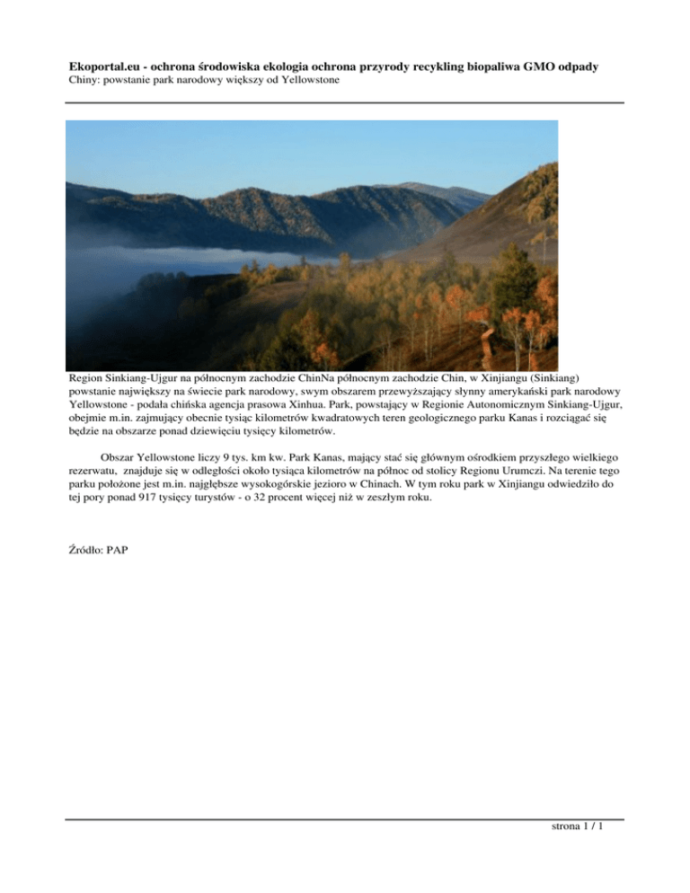 Ekoportal.eu - ochrona środowiska ekologia ochrona przyrody recykling biopaliwa GMO odpady Chiny: powstanie park narodowy większy od Yellowstone Region Sinkiang-Ujgur na północnym zachodzie ChinNa północnym zachodzie Chin, w Xinjiangu (Sinkiang) powstanie największy na świecie park narodowy, swym obszarem przewyższający słynny amerykański park narodowy Yellowstone - podała chińska agencja prasowa Xinhua. Park, powstający w Regionie Autonomicznym Sinkiang-Ujgur, obejmie m.in. zajmujący obecnie tysiąc kilometrów kwadratowych teren geologicznego parku Kanas i rozciągać się będzie na obszarze ponad dziewięciu tysięcy kilometrów. Obszar Yellowstone liczy 9 tys. km kw. Park Kanas, mający stać się głównym ośrodkiem przyszłego wielkiego rezerwatu, znajduje się w odległości około tysiąca kilometrów na północ od stolicy Regionu Urumczi. Na terenie tego parku położone jest m.in. najgłębsze wysokogórskie jezioro w Chinach. W tym roku park w Xinjiangu odwiedziło do tej pory ponad 917 tysięcy turystów - o 32 procent więcej niż w zeszłym roku. Źródło: PAP strona 1 / 1