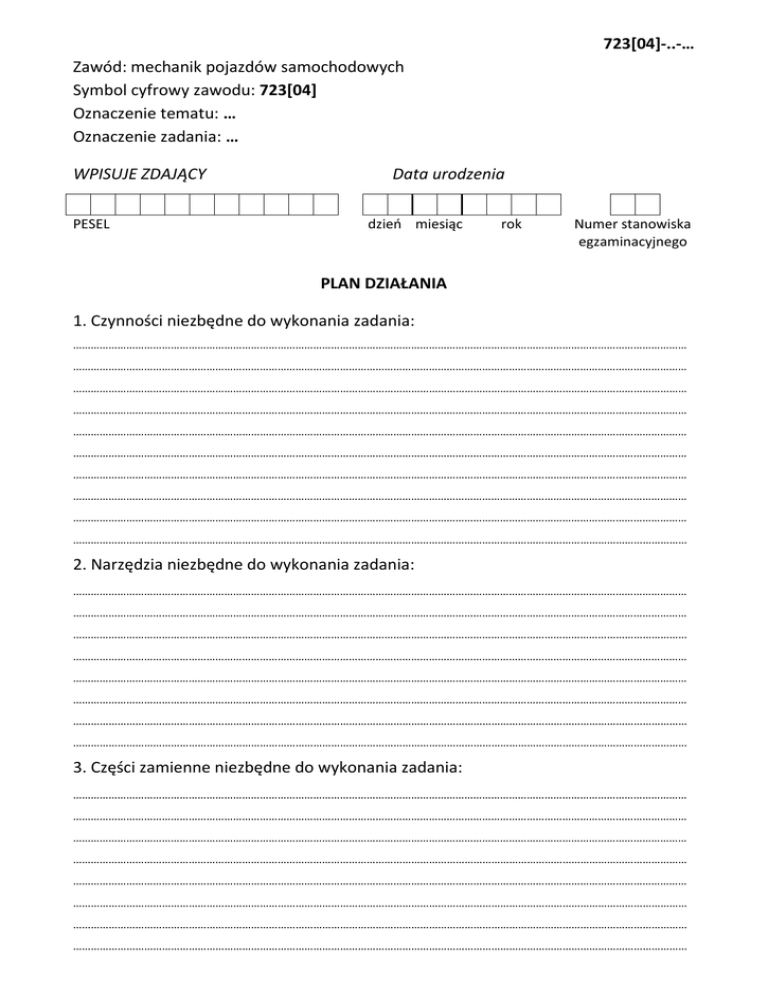 723[04]-..-… Zawód: mechanik pojazdów samochodowych Symbol cyfrowy zawodu: 723[04] Oznaczenie tematu: … Oznaczenie zadania: … WPISUJE ZDAJĄCY PESEL Data urodzenia dzieo miesiąc rok Numer stanowiska egzaminacyjnego PLAN DZIAŁANIA 1. Czynności niezbędne do wykonania zadania: ……………………………………………………………………………………………………………………………………………………………………………………… ……………………………………………………………………………………………………………………………………………………………………………………… ……………………………………………………………………………………………………………………………………………………………………………………… ……………………………………………………………………………………………………………………………………………………………………………………… ……………………………………………………………………………………………………………………………………………………………………………………… ……………………………………………………………………………………………………………………………………………………………………………………… ……………………………………………………………………………………………………………………………………………………………………………………… ……………………………………………………………………………………………………………………………………………………………………………………… ……………………………………………………………………………………………………………………………………………………………………………………… ……………………………………………………………………………………………………………………………………………………………………………………… 2. Narzędzia niezbędne do wykonania zadania: ……………………………………………………………………………………………………………………………………………………………………………………… ……………………………………………………………………………………………………………………………………………………………………………………… ……………………………………………………………………………………………………………………………………………………………………………………… ……………………………………………………………………………………………………………………………………………………………………………………… ……………………………………………………………………………………………………………………………………………………………………………………… ……………………………………………………………………………………………………………………………………………………………………………………… ……………………………………………………………………………………………………………………………………………………………………………………… ……………………………………………………………………………………………………………………………………………………………………………………… 3. Części zamienne niezbędne do wykonania zadania: ……………………………………………………………………………………………………………………………………………………………………………………… ……………………………………………………………………………………………………………………………………………………………………………………… ……………………………………………………………………………………………………………………………………………………………………………………… ……………………………………………………………………………………………………………………………………………………………………………………… ……………………………………………………………………………………………………………………………………………………………………………………… ……………………………………………………………………………………………………………………………………………………………………………………… ……………………………………………………………………………………………………………………………………………………………………………………… ………………………………………………………………………………………………………………………………………………………………………………………