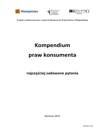 Projekt zrealizowano przy wsparciu finansowym Województwa Małopolskiego Kompendium praw konsumenta najczęściej zadawane pytania Bochnia 2015 Strona 1 z 8 Projekt zrealizowano przy wsparciu finansowym Województwa Małopolskiego Uwaga! Opracowanie uwzględnia stan prawny wynikający z ustawy o prawach konsumenta z 30 maja 2014 r. (Dz. U. poz. 827). Zgodnie z art. 51 ustawy, do umów zawartych przed dniem wejścia w życie tej ustawy (tj. przed 25 grudnia 2014 r.) stosuje się przepisy dotychczasowe. Treść poradnika ma zatem zastosowanie do umów zawartych począwszy od dnia 25 grudnia 2014 r. 1. Czy zawsze przy zakupie będziemy korzystać z uprawnień konsumenckich? Z uprawnień konsumenckich korzystamy tylko wtedy, gdy mamy status konsumentów. Wg kodeksu cywilnego za konsumenta uważa się osobę fizyczną dokonującą z przedsiębiorcą czynności prawnej niezwiązanej bezpośrednio z jej działalnością gospodarczą lub zawodową. Przykładowo można wskazać, że jeśli nie prowadzimy działalności gospodarczej czy zawodowej a drugą stroną zawieranej przez nas umowy nie jest przedsiębiorca, to nie mamy statusu konsumentów a co za tym idzie - nie możemy korzystać z uprawnień konsumenta. Nie oznacza to jednak, że w takiej sytuacji nie korzystamy z żadnej ochrony jako kupujący – nie możemy jednak korzystać z uprawnień na zasadach dotyczących konsumentów. 2. Czy z uprawnień konsumenckich korzystamy tylko przy zakupach? Nie. Status konsumenta nie jest ograniczony do zawierania umowy sprzedaży (potocznie nazywanej też umową zakupu lub kupna-sprzedaży). Ze statusu konsumenta możemy korzystać także w przypadku zawierania innych umów, np. zaciągając kredyt, zawierając umowę ubezpieczenia, oddając rzeczy do pralni, zawierając umowę na usługi telekomunikacyjne, zawierając umowę o dostawę energii elektrycznej, itd. 3. Czy jak kupujemy w sklepie jakąś rzecz to zawsze możemy korzystać z gwarancji ? Aby odpowiedzieć na to pytanie, musimy najpierw zaznaczyć, że odpowiedzialność sprzedawcy z tytułu gwarancji a odpowiedzialność z tytułu rękojmi to co innego. Przede wszystkim o ile odpowiedzialność sprzedawcy wobec konsumenta z tytułu rękojmi wynika wprost z ustawy i jest w zasadzie obligatoryjna, to odpowiedzialność gwaranta z tytułu gwarancji jest nieobowiązkowa i występuje tylko wtedy gdy gwarancji udzielono. Jeśli więc nie udzielono nam gwarancji – nie możemy z niej skorzystać. Możemy natomiast wówczas, na zasadach określonych kodeksem cywilnym, korzystać z uprawnień, jakie daje nam rękojmia. Strona 2 z 8 Projekt zrealizowano przy wsparciu finansowym Województwa Małopolskiego 4. Czy jeśli udzielono nam gwarancji, możemy korzystać z uprawnień wynikających z rękojmi ? Tak. Udzielenie gwarancji nie powoduje wyłączenia odpowiedzialności z tytułu rękojmi. Kupujący może wykonywać uprawnienia z tytułu rękojmi za wady fizyczne rzeczy niezależnie od uprawnień wynikających z gwarancji. Wykonanie uprawnień z gwarancji nie wpływa na odpowiedzialność sprzedawcy z tytułu rękojmi. O tym, z której drogi skorzystać, jeśli zakupiony produkt nie spełnia oczekiwań – decyduje zawsze konsument. 5. W jaki sposób można udzielić gwarancji? Czy niezbędny jest do tego dokument gwarancyjny? Gwarancji można udzielić nie tylko poprzez wydanie dokumentu gwarancyjnego. Oświadczenie gwarancyjne może być złożone także w innej formie, np. w reklamie. 6. Czy musimy posiadać paragon, aby móc składać reklamację? Posiadanie paragonu nie jest konieczne do korzystania z uprawnień, jakie daje nam rękojmia przy sprzedaży. Żadna ustawa nie wymaga aby prawo konsumenta do korzystania uprawnień wynikających z rękojmi było uzależnione od posiadania paragonu. Sprzedawca może jednak żądać od konsumenta udowodnienia zakupu. Najprościej to udowodnić, właśnie przedstawiając paragon. Można to jednak zrobić także w inny sposób, np. za pomocą zeznań świadków, którymi mogą być także członkowie najbliższej rodziny. 7. Czy do składania reklamacji niezbędne jest posiadanie oryginalnego opakowania ? Oryginalne opakowanie (np. pudełko) nie jest konieczne do korzystania z uprawnień przysługujących nam z tytułu rękojmi. Wymóg posiadania oryginalnego opakowania nie jest jednak wykluczony w przypadku warunków korzystania z uprawnień gwarancyjnych. 8. Czy możemy składać reklamacje tylko wtedy gdy przedmiot jest zepsuty ? Uprawnienia z tytułu rękojmi konsument może realizować w przypadku wady fizycznej lub wady prawnej. Wada prawna wystąpi np. wówczas gdy rzecz sprzedana jest własnością osoby trzeciej. Wada fizyczna polega z reguły na niezgodności rzeczy sprzedanej z umową, np. jeżeli rzecz sprzedana: Strona 3 z 8 Projekt zrealizowano przy wsparciu finansowym Województwa Małopolskiego nie ma właściwości, które rzecz tego rodzaju powinna mieć ze względu na cel w umowie oznaczony albo wynikaj z okoliczności lub przeznaczenia; nie ma właściwości, o których istnieniu sprzedawca zapewnił kupującego, w tym przedstawiając próbkę lub wzór; nie nadaje się do celu, o którym kupujący poinformował sprzedawcę przy zawarciu umowy, a sprzedawca nie zgłosił zastrzeżenia co do takiego jej przeznaczenia; została kupującemu wydana w stanie niezupełnym. Wada fizyczna rzeczy w rozumieniu przepisów o rękojmi przy sprzedaży nie musi zatem oznaczać wadliwości w powszechnie rozumianym znaczeniu. Jeśli np. sprzedawca zapewnia nas, że kupujemy płaszcz nieprzemakalny, który jednak okazuje się nieodporny na deszcz – występuje wówczas wada fizyczna rzeczy, a co za tym idzie – podstawa do składania reklamacji. 9. Kupiłem rzecz która w chwili zakupu nie budziła zastrzeżeń, jednak zepsuła się po kilku tygodniach normalnego używania. Czy mam szansę na pozytywne rozpatrzenie reklamacji? Sprzedawca jest odpowiedzialny z tytułu rękojmi za wady fizyczne, kt