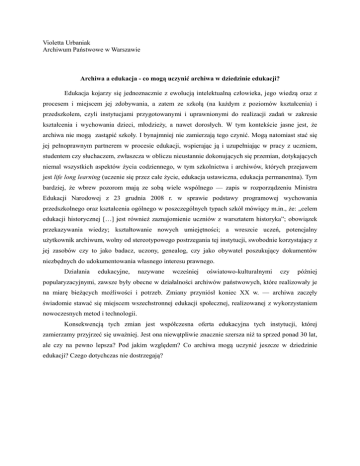 Violetta Urbaniak Archiwum Państwowe w Warszawie Archiwa a edukacja - co mogą uczynić archiwa w dziedzinie edukacji? Edukacja kojarzy się jednoznacznie z ewolucją intelektualną człowieka, jego wiedzą oraz z procesem i miejscem jej zdobywania, a zatem ze szkołą (na każdym z poziomów kształcenia) i przedszkolem, czyli instytucjami przygotowanymi i uprawnionymi do realizacji zadań w zakresie kształcenia i wychowania dzieci, młodzieży, a nawet dorosłych. W tym kontekście jasne jest, że archiwa nie mogą zastąpić szkoły. I bynajmniej nie zamierzają tego czynić. Mogą natomiast stać się jej pełnoprawnym partnerem w procesie edukacji, wspierając ją i uzupełniając w pracy z uczniem, studentem czy słuchaczem, zwłaszcza w obliczu nieustannie dokonujących się przemian, dotykających niemal wszystkich aspektów życia codziennego, w tym szkolnictwa i archiwów, których przejawem jest life long learning (uczenie się przez całe życie, edukacja ustawiczna, edukacja permanentna). Tym bardziej, że wbrew pozorom mają ze sobą wiele wspólnego — zapis w rozporządzeniu Ministra Edukacji Narodowej z 23 grudnia 2008 r. w sprawie podstawy programowej wychowania przedszkolnego oraz kształcenia ogólnego w poszczególnych typach szkół mówiący m.in., że: „celem edukacji historycznej […] jest również zaznajomienie uczniów z warsztatem historyka”; obowiązek przekazywania wiedzy; kształtowanie nowych umiejętności; a wreszcie uczeń, potencjalny użytkownik archiwum, wolny od stereotypowego postrzegania tej instytucji, swobodnie korzystający z jej zasobów czy to jako badacz, uczony, genealog, czy jako obywatel poszukujący dokumentów niezbędnych do udokumentowania własnego interesu prawnego. Działania edukacyjne, nazywane wcześniej oświatowo-kulturalnymi czy później popularyzacyjnymi, zawsze były obecne w działalności archiwów państwowych, które realizowały je na miarę bieżących możliwości i potrzeb. Zmiany przyniósł koniec XX w. — archiwa zaczęły świadomie stawać się miejscem wszechstronnej edukacji społecznej, realizowanej z wykorzystaniem nowoczesnych metod i technologii. Konsekwencją tych zmian jest współczesna oferta edukacyjna tych instytucji, której zamierzamy przyjrzeć się uważniej. Jest ona niewątpliwie znacznie szersza niż ta sprzed ponad 30 lat, ale czy na pewno lepsza? Pod jakim względem? Co archiwa mogą uczynić jeszcze w dziedzinie edukacji? Czego dotychczas nie dostrzegają?