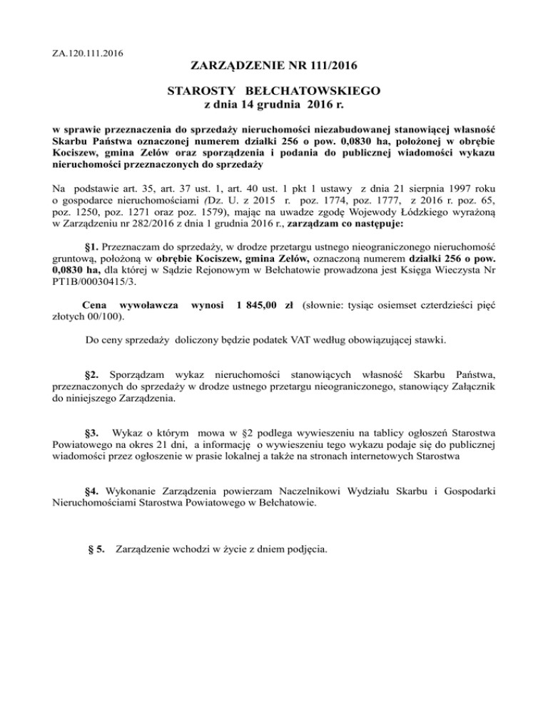 ZA.120.111.2016 ZARZĄDZENIE NR 111/2016 STAROSTY BEŁCHATOWSKIEGO z dnia 14 grudnia 2016 r. w sprawie przeznaczenia do sprzedaży nieruchomości niezabudowanej stanowiącej własność Skarbu Państwa oznaczonej numerem działki 256 o pow. 0,0830 ha, położonej w obrębie Kociszew, gmina Zelów oraz sporządzenia i podania do publicznej wiadomości wykazu nieruchomości przeznaczonych do sprzedaży Na podstawie art. 35, art. 37 ust. 1, art. 40 ust. 1 pkt 1 ustawy z dnia 21 sierpnia 1997 roku o gospodarce nieruchomościami (Dz. U. z 2015 r. poz. 1774, poz. 1777, z 2016 r. poz. 65, poz. 1250, poz. 1271 oraz poz. 1579), mając na uwadze zgodę Wojewody Łódzkiego wyrażoną w Zarządzeniu nr 282/2016 z dnia 1 grudnia 2016 r., zarządzam co następuje: §1. Przeznaczam do sprzedaży, w drodze przetargu ustnego nieograniczonego nieruchomość gruntową, położoną w obrębie Kociszew, gmina Zelów, oznaczoną numerem działki 256 o pow. 0,0830 ha, dla której w Sądzie Rejonowym w Bełchatowie prowadzona jest Księga Wieczysta Nr PT1B/00030415/3. Cena wywoławcza złotych 00/100). wynosi 1 845,00 zł (słownie: tysiąc osiemset czterdzieści pięć Do ceny sprzedaży doliczony będzie podatek VAT według obowiązującej stawki. §2. Sporządzam wykaz nieruchomości stanowiących własność Skarbu Państwa, przeznaczonych do sprzedaży w drodze ustnego przetargu nieograniczonego, stanowiący Załącznik do niniejszego Zarządzenia. §3. Wykaz o którym mowa w §2 podlega wywieszeniu na tablicy ogłoszeń Starostwa Powiatowego na okres 21 dni, a informację o wywieszeniu tego wykazu podaje się do publicznej wiadomości przez ogłoszenie w prasie lokalnej a także na stronach internetowych Starostwa §4. Wykonanie Zarządzenia powierzam Naczelnikowi Wydziału Skarbu i Gospodarki Nieruchomościami Starostwa Powiatowego w Bełchatowie. § 5. Zarządzenie wchodzi w życie z dniem podjęcia.