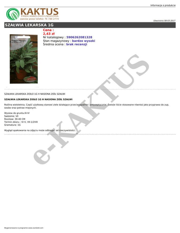 Informacje o produkcie Utworzono 08-03-2017 SZAŁWIA LEKARSKA 1G Cena : 2,43 zł AK TU S Nr katalogowy : 5906262081328 Stan magazynowy : bardzo wysoki Średnia ocena : brak recenzji SZAŁWIA LEKARSKA ZIOŁO 1G H NASIONA ZIÓŁ SZAŁWI SZAŁWIA LEKARSKA ZIOŁO 1G H NASIONA ZIÓŁ SZAŁWI Roślina wieloletnia. Część użytkową stanowi ziele działające przeciwzapalnie i antyseptycznie. Świeże liście stosowane również jako przyprawa do zup, sosów oraz potraw mięsnych. Wysiew do gruntu:III-IV Sadzenie: VII Rozstaw: 30-40 CM Termin zbioru : IV-V, VII-1/2VIII Gramatura: 1G eK Wygląd opakowania na zdjęciu może odbiegać od rzeczywistości. Wygenerowano w programie www.oscGold.com