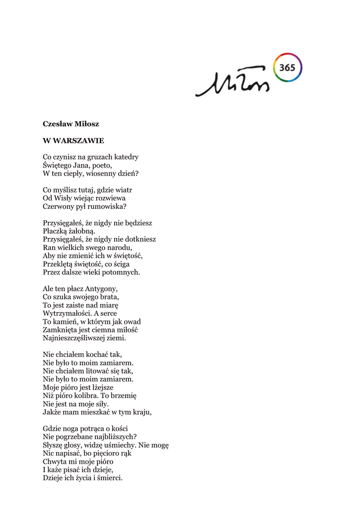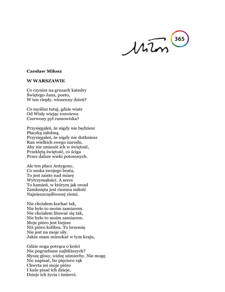Czesław Miłosz W WARSZAWIE Co czynisz na gruzach katedry Świętego Jana, poeto, W ten ciepły, wiosenny dzień? Co myślisz tutaj, gdzie wiatr Od Wisły wiejąc rozwiewa Czerwony pył rumowiska? Przysięgałeś, że nigdy nie będziesz Płaczką żałobną. Przysięgałeś, że nigdy nie dotkniesz Ran wielkich swego narodu, Aby nie zmienić ich w świętość, Przeklętą świętość, co ściga Przez dalsze wieki potomnych. Ale ten płacz Antygony, Co szuka swojego brata, To jest zaiste nad miarę Wytrzymałości. A serce To kamień, w którym jak owad Zamknięta jest ciemna miłość Najnieszczęśliwszej ziemi. Nie chciałem kochać tak, Nie było to moim zamiarem. Nie chciałem litować się tak, Nie było to moim zamiarem. Moje pióro jest lżejsze Niż pióro kolibra. To brzemię Nie jest na moje siły. Jakże mam mieszkać w tym kraju, Gdzie noga potrąca o kości Nie pogrzebane najbliższych? Słyszę głosy, widzę uśmiechy. Nie mogę Nic napisać, bo pięcioro rąk Chwyta mi moje pióro I każe pisać ich dzieje, Dzieje ich życia i śmierci. Czyż na to jestem stworzony, By zostać płaczką żałobną? Ja chcę opiewać festyny, Radosne gaje, do których Wprowadzał mnie Szekspir. Zostawcie Poetom chwilę radości, Bo zginie wasz świat. Szaleństwo tak żyć bez uśmiechu I dwa powtarzać wyrazy Zwrócone do was, umarli, Do was, których udziałem Miało być wesele Czynów myśli i ciała, pieśni, uczt. Dwa ocalone wyrazy: Prawda i sprawiedliwość. Ocalenie, 1945