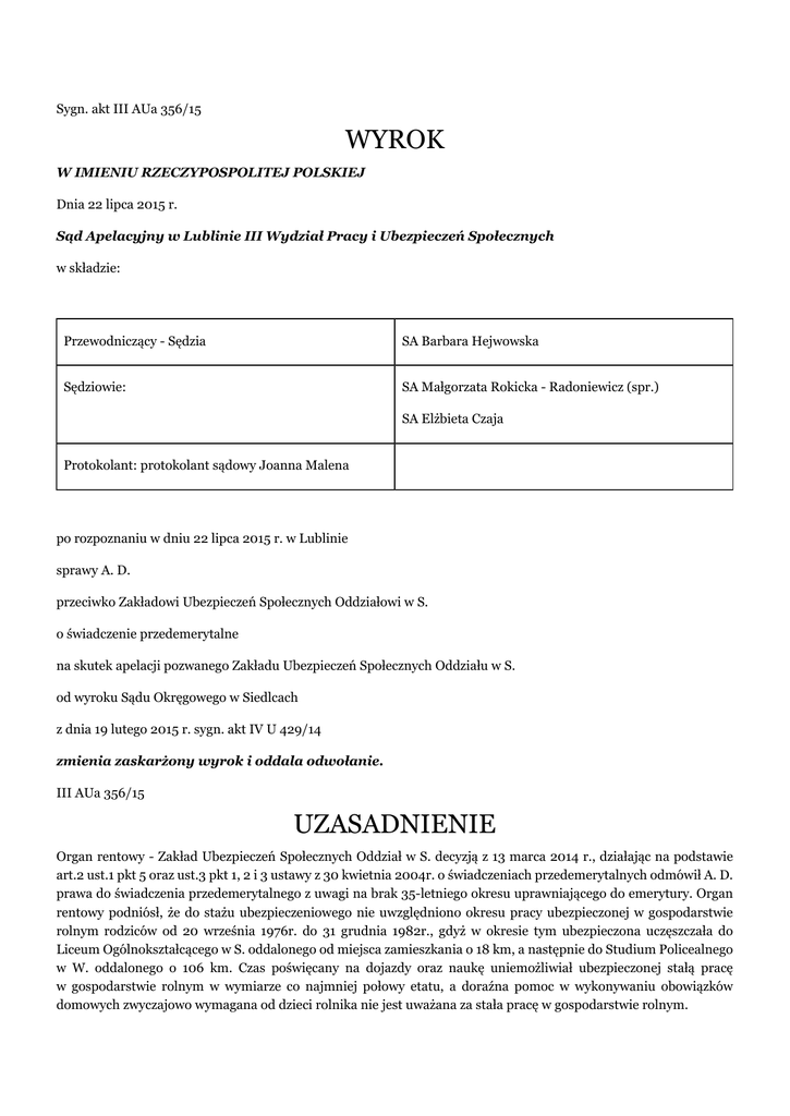 Sygn. akt III AUa 356/15 WYROK W IMIENIU RZECZYPOSPOLITEJ POLSKIEJ Dnia 22 lipca 2015 r. Sąd Apelacyjny w Lublinie III Wydział Pracy i Ubezpieczeń Społecznych w składzie: Przewodniczący - Sędzia SA Barbara Hejwowska Sędziowie: SA Małgorzata Rokicka - Radoniewicz (spr.) SA Elżbieta Czaja Protokolant: protokolant sądowy Joanna Malena po rozpoznaniu w dniu 22 lipca 2015 r. w Lublinie sprawy A. D. przeciwko Zakładowi Ubezpieczeń Społecznych Oddziałowi w S. o świadczenie przedemerytalne na skutek apelacji pozwanego Zakładu Ubezpieczeń Społecznych Oddziału w S. od wyroku Sądu Okręgowego w Siedlcach z dnia 19 lutego 2015 r. sygn. akt IV U 429/14 zmienia zaskarżony wyrok i oddala odwołanie. III AUa 356/15 UZASADNIENIE Organ rentowy - Zakład Ubezpieczeń Społecznych Oddział w S. decyzją z 13 marca 2014 r., działając na podstawie art.2 ust.1 pkt 5 oraz ust.3 pkt 1, 2 i 3 ustawy z 30 kwietnia 2004r. o świadczeniach przedemerytalnych odmówił A. D. prawa do świadczenia przedemerytalnego z uwagi na brak 35-letniego okresu uprawniającego do emerytury. Organ rentowy podniósł, że do stażu ubezpieczeniowego nie uwzględniono okresu pracy ubezpieczonej w gospodarstwie rolnym rodziców od 20 września 1976r. do 31 grudnia 1982r., gdyż w okresie tym ubezpieczona uczęszczała do Liceum Ogólnokształcącego w S. oddalonego od miejsca zamieszkania o 18 km, a następnie do Studium Policealnego w W. oddalonego o 106 km. Czas poświęcany na dojazdy oraz naukę uniemożliwiał ubezpieczonej stałą pracę w gospodarstwie rolnym w wymiarze co najmniej połowy etatu, a doraźna pomoc w wykonywaniu obowiązków domowych zwyczajowo wymagana od dzieci rolnika nie jest uważana za stała pracę w gospodarstwie rolnym. Od tej decyzji odwołanie do Sądu Okręgowego w Siedlcach złożyła A. D. wnosząc o jej zmianę i przyznanie jej prawa do świadczenia przedemerytalnego. W uzasadnieniu stanowiska podniosła, że wbrew ustaleniom organu rentowego we wskazanym okresie stale pracowała w gospodarstwie rolnym rodziców i to zarówno przed wyjazdem do szkoły, jak i po powrocie ze szkoły, a także w każdy dzień wolny od nauki, w święta, wakacje, ferie. Odległość jaką pokonywała jeżdżąc do szkoły nie uniemożliwiała jej pracy w gospodarstwie. Sąd Okręgowy w Siedlcach wyrokiem z dnia 19 lutego 2015 roku zmienił zaskarżoną decyzją i przyznał A. D. prawo do świadczenia przedemerytalnego od dnia 5 marca 2014 roku. Sąd Okręgowy ustalił, że A. D. mając ukończony 52. rok życia, w dniu (...) wystąpiła z wnioskiem o świadczenie przedemerytalne. Na podstawie przedłożonych do wniosku dokumentów organ rentowy ustalił, że do 30 czerwca 2013r. ,tj. do dnia rozwiązania ostatniej umowy o pracę z przyczyn dotyczących zakładu pracy, ubezpieczona udowodniła okres składkowy i nieskładkowy w wymiarze 30 lat, 5 miesięcy i 24 dni miesięcy. Rozpatrując uprawnienia do świadczenia organ rentowy nie uwzględnił okresu pracy ubezpieczonej w gospodarstwie rolnym rodziców od 26 czerwca 1976 r. do 1 lutego 1983 r. z uwagi na trwającą w tym okresie naukę ubezpieczonej w Liceum Ogólnokształcącym w S., a następnie w Studium Policealnym w W. i związane z tym dojazdy do szkoły oraz konieczność nauki w domu. Ubezpieczona pozostawała w zatrudnieniu w (...) Przedsiębiorstwie (...) Spółce z ograniczoną odpowiedzialnością w S.. Zatrudnienie to trwało w okresie od 1 lutego 1983r. do 30 czerwca 2013r. i ustało na skutek wypowiedzenia przez pracodawcę z przyczyn niedotyczących pracownika. Od 1 lipca 2013 r. ubezpieczona zarejestrowana jest jako osoba bezrobotna, obecnie bez prawa do zasiłku dla bezrobotnych, który pobierała przez ponad 6 miesięcy – w okresie od 1 lipca 2013r. do 10 lutego 2014 r. Od chwili zarejestrowania ubezpieczona nie odmówiła propozycji pracy. Na datę rozwiązania stosunku pracy ubezpieczona udowodniła okres składkowy i nieskładkowy z tytułu zatrudnienia w (...) Przedsiębiorstwie (...) Spółce z ograniczoną odpowiedzialnością w S. w wymiarze 30 lat, 5 miesięcy i 24 dni. Ubezpieczona urodziła się w dniu (...) w S.. Rodzice ubezpieczonej H. i M. małż. O. w latach 70-tych, 80-tych i 90-tych XX wieku byli posiadaczami gospodarstwa rolnego położonego na terenie wsi G. gmina Z., powiat S. o powierzchni 7,32 ha użytków rolnych, od urodzenia mieszkała z rodzicami na terenie powyższego gospodarstwa. Po ukończeniu szkoły podstawowej, w latach 1976-1980 ubezpieczona kontynuowała naukę w Liceum Ogólnokształcącym w S.. Szkołę tę ukończyła w dniu 31 maja 1980 r. Po ukończeniu liceum, od 1 września 1980 r. do 30 czerwca 1982 r. ubezpieczona uczęszczała do dwuletniego Policealnego Studium Zawodowego w W., które ukończyła studium uzyskując tytuł technika geodety. Nauka w tym Studium odbywała się w cyklu zajęć popołudniowych, najczęściej od godziny 14. Od ukończenia 16. roku życia – w dniu 26 czerwca 1977 r. do 31 grudnia 1982 r. stale pracowała w gospodarstwie rolnym rodziców, przy czym w okresie od 26 czerwca 1977 r. do 30 czerwca 1982 r. pracę tę łączyła z naukę w szkole – początkowo w liceum w S., a następnie w studium policealnym w W.. Na posiadanych gruntach rodzice ubezpieczonej uprawiali zboże, ziemniaki, buraki cukrowe, len, truskawki. W gospodarstwie hodowane były krowy w ilości 5-6 sztuk, trzoda chlewna w ilości około 30 sztuk jednocześnie, a ponadto drób – kury, kaczki, gęsi. Były również dwa konie wykorzystywane do prac polowych. Odległość ze wsi G. do S., gdzie znajdowało się liceum, w którym uczyła się ubezpieczona wynosi 18 km. Ubezpieczona dojeżdżała do S. autobusem odjeżdżającym ze Z.. Z domu do Z. dojeżdżała rowerem, a zimą chodziła pieszo. Droga do szkoły i ze szkoły zajmowała ubezpieczonej w jedną stronę od godziny do godziny 20 minut w zależności od pory roku. Zajęcia w Liceum odbywały się od godziny 8 do 14. Ubezpie