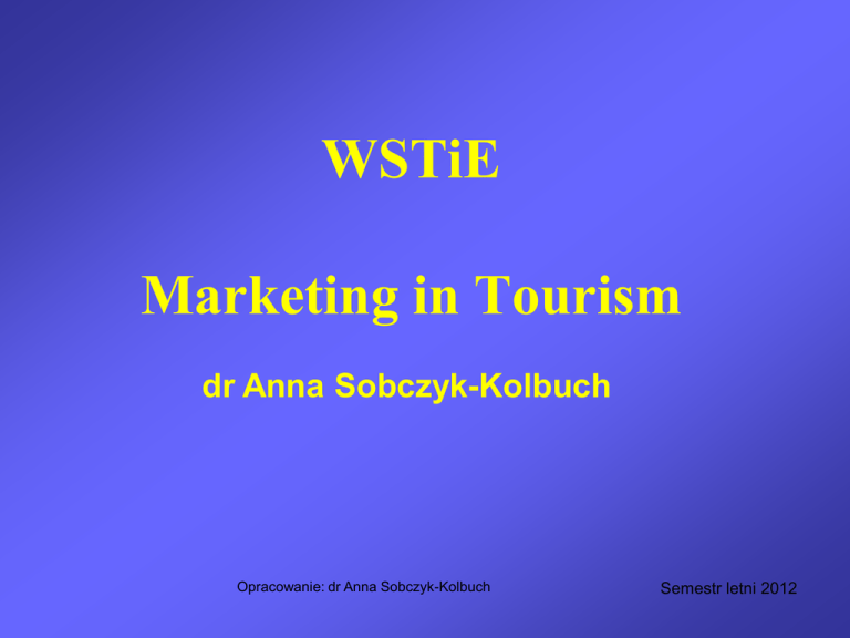 WSTiE Marketing in Tourism dr Anna Sobczyk-Kolbuch Opracowanie: dr Anna Sobczyk-Kolbuch Semestr letni 2012 1. 2. 3. 4. AGENDA Marketing – the essence and features. Clasical and modern concepts of marketing Evolution of enterprises` activities on the market – the origin of marketing concepts Concepts of marketing mix – 4P, 5P, 4C Marketing conditions in different market sectors (industry, consumers, service marketing) – green marketing, marketing in tourism as a service concepts Opracowanie: dr Anna Sobczyk-Kolbuch Semestr letni 2012 5. Functions and rules of marketing in tourism 6. Market segments – process of segmentation 7. Marketing research in tourism 8. Product 9. Price 10.Distribution 11.Promotion Discussion – case studies – questions Opracowanie: dr Anna Sobczyk-Kolbuch Semestr letni 2012 Exam rules: 1) Case studies 2) Test Opracowanie: dr Anna Sobczyk-Kolbuch Semestr letni 2012 Main terms connected with marketing Opracowanie: dr Anna Sobczyk-Kolbuch Semestr letni 2012 Marketing – the definition Classical concept: Marketing = the set of activities that deal with the process of selling goods and services, that use specific methods and techniques which influence consumers` (or buyers`) behaviour Opracowanie: dr Anna Sobczyk-Kolbuch Semestr letni 2012 Marketing – the definition Modern concepts: Marketing = the aspiration to make consumers (buyers) the most satisfied because of activities that company presents on the market A satisfied consumer is one of a company`s assets, so knowlegde on his needs, wants and expectations becomes the most important task in modern marketing Opracowanie: dr Anna Sobczyk-Kolbuch Semestr letni 2012 Classical concept (narrow perspective) Marketing means appropriate planning, coordination and controlling all company`s activities on potential and current markets (target markets) Opracowanie: dr Anna Sobczyk-Kolbuch Semestr letni 2012 Classical concept – aspects of marketing a rule (philosophical aspect) = according to that rule target market (consumers) is the most important assets of a company / a point of departure for marketing strategies/ a regular activity with a set of tools (tool aspect) = marketing mix (4P, 5P) a system of decisions (organisational aspect) = improving the companies ability of successful market activity Opracowanie: dr Anna Sobczyk-Kolbuch Semestr letni 2012 Modern concept (wide perspective) Marketing is a social and management process, that helps the individuals and groups of interests (consumers, companies) to gain everything what they want and need, because of exchange of goods and services or values Opracowanie: dr Anna Sobczyk-Kolbuch Semestr letni 2012 Important issues of marketing buyer/consumer satisfaction product (wide perspective) company (wide perspective) = for-profit and non-profit organisations American Marketing Assosiation (AMA definition): Marketing is the activity, set of institutions, and processes for creating, communicating, delivering and exchanging offerings that have value for customers, clients, partners and society at large (Approved October 2007) Opracowanie: dr Anna Sobczyk-Kolbuch Semestr letni 2012 Elements of organisations and market (micro and makro environment) versus marketing Opracowanie: dr Anna Sobczyk-Kolbuch Semestr letni 2012 Fields of marketing in tourism = the knowledge on rules, methods and techniques concerning decision making process and marketing activities between a company (organisation) and its current and potential customers, especially like: Opracowanie: dr Anna Sobczyk-Kolbuch Semestr letni 2012 consumer behaviour marketing research market segmentation product policy price policy distribution policy promotion policy Opracowanie: dr Anna Sobczyk-Kolbuch Semestr letni 2012 ORIGIN of marketing Evolution of companies concepts and attitudeds towards target markets Production orientation (manufacturer market) Selling orientation (distribution) Marketing orientation(consumer market) Strategic marketing orientation Partnership marketing orientation Social marketing orientation Opracowanie: dr Anna Sobczyk-Kolbuch Semestr letni 2012 MARKETING MIX • enterpreneur/company point of view 4P (Product, Price, Place, Promotion) 5P (Product, Price, Place, Promotion, People) • consumer/household point of view 4C (Consumer, Cost, Convenience, Communication) Opracowanie: dr Anna Sobczyk-Kolbuch Semestr letni 2012 MARKETING MIX (4P) PRODUCT assortment quality pattern features brand packaging service guarentee PRICE Discount Concession Period of Payment Terms of Credit Opracowanie: dr Anna Sobczyk-Kolbuch PLACE Channels Territorial Range Assortment, Comparison Localisation, Transport PROMOTION Sales Promotion Advertisements Public Relations Direct Marketing Personnel Semestr letni 2012 Segmentation … … is the identification of subsets of buyers within a market who share similar needs and demonstrate similar behaviour Opracowanie: dr Anna Sobczyk-Kolbuch Semestr letni 2012 Segmentation … aims to match GROUPS of PURCHASERS with the same set of needs and behaviour = SEGMENT Opracowanie: dr Anna Sobczyk-Kolbuch Semestr letni 2012 Why Segmentation? - to observe the market (parts of the market are easier to observe) - to adapt strategies to consumer needs and wants - react quickly for environment - ……………………………….. Opracowanie: dr Anna Sobczyk-Kolbuch Semestr letni 2012 FEATURES of potential segment - viable (to know if profit can be made) - accessible - measurable - homogenic Opracowanie: dr Anna Sobczyk-Kolbuch Semestr letni 2012 Criteria of segmentation descriptive – behavioural - geographic (place of living, country/city) - demographic (age, sex, education) - psychographic (lifestyle, beliefs) - socio-cultural (class) Opracowanie: dr Anna Sobczyk-Kolbuch Semestr letni 2012 Dividing the first stage of segmentation process is seperation of the market into its segments Opracowanie: dr Anna Sobczyk-Kolbuch Semestr letni 2012 Targeting … the second stage o