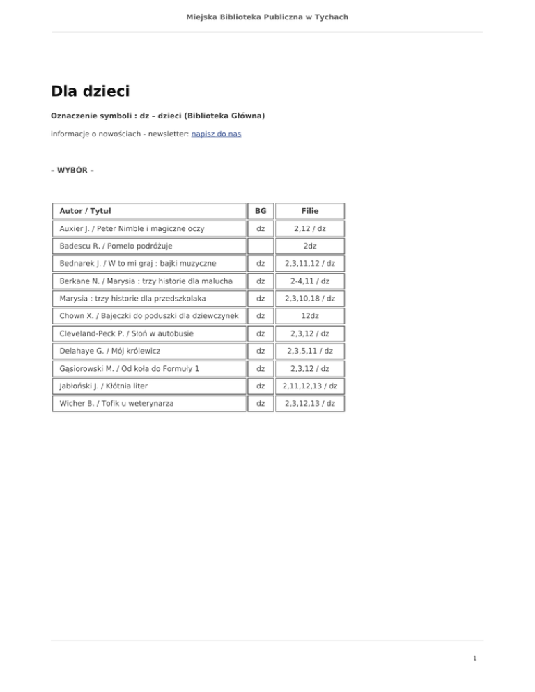 Miejska Biblioteka Publiczna w Tychach Dla dzieci Oznaczenie symboli : dz – dzieci (Biblioteka Główna) informacje o nowościach - newsletter: napisz do nas – WYBÓR – Autor / Tytuł BG Filie Auxier J. / Peter Nimble i magiczne oczy dz 2,12 / dz Badescu R. / Pomelo podróżuje 2dz Bednarek J. / W to mi graj : bajki muzyczne dz 2,3,11,12 / dz Berkane N. / Marysia : trzy historie dla malucha dz 2-4,11 / dz Marysia : trzy historie dla przedszkolaka dz 2,3,10,18 / dz Chown X. / Bajeczki do poduszki dla dziewczynek dz 12dz Cleveland-Peck P. / Słoń w autobusie dz 2,3,12 / dz Delahaye G. / Mój królewicz dz 2,3,5,11 / dz Gąsiorowski M. / Od koła do Formuły 1 dz 2,3,12 / dz Jabłoński J. / Kłótnia liter dz 2,11,12,13 / dz Wicher B. / Tofik u weterynarza dz 2,3,12,13 / dz 1