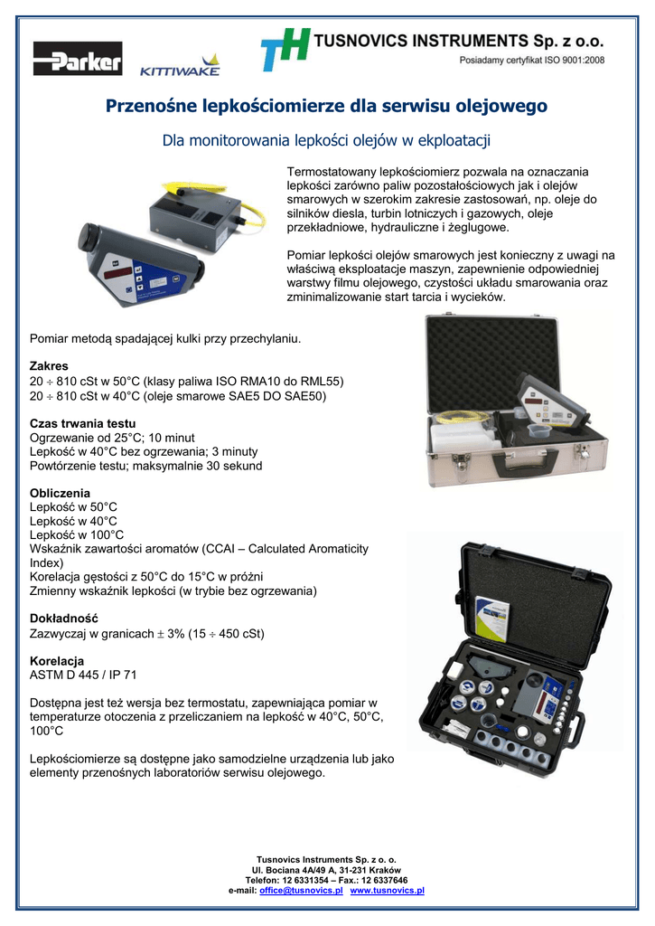 Przenośne lepkościomierze dla serwisu olejowego Dla monitorowania lepkości olejów w ekploatacji Termostatowany lepkościomierz pozwala na oznaczania lepkości zarówno paliw pozostałościowych jak i olejów smarowych w szerokim zakresie zastosowań, np. oleje do silników diesla, turbin lotniczych i gazowych, oleje przekładniowe, hydrauliczne i żeglugowe. Pomiar lepkości olejów smarowych jest konieczny z uwagi na właściwą eksploatacje maszyn, zapewnienie odpowiedniej warstwy filmu olejowego, czystości układu smarowania oraz zminimalizowanie start tarcia i wycieków. Pomiar metodą spadającej kulki przy przechylaniu. Zakres 20 810 cSt w 50°C (klasy paliwa ISO RMA10 do RML55) 20 810 cSt w 40°C (oleje smarowe SAE5 DO SAE50) Czas trwania testu Ogrzewanie od 25°C; 10 minut Lepkość w 40°C bez ogrzewania; 3 minuty Powtórzenie testu; maksymalnie 30 sekund Obliczenia Lepkość w 50°C Lepkość w 40°C Lepkość w 100°C Wskaźnik zawartości aromatów (CCAI – Calculated Aromaticity Index) Korelacja gęstości z 50°C do 15°C w próżni Zmienny wskaźnik lepkości (w trybie bez ogrzewania) Dokładność Zazwyczaj w granicach 3% (15 450 cSt) Korelacja ASTM D 445 / IP 71 Dostępna jest też wersja bez termostatu, zapewniająca pomiar w temperaturze otoczenia z przeliczaniem na lepkość w 40°C, 50°C, 100°C Lepkościomierze są dostępne jako samodzielne urządzenia lub jako elementy przenośnych laboratoriów serwisu olejowego. Tusnovics Instruments Sp. z o. o. Ul. Bociana 4A/49 A, 31-231 Kraków Telefon: 12 6331354 – Fax.: 12 6337646 e-mail: [email protected] www.tusnovics.pl
