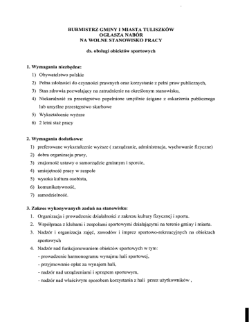 BURMISTRZ GNIINY I MIASTA TULISZKOW OGLASZA NABOR NA WOLNE STANOWISKO PRACY ds. obslugi obiekt6w sportowych 1. Wymagania niezbedne: 1) Obywatelstwo polskie 2) Pelna zdolnoici do czynnoici prawnych oraz korzystanie z pelni praw publicznych, 3) Stan zdrowia pozwalajqcy na zatrudnienie na okreSlonym stanowisku, 4) NiekaralnoSC za przestqpstwo popelnione umyilnie Scigane z oskarzenia publicznego lub umyslne przestqpstwo skarbowe 5) Wyksztalcenie wyzsze 6) 2 letni staz pracy 2. Wymagania dodatkowe: 1) preferowane wyksztalcenie wyzsze ( zarzqdzanie, administracja, wychowanie fizyczne) 2) dobra organizacja pracy, 3) znajomoSC ustawy o samorzqdzie gminnym i sporcie, 4) umiejqtnoSC pracy w zespole 5) wysoka kultura osobista, 6) komunikatywnosC, 7) samodzielnoSC. 3. Zakres wykonywanych zadan na stanowisku: 1. Organizacja i prowadzenie dzialalnoSci z zakresu kultury fizycznej i sportu. 2. Wspolpraca z klubami i zespolami sportowymi dzialajqcymi na terenie gminy i miasta. 3. Nadzor i organizacja zajqC, zawodow i imprez sportowo-rekreacyjnych na obiektach sportowych 4. Nadzor nad funkcjonowaniem obiektow sportowych w tym: - prowadzenie harmonogramu wynajmu hali sportowej , - przyjmowanie oplat za wynajem hali, - nadzor nad urzqdzeniami i sprzqtem sportowym, - nadzor nad wlaSciwym sposobem korzystania z hali przez uzytkownikow , - organizacja pracy pracownikow gospodarczych i nadz6r nad wlaiciwym jej wykonywaniem, 5. Organizowanie, branie udzialu w organizacji gminnych imprez sportowych i innych, ktore bqdq organizowane na hali, stadionie i orliku. 6. Praca wykonywana bqdzie w godzinach popoludniowych. 4. Wymagane dokumenty: 1) wypelniony kwestionariusz osoby ubiegajqcej siq o zatrudnienie, 2) zyciorys (CV), 3) list motywacyjny, 4) kserokopia dokurnentu potwierdzajqcego wyksztalcenie, 5) kserokopie dokumentow potwierdzajqcych staz pracy, posiadane kwalifikacje i 7) oiwiadczenie o stanie zdrowia ( w przypadku zatrudnienia kandydat zostanie skierowany na wstqpne badania lekarskie), 8) oswiadczenie kandydata, ze nie by1 skazany prawomocnym wyrokiem sqdu za umyilne przestqpstwo Scigane z oskarzenia publicznego lub umySlne przestqpstwo skarbowe, oraz korzysta z pelni praw publicznych, Wyrnagane dokumenty aplikacyjne nalezy skladaC osobiicie w siedzibie Urzqdu Gminy i Miasta (punkt informacyjny), pocztq elektronicznq na adres: [email protected] w przypadku posiadanych uprawnieli do podpisu elektronicznego lub pocztq na adres urzqdu z dopiskiem: Dotyczy naboru na stanowisko ds. obslugi hali sportowej, kultury fizycznej i sportu w terminie do dnia 25 lutego 2011 r. Aplikacje, kt6re wplynq do Urzqdu Gminy i Miasta po wyzej okreilonym terminie nie bqdq rozpatrywane. Informacja o wyniku naboru bqdzie umieszczana na stronie internetowej Biuletynu Informacji Publicznej (www.bip.tuliszkow.p1 ) oraz na tablicy informacyjnej w Urzqdzie Gminy i Miasta. Wymagane dokumenty aplikacyjne: list motywacyjny, szczegolowe CV (z uwzglqdnieniem dokladnego przebiegu kariery zawodowej), powinny by6 opatrzone klauzulq: Wyrazam zgodq na przetwarzanie moich danych osobowych zawartych w ofercie pracy dla potrzeb niezbqdnych do realizacji procesu rekrutacji zgodnie z ustawq z dnia 29 sierpnia 1997 r. o ochronie danych osobowych ( Dz. U z 2002 r. Nr 101, poz. 9265 z poin. zm.) Tuliszk6w, dnia 14 luty 20 11r.