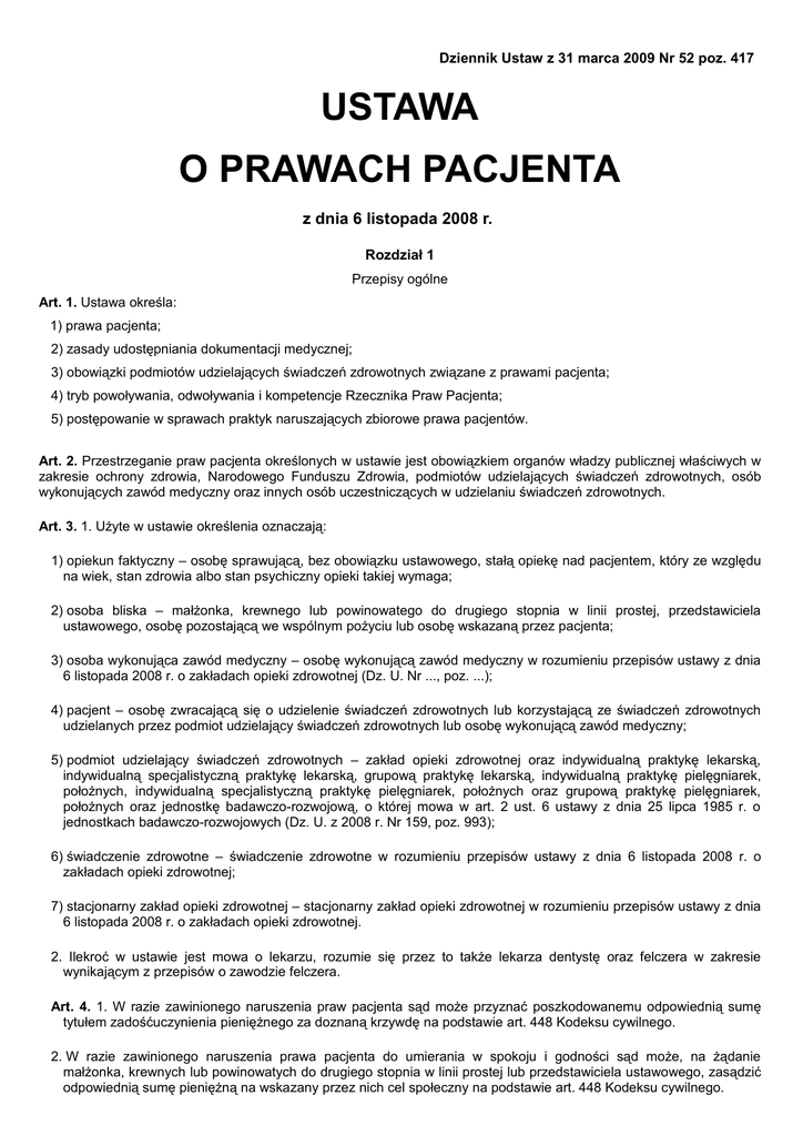 Dziennik Ustaw z 31 marca 2009 Nr 52 poz. 417 USTAWA O PRAWACH PACJENTA z dnia 6 listopada 2008 r. Rozdział 1 Przepisy ogólne Art. 1. Ustawa określa: 1) prawa pacjenta; 2) zasady udostępniania dokumentacji medycznej; 3) obowiązki podmiotów udzielających świadczeń zdrowotnych związane z prawami pacjenta; 4) tryb powoływania, odwoływania i kompetencje Rzecznika Praw Pacjenta; 5) postępowanie w sprawach praktyk naruszających zbiorowe prawa pacjentów. Art. 2. Przestrzeganie praw pacjenta określonych w ustawie jest obowiązkiem organów władzy publicznej właściwych w zakresie ochrony zdrowia, Narodowego Funduszu Zdrowia, podmiotów udzielających świadczeń zdrowotnych, osób wykonujących zawód medyczny oraz innych osób uczestniczących w udzielaniu świadczeń zdrowotnych. Art. 3. 1. Użyte w ustawie określenia oznaczają: 1) opiekun faktyczny – osobę sprawującą, bez obowiązku ustawowego, stałą opiekę nad pacjentem, który ze względu na wiek, stan zdrowia albo stan psychiczny opieki takiej wymaga; 2) osoba bliska – małżonka, krewnego lub powinowatego do drugiego stopnia w linii prostej, przedstawiciela ustawowego, osobę pozostającą we wspólnym pożyciu lub osobę wskazaną przez pacjenta; 3) osoba wykonująca zawód medyczny – osobę wykonującą zawód medyczny w rozumieniu przepisów ustawy z dnia 6 listopada 2008 r. o zakładach opieki zdrowotnej (Dz. U. Nr ..., poz. ...); 4) pacjent – osobę zwracającą się o udzielenie świadczeń zdrowotnych lub korzystającą ze świadczeń zdrowotnych udzielanych przez podmiot udzielający świadczeń zdrowotnych lub osobę wykonującą zawód medyczny; 5) podmiot udzielający świadczeń zdrowotnych – zakład opieki zdrowotnej oraz indywidualną praktykę lekarską, indywidualną specjalistyczną praktykę lekarską, grupową praktykę lekarską, indywidualną praktykę pielęgniarek, położnych, indywidualną specjalistyczną praktykę pielęgniarek, położnych oraz grupową praktykę pielęgniarek, położnych oraz jednostkę badawczo-rozwojową, o której mowa w art. 2 ust. 6 ustawy z dnia 25 lipca 1985 r. o jednostkach badawczo-rozwojowych (Dz. U. z 2008 r. Nr 159, poz. 993); 6) świadczenie zdrowotne – świadczenie zdrowotne w rozumieniu przepisów ustawy z dnia 6 listopada 2008 r. o zakładach opieki zdrowotnej; 7) stacjonarny zakład opieki zdrowotnej – stacjonarny zakład opieki zdrowotnej w rozumieniu przepisów ustawy z dnia 6 listopada 2008 r. o zakładach opieki zdrowotnej. 2. Ilekroć w ustawie jest mowa o lekarzu, rozumie się przez to także lekarza dentystę oraz felczera w zakresie wynikającym z przepisów o zawodzie felczera. Art. 4. 1. W razie zawinionego naruszenia praw pacjenta sąd może przyznać poszkodowanemu odpowiednią sumę tytułem zadośćuczynienia pieniężnego za doznaną krzywdę na podstawie art. 448 Kodeksu cywilnego. 2. W razie zawinionego naruszenia prawa pacjenta do umierania w spokoju i godności sąd może, na żądanie małżonka, krewnych lub powinowatych do drugiego stopnia w linii prostej lub przedstawiciela ustawowego, zasądzić odpowiednią sumę pieniężną na wskazany przez nich cel społeczny na podstawie art. 448 Kodeksu cywilnego. 3. Przepisu ust. 1 nie stosuje się do zawinionego naruszenia prawa pacjenta do: 1) przechowywania rzeczy wartościowych w depozycie stacjonarnego zakładu opieki zdrowotnej; 2) informacji o rodzaju i zakresie świadczeń zdrowotnych udzielanych przez podmioty udzielające świadczeń zdrowotnych; 3) dostępu do dokumentacji medycznej dotyczącej jego stanu zdrowia. Art. 5. Kierownik podmiotu udzielającego świadczeń zdrowotnych lub upoważniony przez niego lekarz może ograniczyć korzystanie z praw pacjenta w przypadku wystąpienia zagrożenia epidemicznego lub ze względu na bezpieczeństwo zdrowotne pacjentów, a w przypadku praw, o których mowa w art. 33 ust. 1, także ze względu na możliwości organizacyjne zakładu. Rozdział 2 Prawo pacjenta do świadczeń zdrowotnych Art. 6. 1. Pacjent ma prawo do świadczeń zdrowotnych odpowiadających wymaganiom aktualnej wiedzy medycznej. 2. Pacjent ma prawo, w sytuacji ograniczonych możliwości udzielenia odpowiednich świadczeń zdrowotnych, do przejrzystej, obiektywnej, opartej na kryteriach medycznych, procedury ustalającej kolejność dostępu do tych świadczeń. 3. Pacjent ma prawo żądać, aby udzielający mu świadczeń zdrowotnych: 1) lekarz zasięgnął opinii innego lekarza lub zwołał konsylium lekarskie; 2) pielęgniarka (położna) zasięgnęła opinii innej pielęgniarki (położnej). 4. Lekarz może odmówić zwołania konsylium lekarskiego lub zasięgnięcia opinii innego lekarza, jeżeli uzna, że żądanie, o którym mowa w ust. 3, jest bezzasadne. 5. Żądanie, o którym mowa w ust. 3, oraz odmowę, o której mowa w ust. 4, odnotowuje się w dokumentacji medycznej. 6. Przepisy ust. 4 i 5 stosuje się do pielęgniarki (położnej) w zakresie zasięgania opinii innej pielęgniarki (położnej). Art. 7. 1. Pacjent ma prawo do natychmiastowego udzielenia świadczeń zdrowotnych ze względu na zagrożenie zdrowia lub życia. 2. W przypadku porodu pacjentka ma prawo do uzyskania świadczeń zdrowotnych związanych z porodem. Art. 8. Pacjent ma prawo do świadczeń zdrowotnych udzielanych z należytą starannością przez podmioty udzielające świadczeń zdrowotnych w warunkach odpowiadających określonym w odrębnych przepisach wymaganiom fachowym i sanitarnym. Przy udzielaniu świadczeń zdrowotnych osoby wykonujące zawód medyczny kierują się zasadami etyki zawodowej określonymi przez właściwe samorządy zawodów medycznych. Rozdział 3 Prawo pacjenta do informacji Art. 9. 1. Pacjent ma prawo do informacji o swoim stanie zdrowia. 2. Pacjent, w tym małoletni, który ukończył 16 lat, lub jego ustawowy przedstawiciel mają prawo do uzyskania od lekarza przystępnej informacji o stanie zdrowia pacjenta, rozpoznaniu, proponowanych oraz