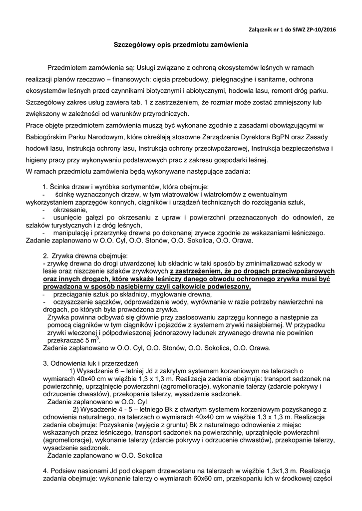 Załącznik nr 1 do SIWZ ZP-10/2016 Szczegółowy opis przedmiotu zamówienia Przedmiotem zamówienia są: Usługi związane z ochroną ekosystemów leśnych w ramach realizacji planów rzeczowo – finansowych: cięcia przebudowy, pielęgnacyjne i sanitarne, ochrona ekosystemów leśnych przed czynnikami biotycznymi i abiotycznymi, hodowla lasu, remont dróg parku. Szczegółowy zakres usług zawiera tab. 1 z zastrzeżeniem, że rozmiar może zostać zmniejszony lub zwiększony w zależności od warunków przyrodniczych. Prace objęte przedmiotem zamówienia muszą być wykonane zgodnie z zasadami obowiązującymi w Babiogórskim Parku Narodowym, które określają stosowne Zarządzenia Dyrektora BgPN oraz Zasady hodowli lasu, Instrukcja ochrony lasu, Instrukcja ochrony przeciwpożarowej, Instrukcja bezpieczeństwa i higieny pracy przy wykonywaniu podstawowych prac z zakresu gospodarki leśnej. W ramach przedmiotu zamówienia będą wykonywane następujące zadania: 1. Ścinka drzew i wyróbka sortymentów, która obejmuje: ścinkę wyznaczonych drzew, w tym wiatrowałów i wiatrołomów z ewentualnym wykorzystaniem zaprzęgów konnych, ciągników i urządzeń technicznych do rozciągania sztuk, - okrzesanie, - usunięcie gałęzi po okrzesaniu z upraw i powierzchni przeznaczonych do odnowień, ze szlaków turystycznych i z dróg leśnych, - manipulację i przerzynkę drewna po dokonanej zrywce zgodnie ze wskazaniami leśniczego. Zadanie zaplanowano w O.O. Cyl, O.O. Stonów, O.O. Sokolica, O.O. Orawa. 2. Zrywka drewna obejmuje: - zrywkę drewna do drogi utwardzonej lub składnic w taki sposób by zminimalizować szkody w lesie oraz niszczenie szlaków zrywkowych z zastrzeżeniem, że po drogach przeciwpożarowych oraz innych drogach, które wskaże leśniczy danego obwodu ochronnego zrywka musi być prowadzona w sposób nasiębierny czyli całkowicie podwieszony, - przeciąganie sztuk po składnicy, mygłowanie drewna, - oczyszczenie sączków, odprowadzenie wody, wyrównanie w razie potrzeby nawierzchni na drogach, po których była prowadzona zrywka. Zrywka powinna odbywać się głównie przy zastosowaniu zaprzęgu konnego a następnie za pomocą ciągników w tym ciągników i pojazdów z systemem zrywki nasiębiernej. W przypadku zrywki wleczonej i półpodwieszonej jednorazowy ładunek zrywanego drewna nie powinien przekraczać 5 m3. Zadanie zaplanowano w O.O. Cyl, O.O. Stonów, O.O. Sokolica, O.O. Orawa. 3. Odnowienia luk i przerzedzeń 1) Wysadzenie 6 – letniej Jd z zakrytym systemem korzeniowym na talerzach o wymiarach 40x40 cm w więźbie 1,3 x 1,3 m. Realizacja zadania obejmuje: transport sadzonek na powierzchnię, uprzątnięcie powierzchni (agromelioracje), wykonanie talerzy (zdarcie pokrywy i odrzucenie chwastów), przekopanie talerzy, wysadzenie sadzonek. Zadanie zaplanowano w O.O. Cyl 2) Wysadzenie 4 - 5 – letniego Bk z otwartym systemem korzeniowym pozyskanego z odnowienia naturalnego, na talerzach o wymiarach 40x40 cm w więźbie 1,3 x 1,3 m. Realizacja zadania obejmuje: Pozyskanie (wyjęcie z gruntu) Bk z naturalnego odnowienia z miejsc wskazanych przez leśniczego, transport sadzonek na powierzchnię, uprzątnięcie powierzchni (agromelioracje), wykonanie talerzy (zdarcie pokrywy i odrzucenie chwastów), przekopanie talerzy, wysadzenie sadzonek. Zadanie zaplanowano w O.O. Sokolica 4. Podsiew nasionami Jd pod okapem drzewostanu na talerzach w więźbie 1,3x1,3 m. Realizacja zadania obejmuje: wykonanie talerzy o wymiarach 60x60 cm, przekopaniu ich w środkowej części na powierzchni 40x40 cm, wysiewie na przekopanej części nasion Jd siewem kupkowym w co najmniej 3 miejscach. Zadanie zaplanowano w O.O. Sokolica 5. Zabezpieczanie upraw i odnowień naturalnych gatunków iglastych i liściastych przed zwierzyną za pomocą repelentu. Zadanie podlegają na nałożeniu repelentu na szczytową części pędu głównego i na końcowych częściach pędów bocznych ostatniego okółka w przypadku gatunków iglastych i na dwóch ostatnich pędach bocznych w przypadku gatunków liściastych. Zabezpieczeniu podlegają drzewka z odnowienia sztucznego i naturalnego. Repelent do zabezpieczeń dostarcza Zleceniodawca. Zadanie zaplanowano w O.O. Cyl, O.O. Stonów, O.O. Sokolica, O.O. Orawa. 6. Pielęgnacja upraw polegająca na wykaszaniu konkurencyjnej roślinności (chwastów). Zadanie polega na wykaszaniu chwastów pomiędzy drzewkami na uprawach za pomocą kosy ręcznej lub sierpa. Zadanie zaplanowano w O.O. Cyl, O.O. Stonów, O.O. Sokolica, O.O. Orawa. 7. Regulacja zagęszczenia drzewek i składu gatunkowego młodników (czyszczenia późne) polegająca na usuwaniu części drzewek w celu zmniejszenia konkurencyjności i zachowania odpowiedniego składu gatunkowego w drzewostanie. Zadanie polega na wycinaniu drzewek na wysokości około 1,3 m (czyszczenia późne w młodnikach iglastych i mieszanych z dużym udziałem gatunków iglastych) w celu ograniczenia możliwości spałowania pozostawionych drzewek przez jeleniowate, chyba że z innych przyczyn koniecznym jest wycięcie drzewka poniżej w/w wysokości. W pozostałych przypadkach drzewka należy wyciąć poniżej ustalonej wysokości w miarę możliwości blisko gruntu. Wycięte drzewka należ ułożyć na gruncie. Drzewka których rozmiary mogły by uszkodzić przy obalaniu młodsze pokolenie będą eliminowane poprzez obrączkowanie polegające na zdjęciu pasa kory o szerokości 0,5m na całym obwodzie. Pas należy ściągnąć na wysokości około 1 metra. Zadanie zaplanowano w O.O. Cyl, O.O. Stonów, O.O. Sokolica, O.O. Orawa. 8. Dodatkowe prace rozliczane godzinowo obejmują: - usuwanie drzew powalonych na szlaki turystyczne i drogi leśne (przerzynka drewna na odcinki, usunięcie pociętego drewna poza teren szlaku), - bieżące naprawy mostków na drogach leśnych (przygotowanie i wymiana drewnianych elementów mostków z materiału powierzonego), - naprawa ogrodzeń upraw i monitoringów leśnych (przygotowan