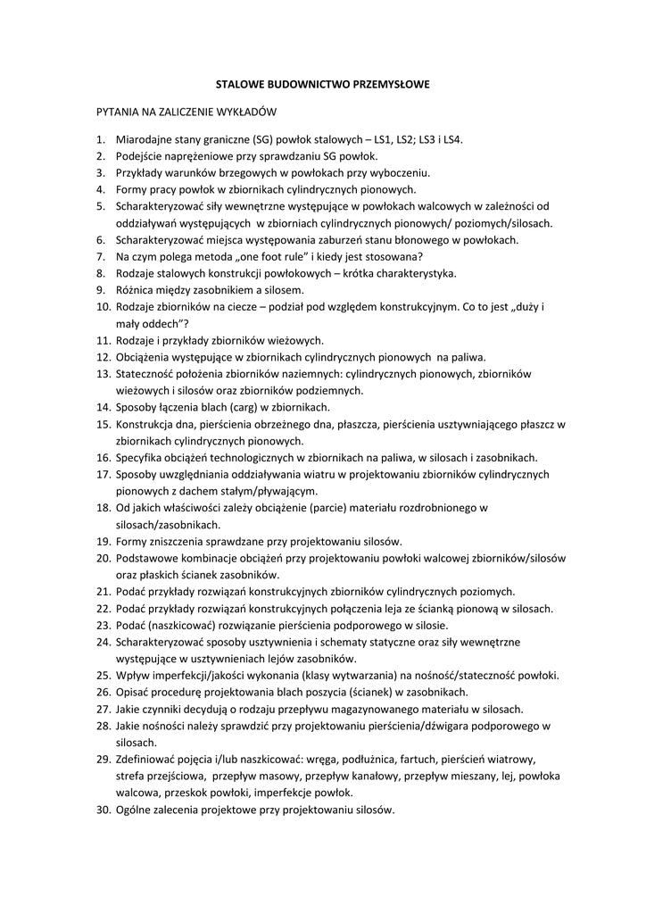 STALOWE BUDOWNICTWO PRZEMYSŁOWE PYTANIA NA ZALICZENIE WYKŁADÓW 1. 2. 3. 4. 5. 6. 7. 8. 9. 10. 11. 12. 13. 14. 15. 16. 17. 18. 19. 20. 21. 22. 23. 24. 25. 26. 27. 28. 29. 30. Miarodajne stany graniczne (SG) powłok stalowych – LS1, LS2; LS3 i LS4. Podejście naprężeniowe przy sprawdzaniu SG powłok. Przykłady warunków brzegowych w powłokach przy wyboczeniu. Formy pracy powłok w zbiornikach cylindrycznych pionowych. Scharakteryzować siły wewnętrzne występujące w powłokach walcowych w zależności od oddziaływań występujących w zbiorniach cylindrycznych pionowych/ poziomych/silosach. Scharakteryzować miejsca występowania zaburzeń stanu błonowego w powłokach. Na czym polega metoda „one foot rule” i kiedy jest stosowana? Rodzaje stalowych konstrukcji powłokowych – krótka charakterystyka. Różnica między zasobnikiem a silosem. Rodzaje zbiorników na ciecze – podział pod względem konstrukcyjnym. Co to jest „duży i mały oddech”? Rodzaje i przykłady zbiorników wieżowych. Obciążenia występujące w zbiornikach cylindrycznych pionowych na paliwa. Stateczność położenia zbiorników naziemnych: cylindrycznych pionowych, zbiorników wieżowych i silosów oraz zbiorników podziemnych. Sposoby łączenia blach (carg) w zbiornikach. Konstrukcja dna, pierścienia obrzeżnego dna, płaszcza, pierścienia usztywniającego płaszcz w zbiornikach cylindrycznych pionowych. Specyfika obciążeń technologicznych w zbiornikach na paliwa, w silosach i zasobnikach. Sposoby uwzględniania oddziaływania wiatru w projektowaniu zbiorników cylindrycznych pionowych z dachem stałym/pływającym. Od jakich właściwości zależy obciążenie (parcie) materiału rozdrobnionego w silosach/zasobnikach. Formy zniszczenia sprawdzane przy projektowaniu silosów. Podstawowe kombinacje obciążeń przy projektowaniu powłoki walcowej zbiorników/silosów oraz płaskich ścianek zasobników. Podać przykłady rozwiązań konstrukcyjnych zbiorników cylindrycznych poziomych. Podać przykłady rozwiązań konstrukcyjnych połączenia leja ze ścianką pionową w silosach. Podać (naszkicować) rozwiązanie pierścienia podporowego w silosie. Scharakteryzować sposoby usztywnienia i schematy statyczne oraz siły wewnętrzne występujące w usztywnieniach lejów zasobników. Wpływ imperfekcji/jakości wykonania (klasy wytwarzania) na nośność/stateczność powłoki. Opisać procedurę projektowania blach poszycia (ścianek) w zasobnikach. Jakie czynniki decydują o rodzaju przepływu magazynowanego materiału w silosach. Jakie nośności należy sprawdzić przy projektowaniu pierścienia/dźwigara podporowego w silosach. Zdefiniować pojęcia i/lub naszkicować: wręga, podłużnica, fartuch, pierścień wiatrowy, strefa przejściowa, przepływ masowy, przepływ kanałowy, przepływ mieszany, lej, powłoka walcowa, przeskok powłoki, imperfekcje powłok. Ogólne zalecenia projektowe przy projektowaniu silosów.