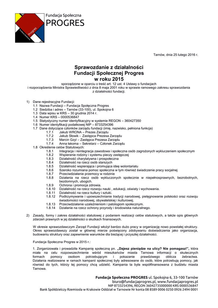 Fundacja Społeczna PROGRES Tarnów, dnia 25 lutego 2016 r. Sprawozdanie z działalności Fundacji Społecznej Progres w roku 2015 sporządzone w oparciu o treść art. 12 ust. 4 Ustawy o fundacjach i rozporządzenia Ministra Sprawiedliwości z dnia 8 maja 2001 roku w sprawie ramowego zakresu sprawozdania z działalności fundacji. 1) Dane rejestracyjne Fundacji: 1.1 Nazwa Fundacji – Fundacja Społęczna Progres 1.2 Siedziba i adres – Tarnów (33-100), ul. Spokojna 6 1.3 Data wpisu w KRS – 30 grudnia 2014 r. 1.4 Numer KRS – 0000536847 1.5 Statystyczny numer identyfikacyjny w systemie REGON – 360427350 1.6 Numer identyfikacji podatkowej NIP – 8733254396 1.7 Dane dotyczące członków zarządu fundacji (imię, nazwisko, pełniona funkcja) 1.7.1 Jakub WRONA – Prezes Zarządu 1.7.2 Jakub Słowik - Zastępca Prezesa Zarządu 1.7.3 Marcin Gzyl – Zastępca Prezesa Zarządu 1.7.4 Anna łakoma – Sekretarz – Członek Zarządu 1.8 Określenie celów Statutowych: 1.8.1 Integracja i reintegracja zawodowa i społeczna osób zagrożonych wykluczeniem społecznym 1.8.2 Wspieranie rodziny i systemu pieczy zastępczej 1.8.3 Działalność charytatywna i prospołeczna 1.8.4 Działalność na rzecz osób starszych 1.8.5 Działalność wspierająca i promująca ideę wolontariatu 1.8.6 Szeroko rozumiana pomoc społeczna w tym również świadczenie pracy socjalnej 1.8.7 Przeciwdziałanie przemocy w rodzinie 1.8.8 Działania na rzecz osób wykluczonych społecznie w niepełnosprawnych, bezrobotnych, bezdomnych, ubogich. 1.8.9 Ochrona i promocja zdrowia. 1.8.10 Działalność na rzecz rozwoju nauki , edukacji, oświaty i wychowania. 1.8.11 Działalność na rzecz kultury i sztuki. 1.8.12 Podtrzymywanie i upowszechnianie tradycji narodowej, pielęgnowanie polskości oraz rozwoju świadomości narodowej, obywatelskiej i kulturowej. 1.8.13 Przeciwdziałanie uzależnieniom i patologiom społecznym. 1.8.14 Działanie na rzecz ochrony przyrody i środowiska naturalnego. 2) Zasady, formy i zakres działalności statutowej z podaniem realizacji celów statutowych, a także opis głównych zdarzeń prawnych w jej działalności o skutkach finansowych. W okresie sprawozdawczym Zarząd Fundacji włożył bardzo dużo pracy w organizację nowo powstałej struktury. Okres sprawozdawszy został w głównej mierze poświęcony zdobywaniu doświadczenia jako organizacja, budowaniu struktury oraz zapewnienie warunków dla bieżącej i przyszłej działalności. Fundacja Społeczna Progres w 2015 r.: 1. Zorganizowała i prowadziła Kampanię społeczną pn. ,,Dajesz pieniądze na ulicy? Nie pomagasz!”, która miała na celu rozpowszechnienie wśród mieszkańców miasta Tarnowa informacji o skutecznych formach pomocy osobom potrzebującym i pokazanie prawdziwego oblicza żebractwa. Działania realizowane w ramach kampanii społecznej były adresowane do osób, które potrzebują pomocy, jak również do tych, którzy tej pomocy chcą udzielić. Kampania ta była współfinansowana z budżetu miasta Tarnowa. Fundacja Społeczna PROGRES ul. Spokojna 6, 33-100 Tarnów [email protected], www.fundacjaprogres.pl NIP 8733254396, REGON 36042735000000 KRS 0000536847 Bank Spółdzielczy Rzemiosła w Krakowie Oddział w Tarnowie Nr konta 08 8589 0006 0250 0926 2494 0001 Fundacja Społeczna PROGRES 2. Zorganizowała wyjazd tarnowskich rodzin zastępczych do Ciężkowic w ramach Dnia Rodzicielstwa Zastępczego, gdzie rodziny mogły zapoznać się z ekspozycją w Muzeum Przyrodniczym w Ciężkowicach, zwiedzić rezerwat ,,Skamieniałe Miasto” oraz integrować się przy wspólnym grillowaniu. Wyjazd ten był okazją, aby podziękować wszystkim tarnowskim rodzicom zastępczym za poświęcenie i trud, jaki wkładają każdego dnia w wychowanie dzieci pokrzywdzonych przez los. Powyższa inicjatywa była kontynuacją realizowanego przez Miejski Ośrodek Pomocy Społecznej w Tarnowie projektu z 2014 r. pn. „Jaki kolor serca masz. Czy możesz mi je dać?”, który miał na celu promowanie idei rodzicielstwa zastępczego. 3. Zorganizowała i przeprowadziła wakacyjne warsztaty dla młodzieży z rodzin zastępczych z terenu miasta Tarnowa w ramach projektu pn. ,,Będę mistrzem!’’. Celem, którego było przede wszystkim korygowanie agresywnych zachowań wśród młodzieży, nabycie umiejętności radzenia sobie z emocjami, nauka i rozwój umiejętności społecznych, propagowanie alternatywnych form spędzania czasu wolnego. Projekt ten był współfinansowany ze środków programu Funduszu Inicjatyw Obywatelskich - Małopolska Lokalnie. 4. W partnerstwie z Miejskim Ośrodkiem Pomocy Społecznej w Tarnowie oraz Stowarzyszeniem ,,Kropla Słońca” kampanię pn. „Biała Wstążka”, która miała na celu walkę z przemocą wobec kobiet oraz wspieranie działań na rzecz jej przeciwdziałania. Kampania ta była również protestem przeciwko dyskryminacji wynikających z uwarunkowań historycznych, środowiskowych i społecznych. W ramach tych działań odbyły się m.in. warsztaty psychologiczne ,,ŚwiadkaMOC by przemóc przemoc", happening antyprzemocowy w formie ,,Marszu PrzeMÓC PrzeMOC’’, konferencja ,,Rodzina wolna od przemocy". 5. Była inicjatorem i głównym organizatorem wspólnego mieszkańców miasta śpiewania kolęd pn. Smakowanie Świąt” Akcja wpisywała się w jarmark świąteczny. W organizację imprezy włączyły się Muzeum Okręgowe w Tarnowie, Teatr im. L. Solskiego w Tarnowie, tarnowscy restauratorzy oraz osobiście Prezydent Miasta – Pan Roman Ciepiela, który wręczał osobiście śpiewniki i wspólnie z zebranymi uczestniczył w śpiewaniu kolęd. 6. We współpracy z Zarządem Okręgowym Polskiego Związku Łowieckiego w Tarnowie wzięliśmy udział w organizacji konkursu kulinarnego dla uczniów szkól gastronomicznych pn. „Dzikie Smaki” 3) Informacja o prowadzonej działalności gospodarczej według wpisu do rejestru przedsiębiorców Krajowego Rejestru Sądowego Fundacja może