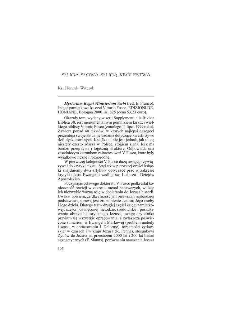 SŁUGA SŁOWA SŁUGĄ KRÓLESTWA Ks. Henryk Witczyk
