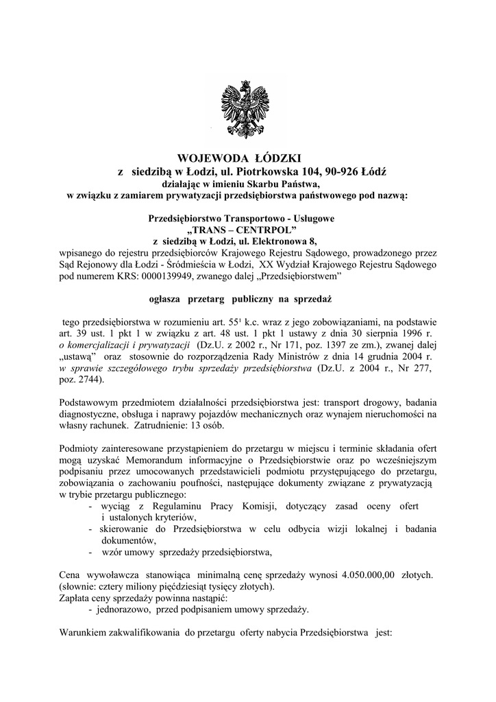 WOJEWODA ŁÓDZKI z siedzibą w Łodzi, ul. Piotrkowska 104, 90-926 Łódź działając w imieniu Skarbu Państwa, w związku z zamiarem prywatyzacji przedsiębiorstwa państwowego pod nazwą: Przedsiębiorstwo Transportowo - Usługowe „TRANS – CENTRPOL” z siedzibą w Łodzi, ul. Elektronowa 8, wpisanego do rejestru przedsiębiorców Krajowego Rejestru Sądowego, prowadzonego przez Sąd Rejonowy dla Łodzi - Śródmieścia w Łodzi, XX Wydział Krajowego Rejestru Sądowego pod numerem KRS: 0000139949, zwanego dalej „Przedsiębiorstwem” ogłasza przetarg publiczny na sprzedaż tego przedsiębiorstwa w rozumieniu art. 55¹ k.c. wraz z jego zobowiązaniami, na podstawie art. 39 ust. 1 pkt 1 w związku z art. 48 ust. 1 pkt 1 ustawy z dnia 30 sierpnia 1996 r. o komercjalizacji i prywatyzacji (Dz.U. z 2002 r., Nr 171, poz. 1397 ze zm.), zwanej dalej „ustawą” oraz stosownie do rozporządzenia Rady Ministrów z dnia 14 grudnia 2004 r. w sprawie szczegółowego trybu sprzedaży przedsiębiorstwa (Dz.U. z 2004 r., Nr 277, poz. 2744). Podstawowym przedmiotem działalności przedsiębiorstwa jest: transport drogowy, badania diagnostyczne, obsługa i naprawy pojazdów mechanicznych oraz wynajem nieruchomości na własny rachunek. Zatrudnienie: 13 osób. Podmioty zainteresowane przystąpieniem do przetargu w miejscu i terminie składania ofert mogą uzyskać Memorandum informacyjne o Przedsiębiorstwie oraz po wcześniejszym podpisaniu przez umocowanych przedstawicieli podmiotu przystępującego do przetargu, zobowiązania o zachowaniu poufności, następujące dokumenty związane z prywatyzacją w trybie przetargu publicznego: - wyciąg z Regulaminu Pracy Komisji, dotyczący zasad oceny ofert i ustalonych kryteriów, - skierowanie do Przedsiębiorstwa w celu odbycia wizji lokalnej i badania dokumentów, - wzór umowy sprzedaży przedsiębiorstwa, Cena wywoławcza stanowiąca minimalną cenę sprzedaży wynosi 4.050.000,00 złotych. (słownie: cztery miliony pięćdziesiąt tysięcy złotych). Zapłata ceny sprzedaży powinna nastąpić: - jednorazowo, przed podpisaniem umowy sprzedaży. Warunkiem zakwalifikowania do przetargu oferty nabycia Przedsiębiorstwa jest: - określenie źródeł finansowania zapłaty ceny zakupu przedsiębiorstwa oraz wykonania pozostałych zobowiązań prywatyzacyjnych, - podpisanie zobowiązania dotyczącego zawarcia porozumienia socjalnego z przedstawicielami pracowników w sprawie gospodarowania środkami funduszu świadczeń socjalnych w terminie 14 dni od daty podpisania umowy sprzedaży Przedsiębiorstwa, - parafowanie treści wzoru umowy sprzedaży przedstawionej przez zbywcę. (Po dokonaniu wyboru najkorzystniejszej oferty i jej przyjęciu, koniecznym będzie parafowanie treści umowy sprzedaży przygotowanej zgodnie ze złożoną ofertą. Sprzedający zastrzega możliwość ponownego parafowania treści umowy sprzedaży w przypadku, gdy Minister Skarbu Państwa wniesie uwagi do jej treści. Uwagi te nie będą prowadzić do zmiany warunków złożonej oferty, stanowiących podstawę jej oceny). Oferty zakupu należy składać w formie pisemnej, w języku polskim, bezpośrednio w sekretariacie Wydziału Infrastruktury Łódzkiego Urzędu Wojewódzkiego w Łodzi, ul. Piotrkowska 104, budynek E, pok. 405, tel. 42/664 11 75, w nieprzekraczalnym terminie do 18 października 2010 roku, do godz. 15,00 w zamkniętej kopercie, w formie uniemożliwiającej zapoznanie się z treścią oferty przed jej otwarciem z napisem: „Przetarg na sprzedaż PTU „TRANS-CENTRPOL” z siedzibą w Łodzi. Nie otwierać”. Oferta powinna zawierać: 1. Imię, nazwisko i adres lub nazwę (firmę) i siedzibę oferenta, 2. Podstawowe informacje dotyczące oferenta i charakteru prowadzonej przez niego działalności oraz zdolności finansowej, potwierdzone następującymi dokumentami: - zaświadczenie o wpisaniu do ewidencji działalności gospodarczej lub odpis z rejestru przedsiębiorców, - sprawozdania finansowe za dwa ostatnie lata obrotowe, w zakresie obowiązującym podmiot zgodnie z art. 45 ustawy z dnia 29 września 1994 roku o rachunkowości (Dz.U. z 2009 r., Nr 152, poz. 1223 ze zm.), - zaświadczenie z Zakładu Ubezpieczeń Społecznych o niezaleganiu z płatnościami z tytułu obowiązujących składek (wystawione w okresie trzech miesięcy przed terminem złożenia oferty), - oświadczenie oferenta, że nie toczy się przeciwko niemu postępowanie karne o przestępstwo przeciwko mieniu lub karno - skarbowe, - oświadczenie oferenta, że nie została ogłoszona jego upadłość oraz nie został złożony wniosek o wszczęcie postępowania upadłościowego lub naprawczego, lub wszczęty proces jego likwidacji, lub wydany zakaz prowadzenia działalności gospodarczej, - informacje o źródłach finansowania zakupu Przedsiębiorstwa i realizacji programu inwestycyjnego, wraz z dokumentacją wiarygodności tych źródeł, - inne, istotne według oferenta informacje i dokumenty. 3. Oświadczenie oferenta, że zapoznał się z przedmiotem przetargu i nie wnosi uwag do jego stanu, 4. Oferowaną cenę i sposób płatności, 5. Planowaną wartość i rodzaj nowych inwestycji wraz ze wskazaniem harmonogramu ich realizacji w okresie pierwszych 3 lat obowiązywania umowy. 6. Deklarację dotyczącą liczby i okresu utrzymania miejsc pracy (etatów) Przedsiębiorstwa, 7. Dowód wniesienia wadium, 8. Wskazanie rachunku bankowego, na który ma być zwrócone wadium w razie nieprzyjęcia oferty. 9. Pisemna akceptacja i zaparafowany przez umocowanych przedstawicieli oferenta, wzór umowy sprzedaży przedsiębiorstwa. Wszystkie dokumenty należy złożyć w oryginałach lub kopiach poświadczonych przez notariusza lub osobę uprawnioną do reprezentacji, za zgodność z oryginałami. Oferent może złożyć tylko jedną ofertę. Oferentem nie może być osoba powiązana bezpośrednio lub pośrednio z innym oferentem. Przy wyborze najkorzystniejszej oferty oceniane będą: cena, propoz