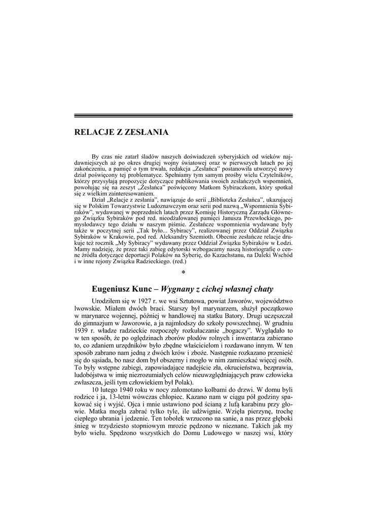 RELACJE Z ZESŁANIA By czas nie zatarł śladów naszych doświadczeń syberyjskich od wieków najdawniejszych aż po okres drugiej wojny światowej oraz w pierwszych latach po jej zakończeniu, a pamięć o tym trwała, redakcja „Zesłańca” postanowiła utworzyć nowy dział poświęcony tej problematyce. Spełniamy tym samym prośby wielu Czytelników, którzy przysyłają propozycje dotyczące publikowania swoich zesłańczych wspomnień, powołując się na zeszyt „Zesłańca” poświęcony Matkom Sybiraczkom, który spotkał się z wielkim zainteresowaniem. Dział „Relacje z zesłania”, nawiązuje do serii „Biblioteka Zesłańca”, ukazującej się w Polskim Towarzystwie Ludoznawczym oraz serii pod nazwą „Wspomnienia Sybiraków”, wydawanej w poprzednich latach przez Komisję Historyczną Zarządu Głównego Związku Sybiraków pod red. nieodżałowanej pamięci Janusza Przewłockiego, pomysłodawcy tego działu w naszym piśmie. Zesłańcze wspomnienia wydawane były także w poczytnej serii „Tak było... Sybiracy”, realizowanej przez Oddział Związku Sybiraków w Krakowie, pod red. Aleksandry Szemioth. Obecnie zesłańcze relacje drukuje też rocznik „My Sybiracy” wydawany przez Oddział Związku Sybiraków w Łodzi. Mamy nadzieję, że przez taki zabieg edytorski wzbogacamy naszą historiografię o cenne źródła dotyczące deportacji Polaków na Syberię, do Kazachstanu, na Daleki Wschód i w inne rejony Związku Radzieckiego. (red.) * Eugeniusz Kunc – Wygnany z cichej własnej chaty Urodziłem się w 1927 r. we wsi Sztutowa, powiat Jaworów, województwo lwowskie. Miałem dwóch braci. Starszy był marynarzem, służył początkowo w marynarce wojennej, później w handlowej na statku Batory. Drugi uczęszczał do gimnazjum w Jaworowie, a ja najmłodszy do szkoły powszechnej. W grudniu 1939 r. władze radzieckie rozpoczęły rozkułaczanie „bogaczy”. Wyglądało to w ten sposób, że po oględzinach zborów płodów rolnych i inwentarza zabierano to, co zdaniem urzędników było zbędne właścicielom i rozdawano innym. W ten sposób zabrano nam jedną z dwóch krów i zboże. Następnie rozkazano przenieść się do sąsiada, bo nasz dom był obszerny i mogło w nim zamieszkać więcej osób. To były wstępne zabiegi, zapowiadające nadejście zła, okrucieństwa, bezprawia, ludobójstwa w imię niezrozumiałych celów nieuwzględniających praw człowieka zwłaszcza, jeśli tym człowiekiem był Polak). 10 lutego 1940 roku w nocy załomotano kolbami do drzwi. W domu byli rodzice i ja, 13-letni wówczas chłopiec. Kazano nam w ciągu pół godziny spakować się i wyjść. Ojca i mnie ustawiono pod ścianą z lufą karabinu przy głowie. Matka mogła zabrać tylko tyle, ile udźwignie. Wzięła pierzynę, trochę ciepłego ubrania i jedzenie. Ten tobołek wrzucono na sanie, a nas przez głęboki śnieg w trzydziesto stopniowym mrozie pędzono w nieznane. Takich jak my było wielu. Spędzono wszystkich do Domu Ludowego w naszej wsi, który 84 RELACJE Z ZESŁANIA napełnił się w krótkim czasie inną niż zwykle muzyką. Płacz małych dzieci, głodnych z zamarzniętymi pieluchami, na wpół odzianych w pośpiechu dorosłych, zrozpaczonych matek, ludzi starych, niedołężnych. Widać było strach o życie młodych mężczyzn. Uformowano nas w kolumnę otoczoną z obu stron wojskiem i popędzono do Jaworowa. Już tej drogi nie mogły przeżyć niektóre niemowlęta, ludzie chorzy i starzy. Mróz, wiatr i śnieg sprzymierzyły się z naszymi wrogami. O pogrzebaniu lub choćby przysypaniu śniegiem i jakby nic się nie stało szło, się dalej. Każdy ludzki odruch rozpaczy, żalu, chęci pochówku groził śmiercią. Na dworzec kolejowy w Jaworowie spędzono bardzo wiele ludzi. Załadowano nas do wagonów. Na stojąco, w ścisłym konwoju zawieziono nas do Lwowa. Każdy jadł to, co miał ze sobą, dzielił się z tymi, którzy nie mieli nic, bo zapomnieli w pośpiechu zabrać. O piciu w ogóle nie było mowy. Można było za to polizać za darmo lód lub zjeść garść śniegu. Po wielogodzinnym staniu w nabitych do kresu możliwości wagonach dotarliśmy do Lwowa. Tu była przesiadka do pociągu towarowego i trwająca trzydzieści dni podróż w głąb Rosji – na Syberię. W bydlęcych wagonach, ściśnięci, zmarznięci, głodni, spragnieni i wyczerpani jechaliśmy ku jeszcze gorszej niedoli. Okna były zakratowane a drzwi zamknięte z zewnątrz. Potrzeby fizjologiczne załatwiało się przez otwór wyrąbany w podłodze, z którego wiał silny, mroźny wiatr. Zakrywano więc kocem tę toaletę i co jakiś czas wyrąbywano w niej znów otwór, bo wszystko natychmiast zamarzało. Na większych stacjach pociąg zatrzymywał się i można było wtedy wysłać 2-3 osoby po wodę, czasem dawano wodnistą zupę. W tym wagonowym świecie byliśmy zdani sami na siebie. Tu przychodziły na świat dzieci, umierali i chorowali ludzie. Tu się sprawdzało człowieczeństwo, rodziła się i gasła wiara i nadzieja. Tu życie ludzkie nic nie kosztowało i nic nie znaczyło. Zmarłych wyrzucało się na śnieg, gdy pociąg jakby celowo przystawał w polu w lesie. Co się ze zwłokami potem działo, nikt nie wiedział. Trupami znaczona była nasza droga krzyżowa do Irkucka. Z Irkucka przewieziono nas do tajgi, do miejscowości Chańża. W innych warunkach podziwiałbym piękno i dzikiej przyrody. Błękitną biel śniegu, uginające się pod ciężarem puszystej pierzyny gałęzie jodeł i świerków, przemykające zwierzęta, niezbyt bojące się człowieka i dym unoszący się z kominów baraków w czystym jak kryształ powietrzu. Moje nozdrza wychwytywały jego zapach drażniący podniebienie i przenoszony do wycieńczonych i wygłodniałych do ostateczności wnętrzności. Wkrótce miałem się przekonać, że zapachy dymu były wytworem mojej wyobraźni. Bo wszystko tam niestety cuchnęło – ludzie i to, co jedli. Baraki były długie, drewni