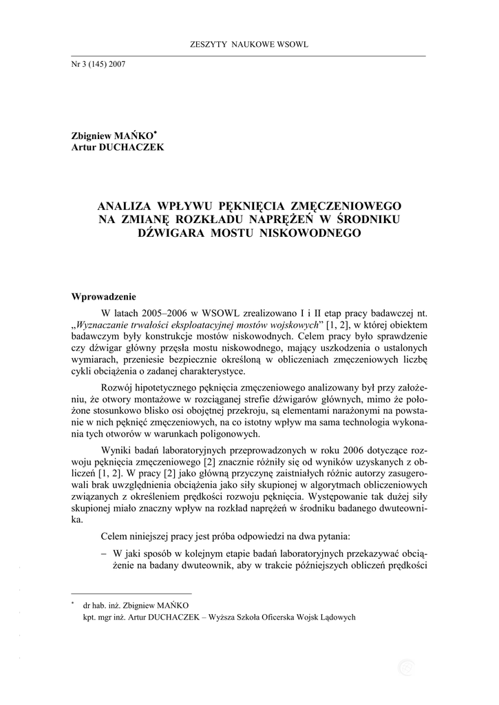ZESZYTY NAUKOWE WSOWL Nr 3 (145) 2007 Zbigniew MAŃKO Artur DUCHACZEK ANALIZA WPŁYWU PĘKNIĘCIA ZMĘCZENIOWEGO NA ZMIANĘ ROZKŁADU NAPRĘŻEŃ W ŚRODNIKU DŹWIGARA MOSTU NISKOWODNEGO Wprowadzenie W latach 2005–2006 w WSOWL zrealizowano I i II etap pracy badawczej nt. „Wyznaczanie trwałości eksploatacyjnej mostów wojskowych” [1, 2], w której obiektem badawczym były konstrukcje mostów niskowodnych. Celem pracy było sprawdzenie czy dźwigar główny przęsła mostu niskowodnego, mający uszkodzenia o ustalonych wymiarach, przeniesie bezpiecznie określoną w obliczeniach zmęczeniowych liczbę cykli obciążenia o zadanej charakterystyce. Rozwój hipotetycznego pęknięcia zmęczeniowego analizowany był przy założeniu, że otwory montażowe w rozciąganej strefie dźwigarów głównych, mimo że położone stosunkowo blisko osi obojętnej przekroju, są elementami narażonymi na powstanie w nich pęknięć zmęczeniowych, na co istotny wpływ ma sama technologia wykonania tych otworów w warunkach poligonowych. Wyniki badań laboratoryjnych przeprowadzonych w roku 2006 dotyczące rozwoju pęknięcia zmęczeniowego [2] znacznie różniły się od wyników uzyskanych z obliczeń [1, 2]. W pracy [2] jako główną przyczynę zaistniałych różnic autorzy zasugerowali brak uwzględnienia obciążenia jako siły skupionej w algorytmach obliczeniowych związanych z określeniem prędkości rozwoju pęknięcia. Występowanie tak dużej siły skupionej miało znaczny wpływ na rozkład naprężeń w środniku badanego dwuteownika. Celem niniejszej pracy jest próba odpowiedzi na dwa pytania: - - W jaki sposób w kolejnym etapie badań laboratoryjnych przekazywać obciążenie na badany dwuteownik, aby w trakcie późniejszych obliczeń prędkości - - - dr hab. inż. Zbigniew MAŃKO kpt. mgr inż. Artur DUCHACZEK – Wyższa Szkoła Oficerska Wojsk Lądowych Zbigniew MAŃKO, Artur DUCHACZEK rozwoju pęknięcia zmęczeniowego można było pomijać wpływ naprężeń prostopadłych do osi głównej badanej belki ? Jak duże zakłócenia w rozkładzie naprężeń w środku dwuteownika powoduje występowanie zarówno samych otworów montażowych jak i pęknięcia propagującego od tychże otworów? 1. Przyjęcie schematu obciążenia w III etapie badań Aby określić sposób obciążenia konstrukcji umożliwiający pominięcie działania siły skupionej na prędkość wzrostu pęknięcia zmęczeniowego propagującego od analizowanego otworu montażowego, wykorzystano linię wpływu momentów zginających w belce swobodnie podpartej. Do wstępnych analiz założono, że w III etapie badań odległość między siłami P2 będzie równa 1,00 m. Po dokonaniu obliczeń oraz zakładając, że dla obu wariantów wartość maksymalnych momentów zginających (w środku rozpiętości teoretycznej belki) powinna być identyczna, przyjęto wartość siły P2 = 200 kN. Aby sprawdzić czy przeprowadzona analiza powinna potwierdzić się w trakcie badań laboratoryjnych przeprowadzono również obliczenia przy wykorzystaniu programu opartego na metodzie elementów skończonych. Na rys. 1 przedstawiono mapę naprężeń normalnych dla obciążenia zastosowanego w trakcie badań w roku 2006, natomiast na rys. 2 te same mapy, ale dla obciążenia proponowanego w trakcie kolejnych badań. a) b) Rys. 1. Rozkład naprężeń normalnych w badanym dwuteowniku w trakcie II etapu badań (w roku 2006): a) naprężenia wzdłuż oraz b) naprężenia prostopadłe, do osi głównej belki - - - - Źródło: Opracowanie własne - 90 ANALIZA WPŁYWU PĘKNIĘCIA ZMĘCZENIOWEGO NA ZMIANĘ ROZKŁADU… a) b) Rys. 2. Rozkład naprężeń normalnych w badanym dwuteowniku w trakcie III etapu badań (w roku 2007): a) naprężenia wzdłuż oraz b) naprężenia prostopadłe do, osi głównej belki Źródło: Opracowanie własne W wyniku przeprowadzonych obliczeń otrzymano wartość naprężeń normalnych (we włóknach rozciąganych) w środku rozpiętości analizowanej belki równej 259,99 MPa dla I wariantu obciążenia oraz 264,17 MPa dla wariantu II. Różnica względna analizowanych wartości wynosiła zaledwie 1,61%, co świadczy o prawidłowo przyjętej wartości obciążenia P2. Z analizy wykresów przedstawionych na rys. 1b widać wyraźny wpływ siły skupionej na wartość naprężeń w strefie środkowej belki, czyli w miejscu występowania potencjalnych otworów montażowych. Z kolei analiza wyników przedstawionych na rys. 2 potwierdza przypuszczenia, że przyjęcie dwóch sił P2 = 100 kN w odległości 1,00 m od siebie powoduje, że nie ulega zmianie maksymalny moment zginający w badanej belce, natomiast w obszarze otworów montażowych, podczas obliczeń dotyczących propagacji pęknięcia zmęczeniowego, może zostać pominięty wpływ naprężeń prostopadłych do osi głównej belki. - - - - Na rys. 3 i 4 przedstawiono wykresy rozkładów naprężeń w środku rozpiętości teoretycznej badanej belki. Opracowując te wykresy, pominięto wartości naprężeń występujące na styku środnika i półki, które wprowadzały miejscowe zakłócenia w rozkładzie naprężeń w danym przekroju. Zdaniem autorów wykresy te potwierdzają jednocześnie słuszność przyjętych założeń, że w przypadku obciążenia siłą 2 × P2 w połowie rozpiętości teoretycznej przęsła otrzymuje się stan naprężeń zbliżony do „czystego zginania”. Umożliwia to ponadto wykorzystanie do określania prędkości rozwoju pęknięcia wyprowadzone w I i II etapie badań [1, 2] wzorów na określenie współczynnika intensywności naprężeń KI. - 91 Zbigniew MAŃKO, Artur DUCHACZEK 400 O b c ią ż e n ie s iłą P O b c ią ż e n ie s iłą 2 x P W ie lo m . ( O b c ią ż e n ie s iłą P ) 300 L in io w y ( O b c ią ż e n ie s iłą 2 x P ) 200 Wartość naprężeń wzdluż osi głównej belki [MPa] 100 0 0 50 100 150 200 250 300 350 400 -1 0 0 -2 0 0 -3 0 0 -4 0 0 O d le g ło ś ć o d g ó r n y c h w ł