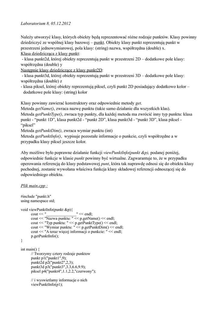 Laboratorium 8, 05.12.2012 Należy utworzyć klasy, których obiekty