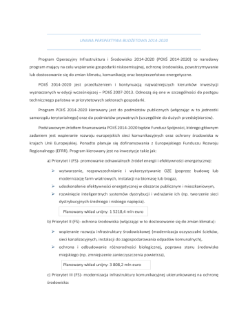 UNIJNA PERSPEKTYWA BUDŻETOWA 2014-2020 Program Operacyjny Infrastruktura i Środowisko 2014-2020 (POIiŚ 2014-2020) to narodowy program mający na celu wspieranie gospodarki niskoemisyjnej, ochronę środowiska, powstrzymywanie lub dostosowanie się do zmian klimatu, komunikację oraz bezpieczeństwo energetyczne. POIiŚ 2014-2020 jest przedłużeniem i kontynuacją najważniejszych kierunków inwestycji wyznaczonych w edycji wcześniejszej – POIiŚ 2007-2013. Odnoszą się one w szczególności do postępu technicznego państwa w priorytetowych sektorach gospodarki. Program POIiŚ 2014-2020 kierowany jest do podmiotów publicznych (włączając w to jednostki samorządu terytorialnego) oraz do podmiotów prywatnych (szczególnie do dużych przedsiębiorstw). Podstawowym źródłem finansowania POIiŚ 2014-2020 będzie Fundusz Spójności, którego głównym zadaniem jest wspieranie rozwoju europejskich sieci komunikacyjnych oraz ochrony środowiska w krajach Unii Europejskiej. Ponadto planuje się dofinansowania z Europejskiego Funduszu Rozwoju Regionalnego (EFRR). Program kierowany jest na inwestycje takie jak: a) Priorytet I (FS)- promowanie odnawialnych źródeł energii i efektywności energetycznej: wytwarzanie, rozpowszechnianie i wykorzystywanie OZE (poprzez budowę lub modernizację farm wiatrowych, instalacji na biomasę lub biogaz, udoskonalenie efektywności energetycznej w obszarze publicznym i mieszkaniowym, rozwinięcie inteligentnych systemów dystrybucji i wdrażanie ich (np. tworzenie sieci dystrybucyjnych średniego i niskiego napięcia). Planowany wkład unijny: 1 5218,4 mln euro b) Priorytet II (FS)- ochrona środowiska (włączając w to dostosowanie się do zmian klimatu): wspieranie rozwoju infrastruktury środowiskowej (modernizacja oczyszczalni ścieków, sieci kanalizacyjnych, instalacji do zagospodarowania odpadów komunalnych), ochrona i odbudowanie różnorodności biologicznej, poprawa stanu środowiska miejskiego (np. zmniejszenie zanieczyszczenia powietrza), Planowany wkład unijny: 3 808,2 mln euro c) Priorytet III (FS)- modernizacja infrastruktury komunikacyjnej ukierunkowanej na ochronę środowiska: modernizacja drogowego i kolejowego zaplecza w sieci TEN-T, niskoemisyjna komunikacja miejska, śródlądowa, morska i intermodalna, zwiększenie bezpieczeństwa w ruchu lotniczym. Planowany wkład unijny: 16 841,3 mln euro. d) Priorytet IV (EFRR) - nasilenie transportowej sieci europejskiej: udoskonalenie przepustowości infrastruktury drogowej (włączając w to obwodnice i trasy wylotowe). Planowany wkład unijny: 3 000,4 mln euro. e) Priorytet V (EFRR) - udoskonalenie infrastruktury bezpieczeństwa energetycznego: rozwinięcie inteligentnych systemów rozprowadzania, gromadzenia i przesyłu gazu ziemnego i energii elektrycznej (np. poprzez rozbudowę sieci przesyłowych i dystrybucyjnych). Planowany wkład unijny: 1 000,0 mln euro. f) Priorytet VI (EFRR)- ochrona dziedzictwa kulturowego Planowany wkład unijny: 497,3 mln euro. g) Priorytet VII (EFRR)- pogłębienie strategicznej infrastruktury ochrony zdrowia Planowany wkład unijny: 508,3 mln euro. h) Priorytet VIII (EFRR)- pomoc techniczna Planowany wkład unijny- 330,0 mln zł. ŚRODKI NFOŚIGW Narodowy Fundusz Ochrony Środowiska i Gospodarki Wodnej stanowi jedno z głównych źródeł polskiego systemu finansowania przedsięwzięć służących ochronie środowiska, wykorzystujący środki krajowe jak i zagraniczne. Na najbliższe lata przewidziane jest finansowanie działań w ramach programu ochrona atmosfery, który podzielony jest na cztery działania priorytetowe: poprawa jakości powietrza, poprawa efektywności energetycznej, wspieranie rozproszonych, odnawialnych źródeł energii oraz system zielonych inwestycji (GIS – Green Investment Scheme). Program Priorytetowy Rodzaje przedsięwzięć Beneficjenci LEMUR – Energooszczędne Budynki Użyteczności Publicznej Projektowanie i budowa lub tylko budowa nowych budynków użyteczności publicznej i zamieszkania zbiorowego. • Podmioty sektora finansów publicznych (bez PJB); • Samorządowe osoby prawne, spółki prawa handlowego, w których JST posiadają 100% udziałów lub akcji i które powołane są do realizacji zadań własnych JST wskazanych w ustawach; • PGL Lasy Państwowe i Parki Narodowe; • Organizacje pozarządowe (w tym fundacje i stowarzyszenia), kościoły i inne związki wyznaniowe oraz kościelne osoby prawne, które realizują zadania publiczne na podstawie odrębnych przepisów Finansowanie Dotacja, pożyczka Program Priorytetowy Dopłaty do kredytów na budowę domów energooszczędnych Rodzaje przedsięwzięć • • • Budowa domu jednorodzinnego; Zakup nowego domu jednorodzinnego; Zakup lokalu mieszkalnego w nowym budynku mieszkalnym wielorodzinnym. Beneficjenci Osoby fizyczne Finansowanie Dotacja na częściową spłatę kapitału kredytu bankowego za pośrednictwem banku, który ma podpisaną umowę z NFOŚiGW Program Priorytetowy Inwestycje energooszczędne w małych i średnich przedsiębiorstwach Inwestycje LEME – działania w zakresie: a) poprawy efektywności energetycznej i/lub zastosowania OZE; b) termomodernizacji budynku/ów i/lub zastosowania OZE. Rodzaje przedsięwzięć Inwestycje Wspomagane - działania inwestycyjne, które nie kwalifikują się, jako Inwestycje LEME, w zakresie: a) poprawy efektywności energetycznej i/lub odnawialnych źródeł energii w wyniku których zostanie osiągnięte min. 20% oszczędności energii; b) termomodernizacji budynku/ów i/lub odnawialnych źródeł energii w wyniku których zostanie osiągnięte min. 30% oszczędności energii. Beneficjenci Prywatne podmioty prawne (przedsiębiorstwa) utworzone na mocy polskiego prawa i działające w Polsce – beneficjent musi spełniać definicję mikroprzedsiębiorstw oraz MSP Finansowanie Dotacja na częściową spłatę kapitału kredytu bankowego za pośrednictwem banku, który ma podpisaną umowę z NFOŚiGW 