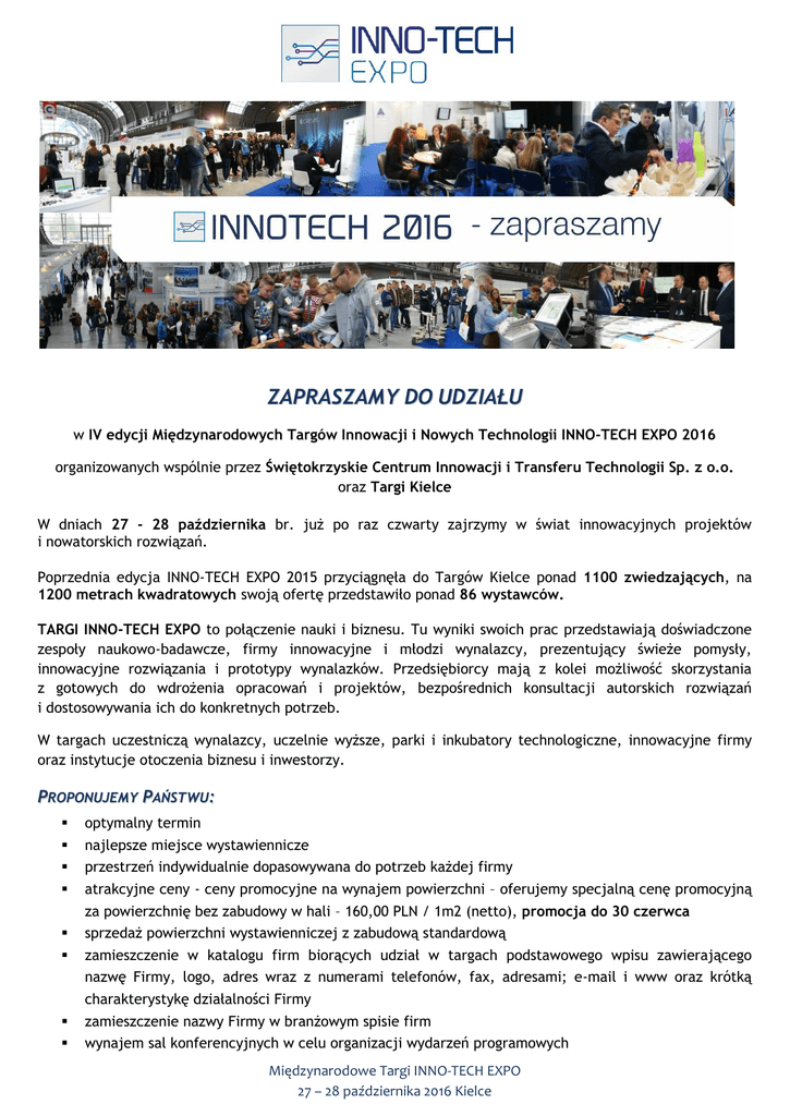 ZAPRASZAMY DO UDZIAŁU w IV edycji Międzynarodowych Targów Innowacji i Nowych Technologii INNO-TECH EXPO 2016 organizowanych wspólnie przez Świętokrzyskie Centrum Innowacji i Transferu Technologii Sp. z o.o. oraz Targi Kielce W dniach 27 - 28 października br. już po raz czwarty zajrzymy w świat innowacyjnych projektów i nowatorskich rozwiązań. Poprzednia edycja INNO-TECH EXPO 2015 przyciągnęła do Targów Kielce ponad 1100 zwiedzających, na 1200 metrach kwadratowych swoją ofertę przedstawiło ponad 86 wystawców. TARGI INNO-TECH EXPO to połączenie nauki i biznesu. Tu wyniki swoich prac przedstawiają doświadczone zespoły naukowo-badawcze, firmy innowacyjne i młodzi wynalazcy, prezentujący świeże pomysły, innowacyjne rozwiązania i prototypy wynalazków. Przedsiębiorcy mają z kolei możliwość skorzystania z gotowych do wdrożenia opracowań i projektów, bezpośrednich konsultacji autorskich rozwiązań i dostosowywania ich do konkretnych potrzeb. W targach uczestniczą wynalazcy, uczelnie wyższe, parki i inkubatory technologiczne, innowacyjne firmy oraz instytucje otoczenia biznesu i inwestorzy. PROPONUJEMY PAŃSTWU: optymalny termin najlepsze miejsce wystawiennicze przestrzeń indywidualnie dopasowywana do potrzeb każdej firmy atrakcyjne ceny - ceny promocyjne na wynajem powierzchni – oferujemy specjalną cenę promocyjną za powierzchnię bez zabudowy w hali – 160,00 PLN / 1m2 (netto), promocja do 30 czerwca sprzedaż powierzchni wystawienniczej z zabudową standardową zamieszczenie w katalogu firm biorących udział w targach podstawowego wpisu zawierającego nazwę Firmy, logo, adres wraz z numerami telefonów, fax, adresami; e-mail i www oraz krótką charakterystykę działalności Firmy zamieszczenie nazwy Firmy w branżowym spisie firm wynajem sal konferencyjnych w celu organizacji wydarzeń programowych Międzynarodowe Targi INNO-TECH EXPO 27 – 28 października 2016 Kielce bezprzewodowy dostęp do internetu (WiFi) miejsce parkingowe na terenie Targów przy hali wystawienniczej pomoc w rezerwacji hotelu zaproszenie dla 2 osób na uroczystą Galę i Bankiet dla wystawców Targów INNO-TECH EXPO oraz zaproszonych gości GWARANTUJEMY: doskonałe warunki do promocji i prezentacji wyników prac badawczych, prototypów i wynalazków oraz innowacyjnych ofert przedsiębiorców spotkania B2B – możliwość nawiązania kontaktów i współpracy biznesowej atrakcyjny i różnorodny program wydarzeń towarzyszących o Konferencja „Badania przemysłowe i prace rozwojowe – prezentacja najlepszych projektów finansowanych ze środków UE” o „Strefa młodych wynalazców” – najlepsi polscy wynalazcy o „Most Startupowy” o „Świętokrzyskie potrafi” – najlepsze innowacyjne świętokrzyskie wynalazki efektywną kampanię reklamową (prezentacje video, ekspozycja wynalazków, ofert, roll-upów, itp.) KORZYŚCI DLA WYSTAWCÓW prezentacja usług i promocja produktów przed szeroką publicznością zapoznanie się z ofertą innych firm i wynalazców budowa rozpoznawalności wśród potencjalnych klientów oraz szerokiej publiczności pozyskanie nowych klientów, utrwalenie wizerunku firmy możliwość nawiązania kontaktu i współpracy z potencjalnymi inwestorami możliwość pozyskania partnerów biznesowych zwiększenie własnej wiedzę z zakresu innowacji, powiązań biznesu z IT Jednym z najważniejszych i najskuteczniejszych elementów promowania na rynku nowej technologii, innowacyjnego produktu lub rozwiązania oraz prototypów produktów jest prezentacja na krajowych i międzynarodowych wystawach wynalazków. Jeśli są Państwo zainteresowani zaprezentowaniem swojej oferty na targach INNO-TECH EXPO w Kielcach, prosimy o kontakt z nami. W przypadku dodatkowych pytań, pozostajemy do Państwa dyspozycji. Katarzyna Chołuj tel. +48 / 539 934 227 e-mail: [email protected] www.targikielce.pl/pl/inno-tech.htm Ilona Frączyk tel. +48 / 539 934 219 e-mail: [email protected] www.targikielce.pl/pl/inno-tech.htm Międzynarodowe Targi INNO-TECH EXPO 27 – 28 października 2016 Kielce PRZYKŁAD ZABUDOWY STANDARDOWEJ Przykład stoiska narożnego w zabudowie standardowej i wyposażeniem dodatkowym. Rodzaj powierzchni Pakiet powierzchnia w pawilonie + stoisko w zabudowie standardowej wraz z wyposażeniem: 1 stół, 4 krzesła, + opłata rejestracyjna m2 Cena promocyjna netto 6 1.910,- PLN 9 2.600,- PLN 12 3.290,- PLN 20 5.130,- PLN 24 6.050- PLN Przykładowe stoisko: 12 m2 "powierzchnia + stoisko w zabudowie standardowej" na warunkach specjalnych Opłata rejestracyjna 300 zł Powierzchnia wystawiennicza 12 m2 * 160 zł = 1.920 zł Zabudowa standardowa 12 m2 * 70 zł = 840 zł Krzesła tapicerowane 4 * 40 zł = 160 zł Stół okrągły 70 zł Suma (ceny netto) 3.290 zł Międzynarodowe Targi INNO-TECH EXPO 27 – 28 października 2016 Kielce